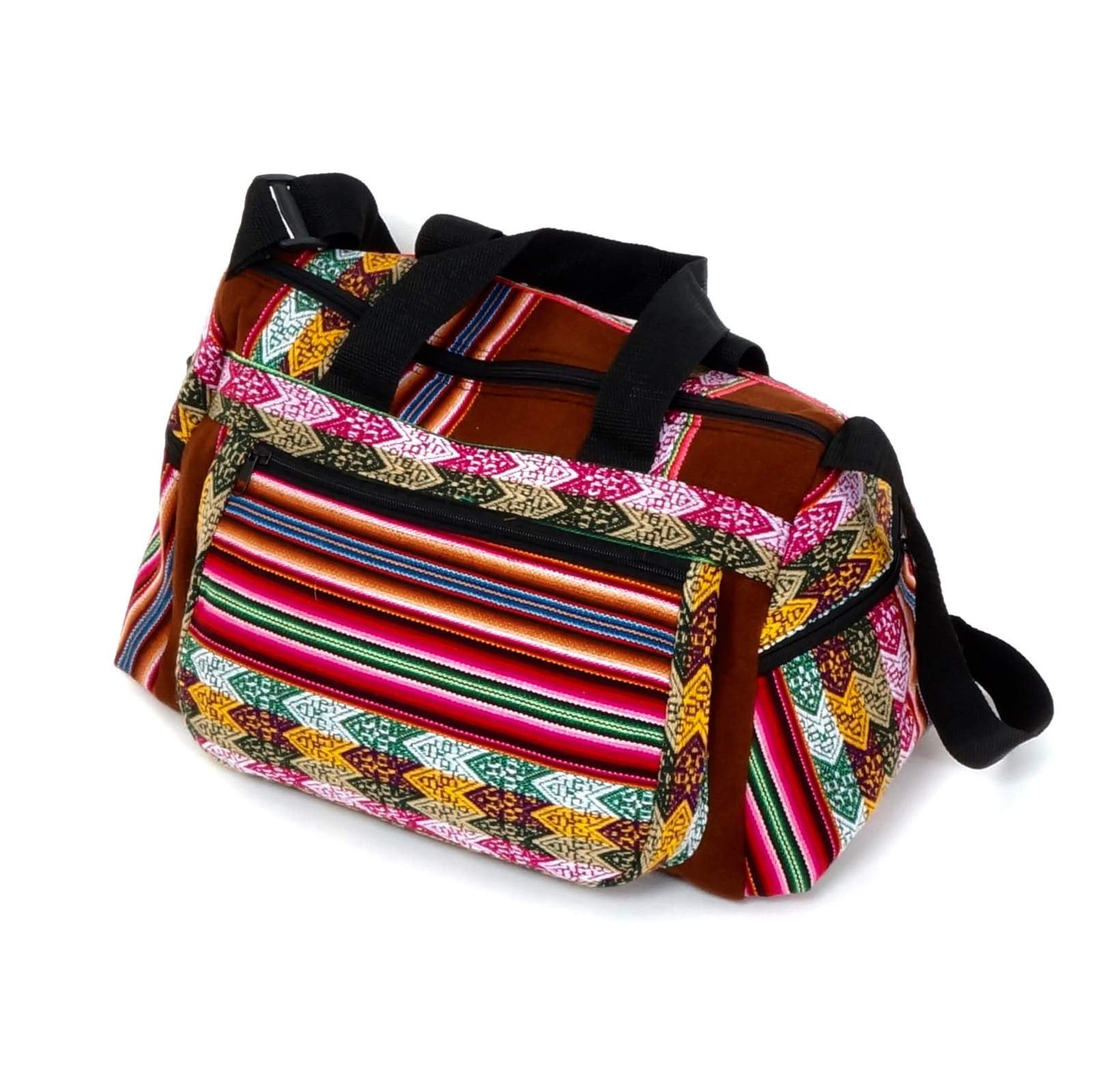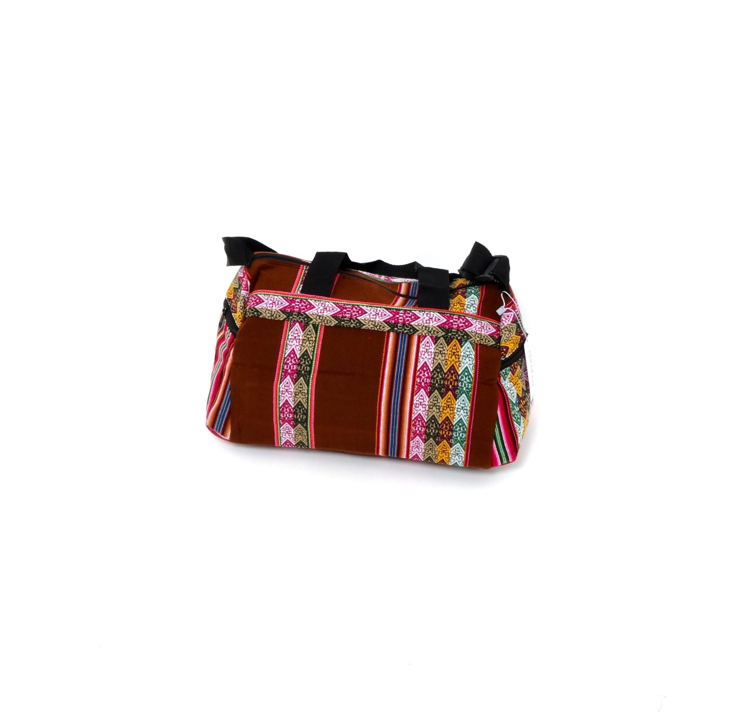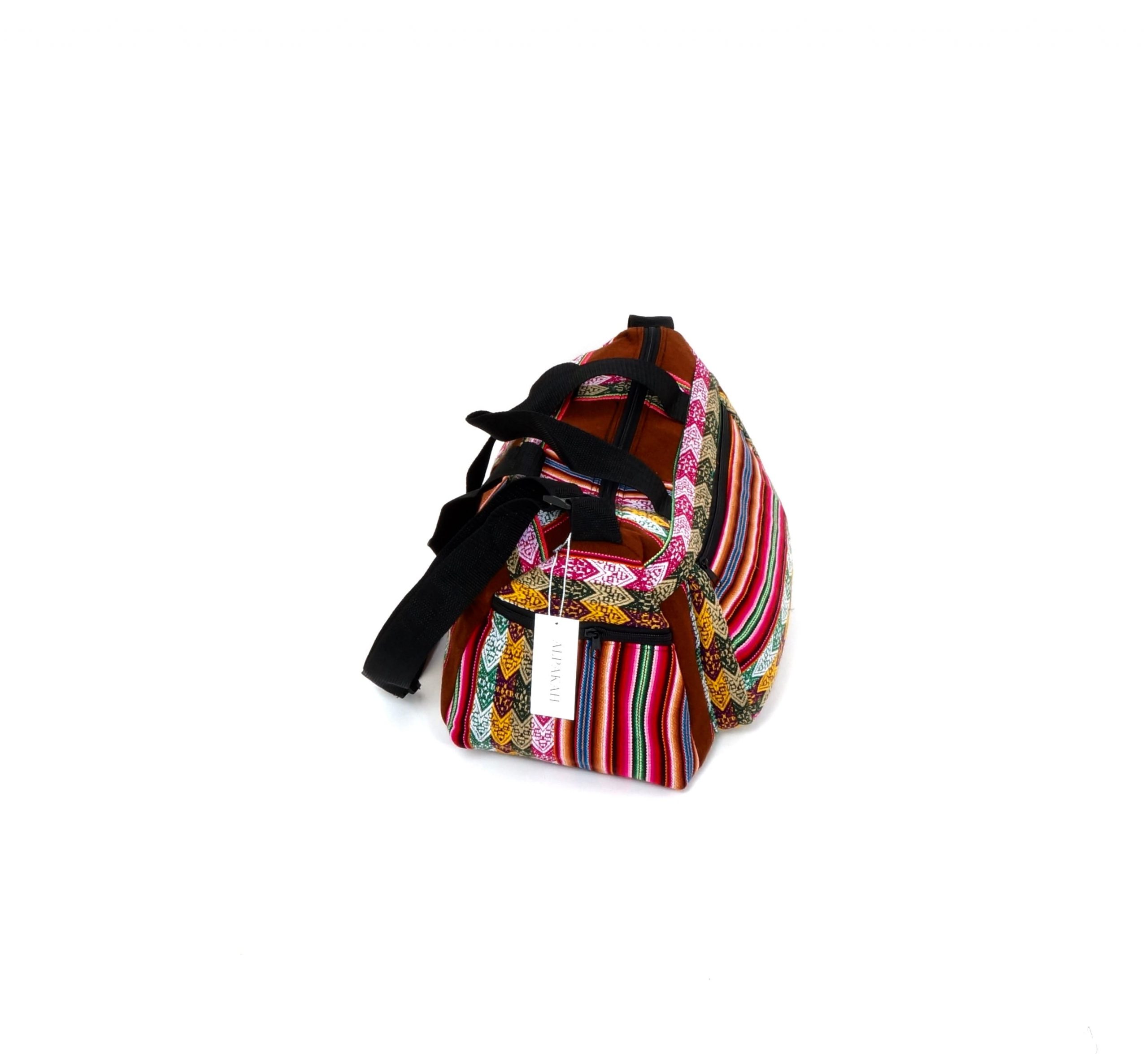 Deze mooie en eigentijdse reistas is alles wat u nodig heeft voor een lange of korte trip. De ruime inhoud is geschikt voor grote hoeveelheden van kleding/overige artikelen en tegelijkertijd blijven uw spullen in goede conditie. Ook heeft deze prachtige reistas drie ruime zijvakken die gesloten kunnen worden door middel van een rits. Deze reistas is gemakkelijk te dragen vanwege zijn speciale schouderband en handvaten. Hij is handgemaakt door Peruaanse ambachtslieden met duurzame en echte Peruaanse stof (Manto Andino).