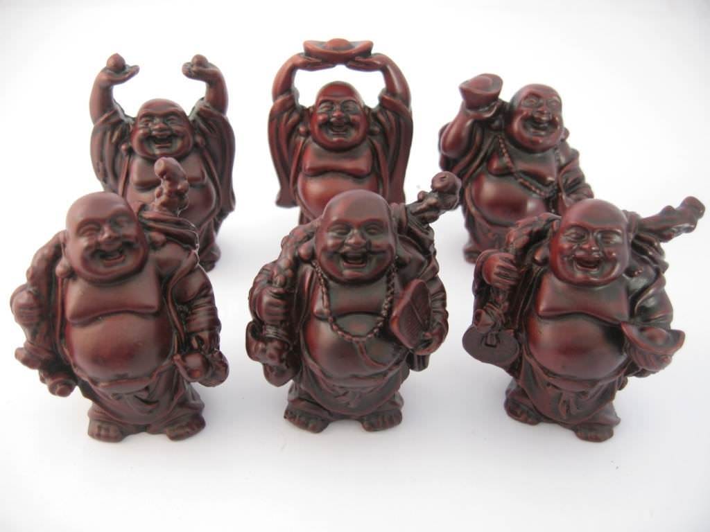 Leuke set van 6 verschillende staande boeddha`s. Kleur: Rood.