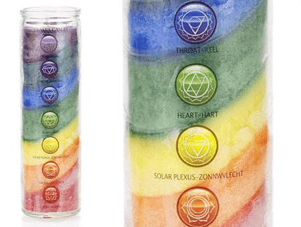 Prachtige chakra kaars met wel 100 branduren. Iedere kleur bevat een eigen chakrasteentje. Vrij van petrochemische componenten en een zuivere stabiele vlam.