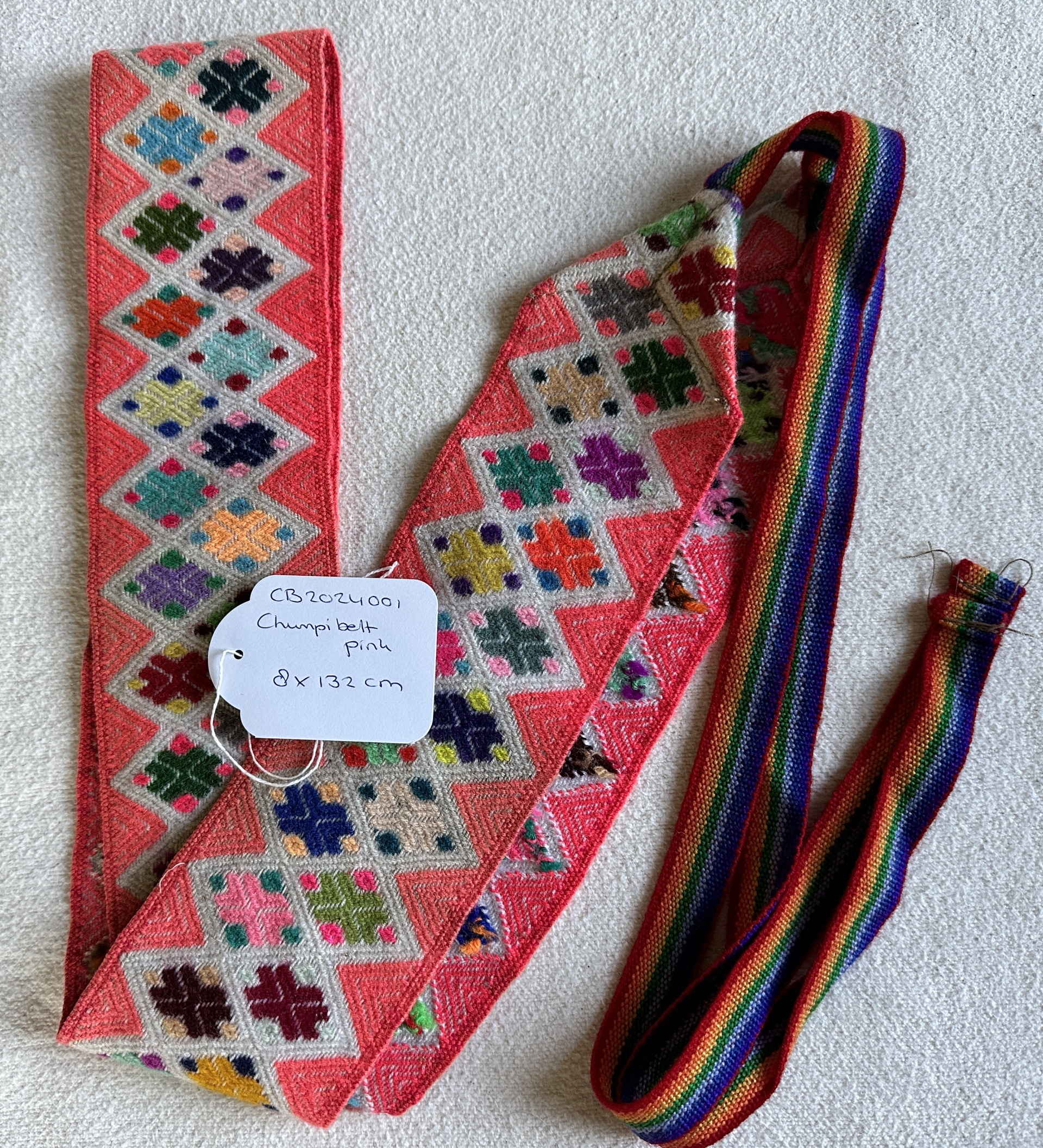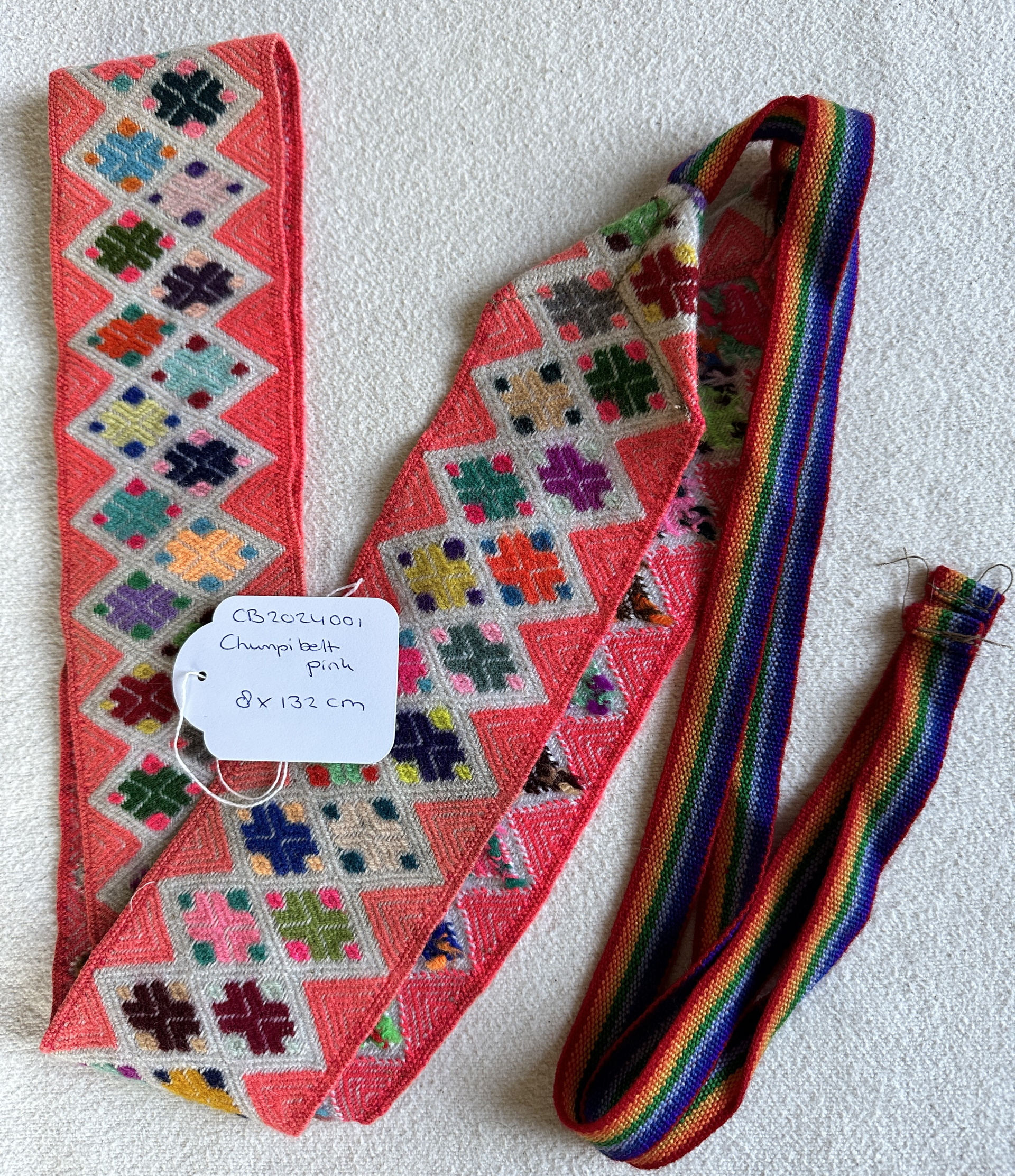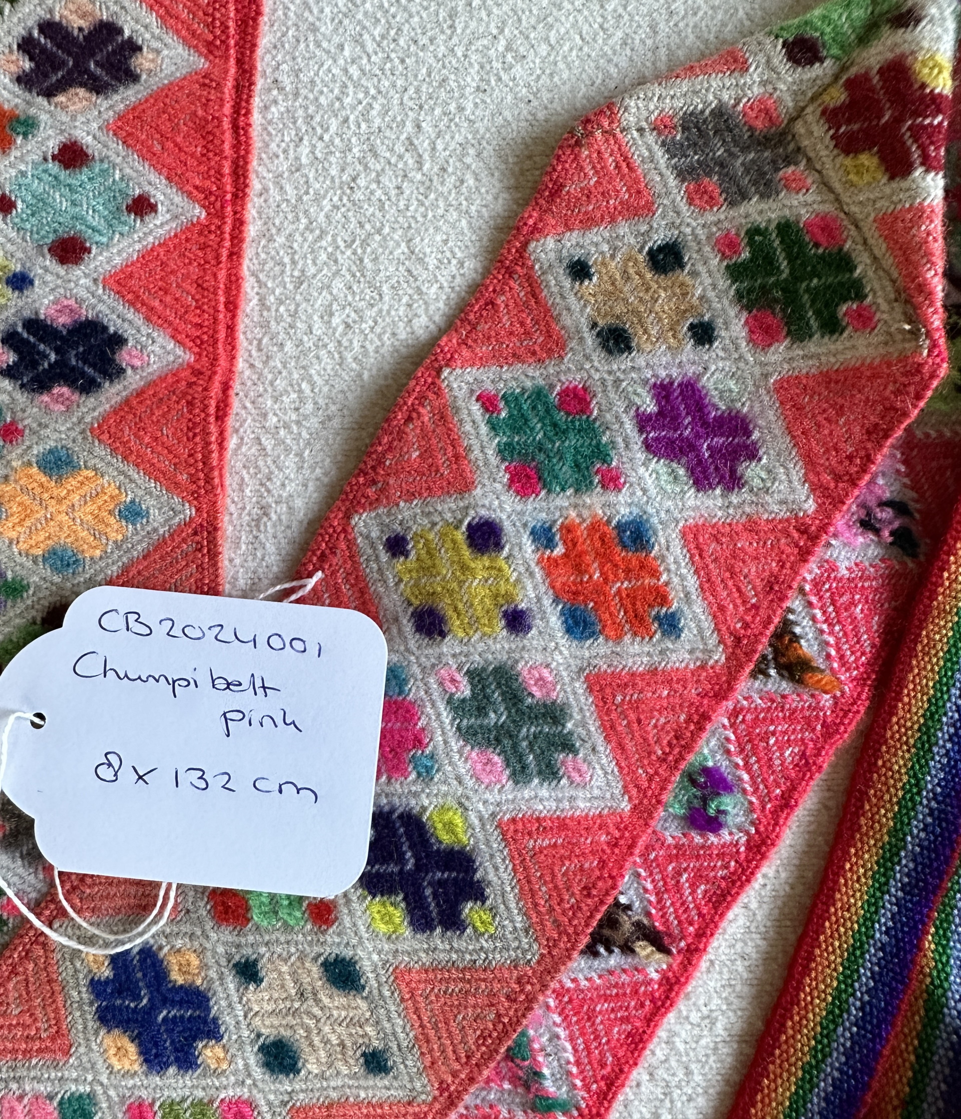 Deze handgeweven roze chumpi gordel is geïnspireerd op de sjamanistische traditie van de Andes. Zo staat deze in verbinding met het hartchakra.