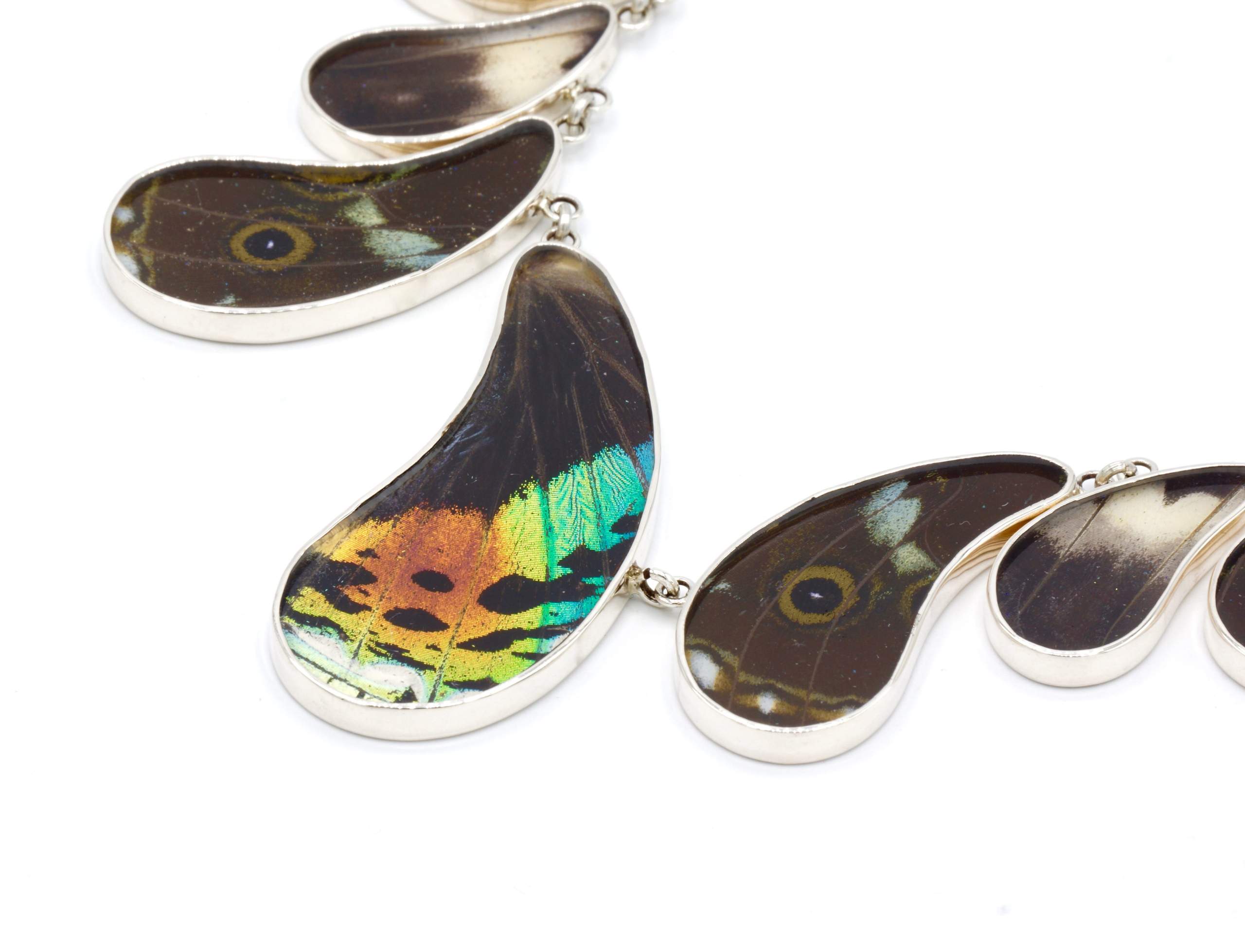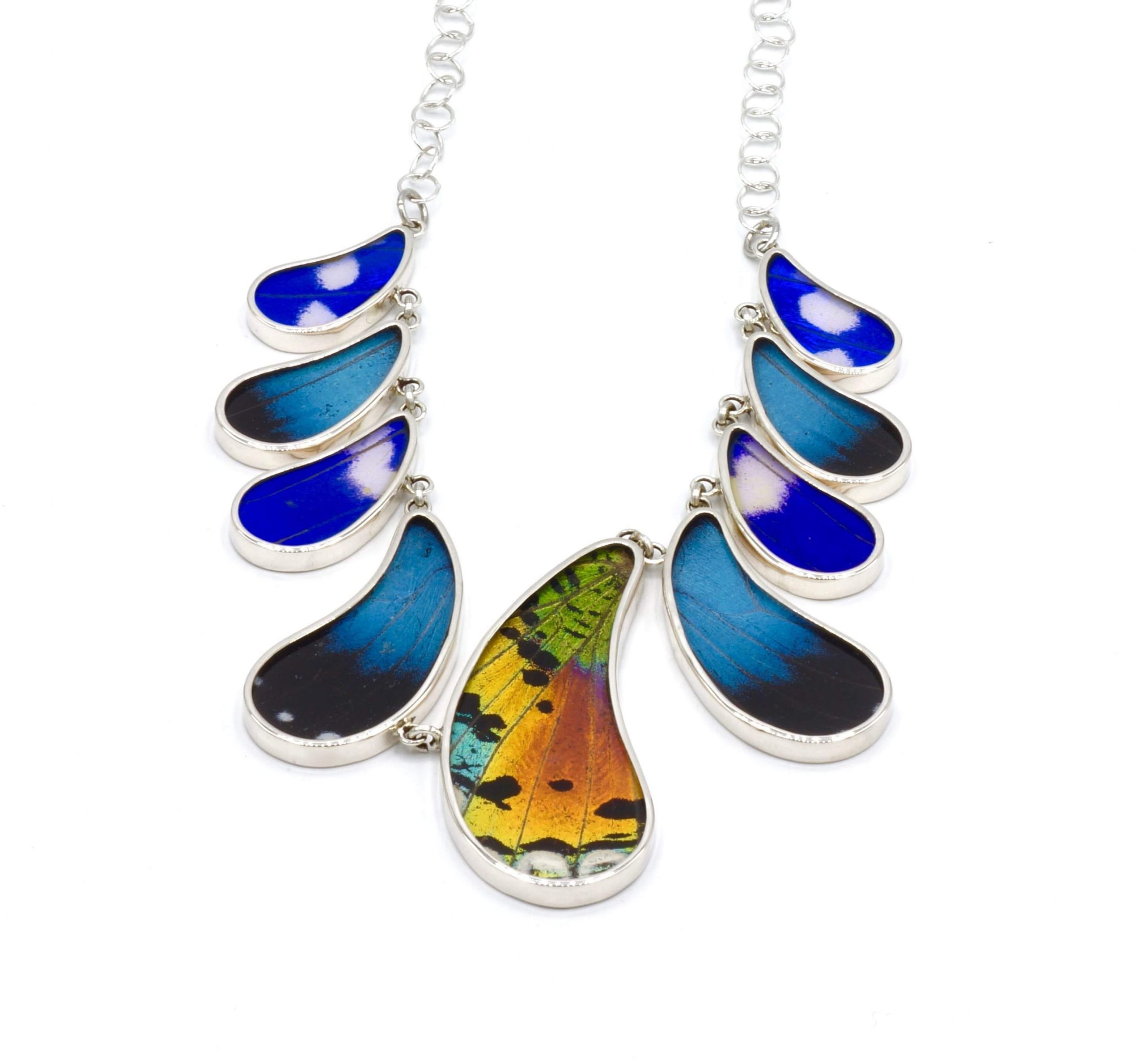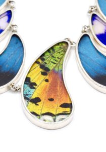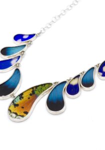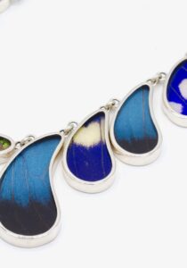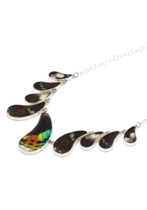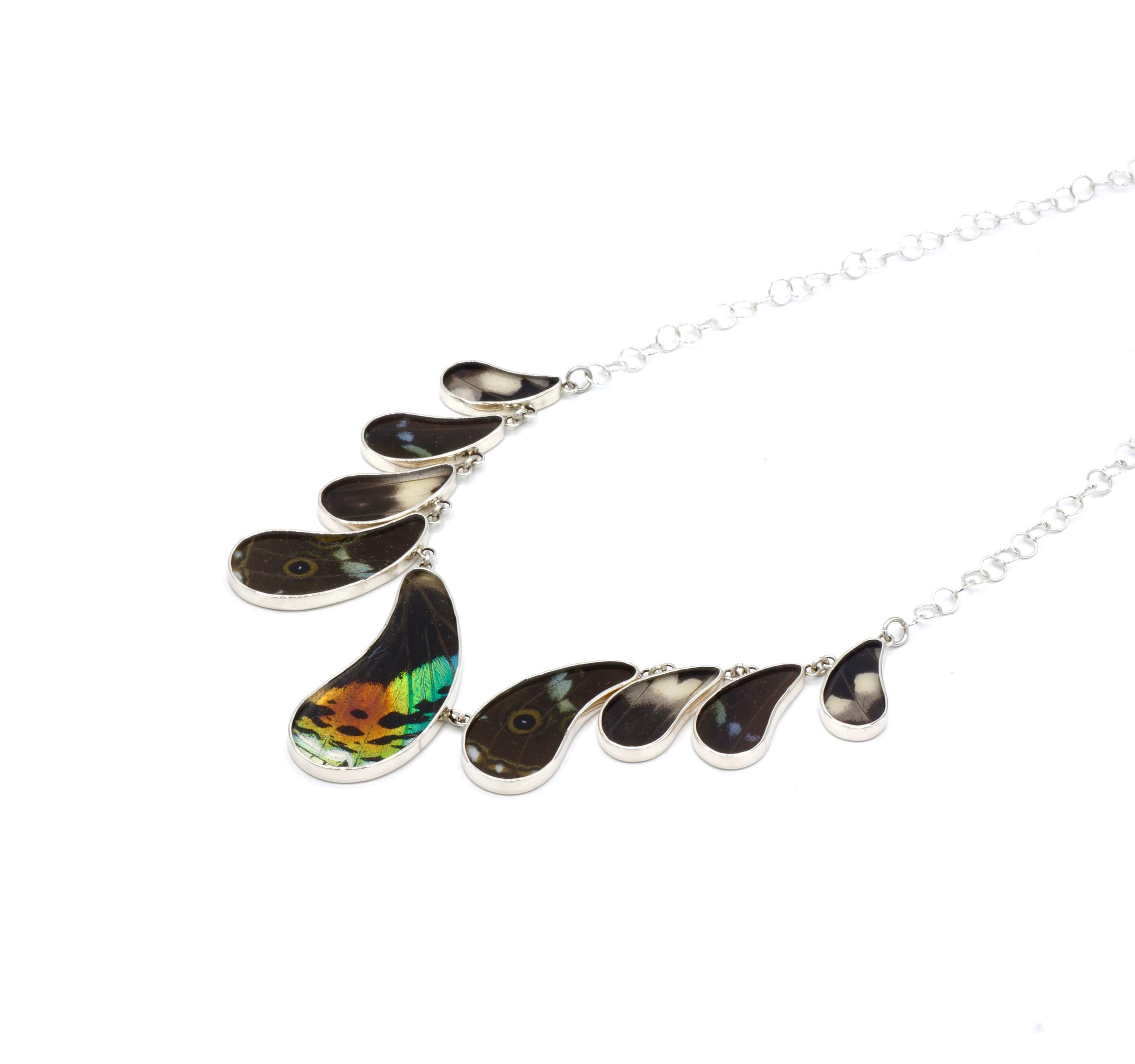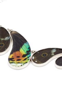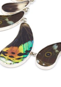 - Luxe zilveren collier ingelegd met de vleugels van de Morpho Helena-, Morpho Helenor- en Urania Ripheus vlinders.
