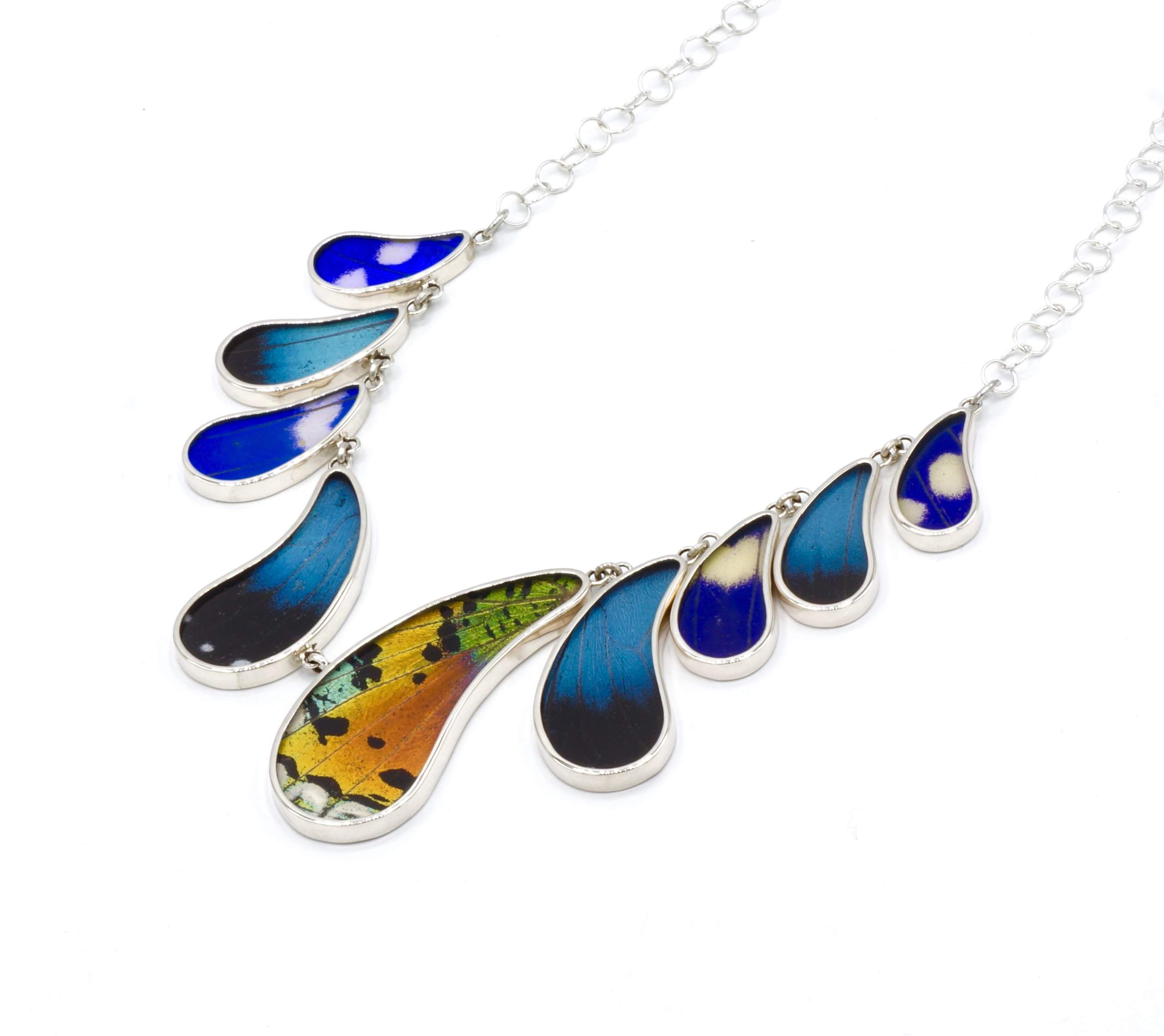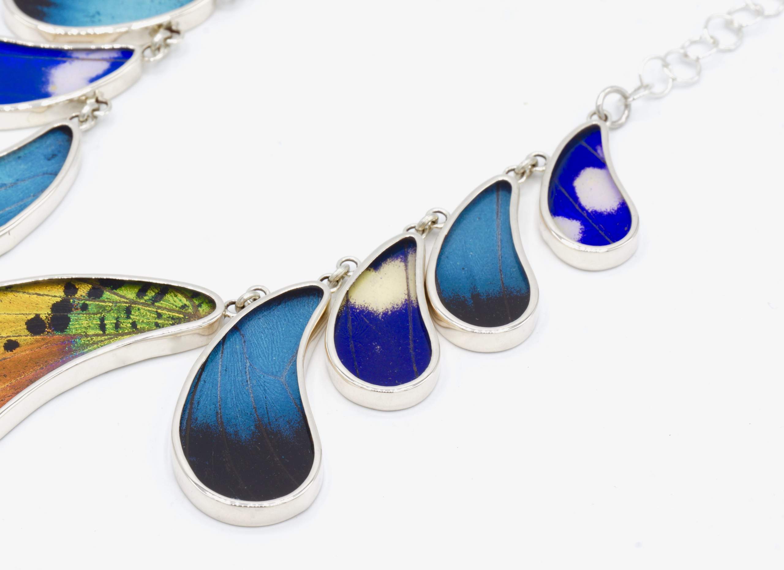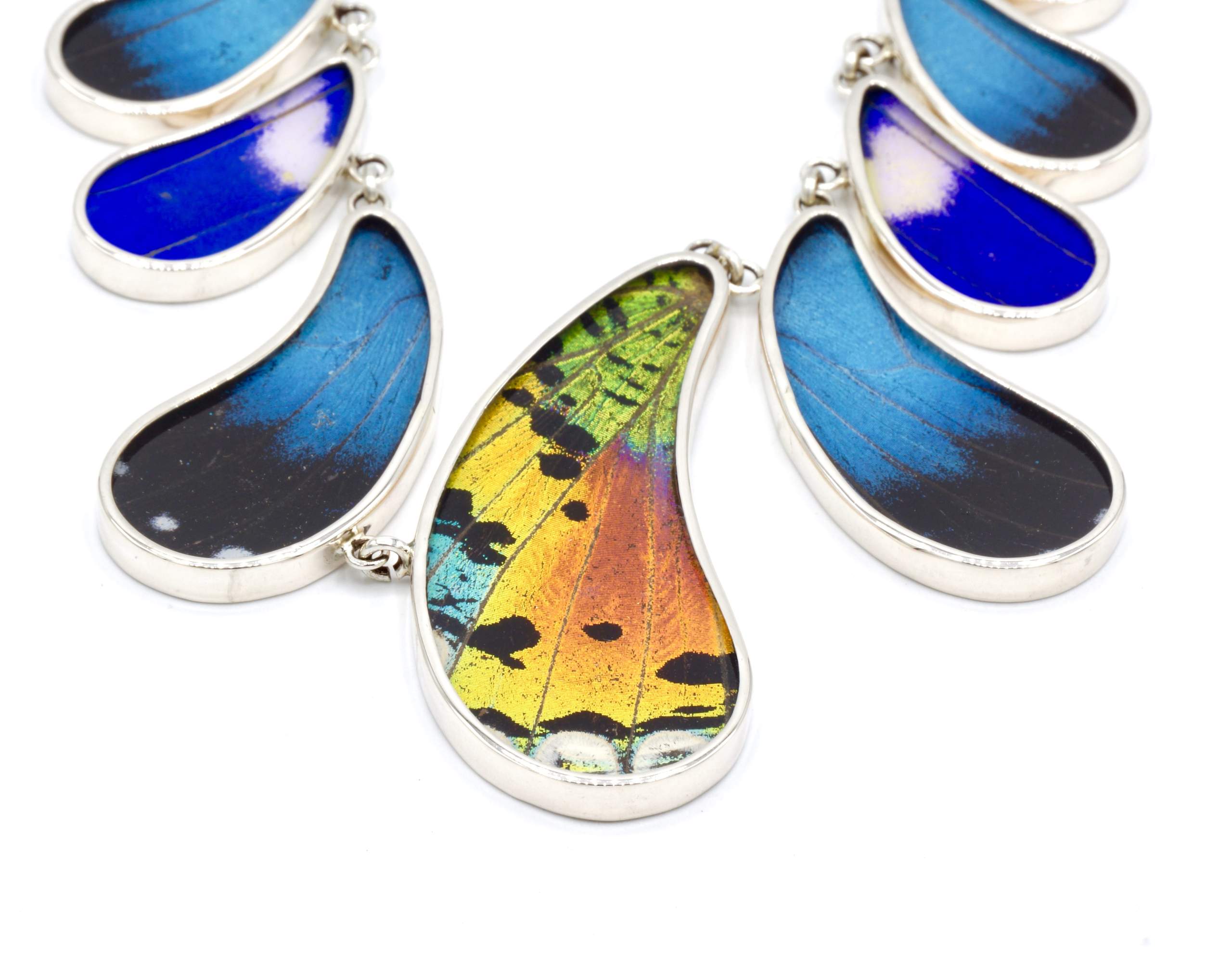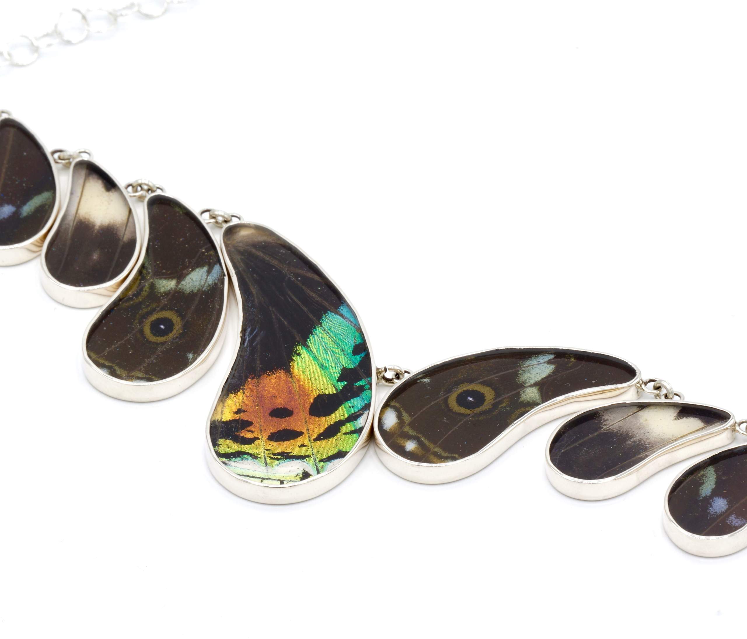 - Luxe zilveren collier ingelegd met de vleugels van de Morpho Helena-, Morpho Helenor- en Urania Ripheus vlinders.