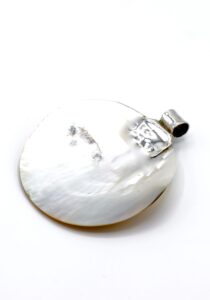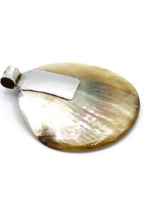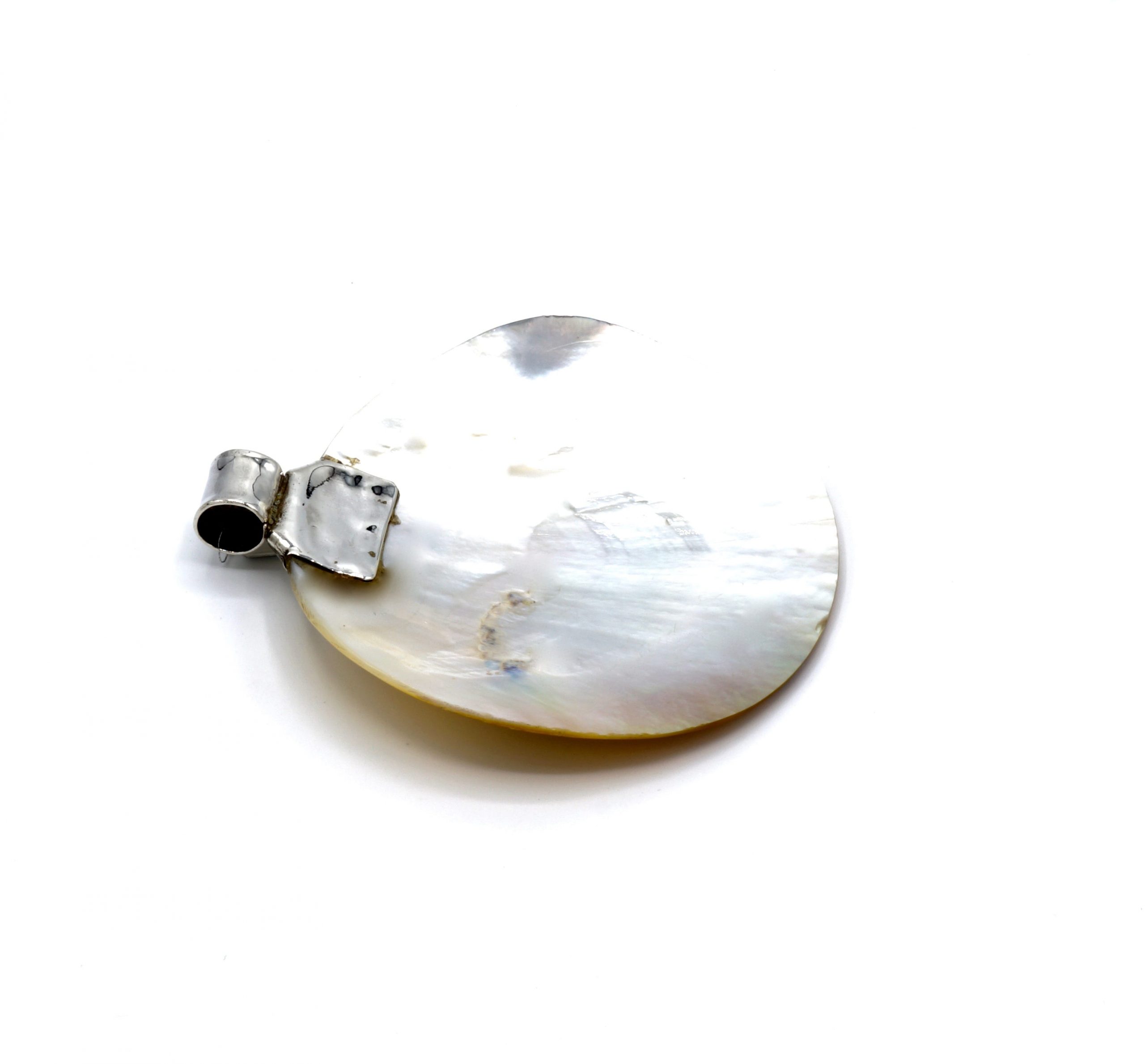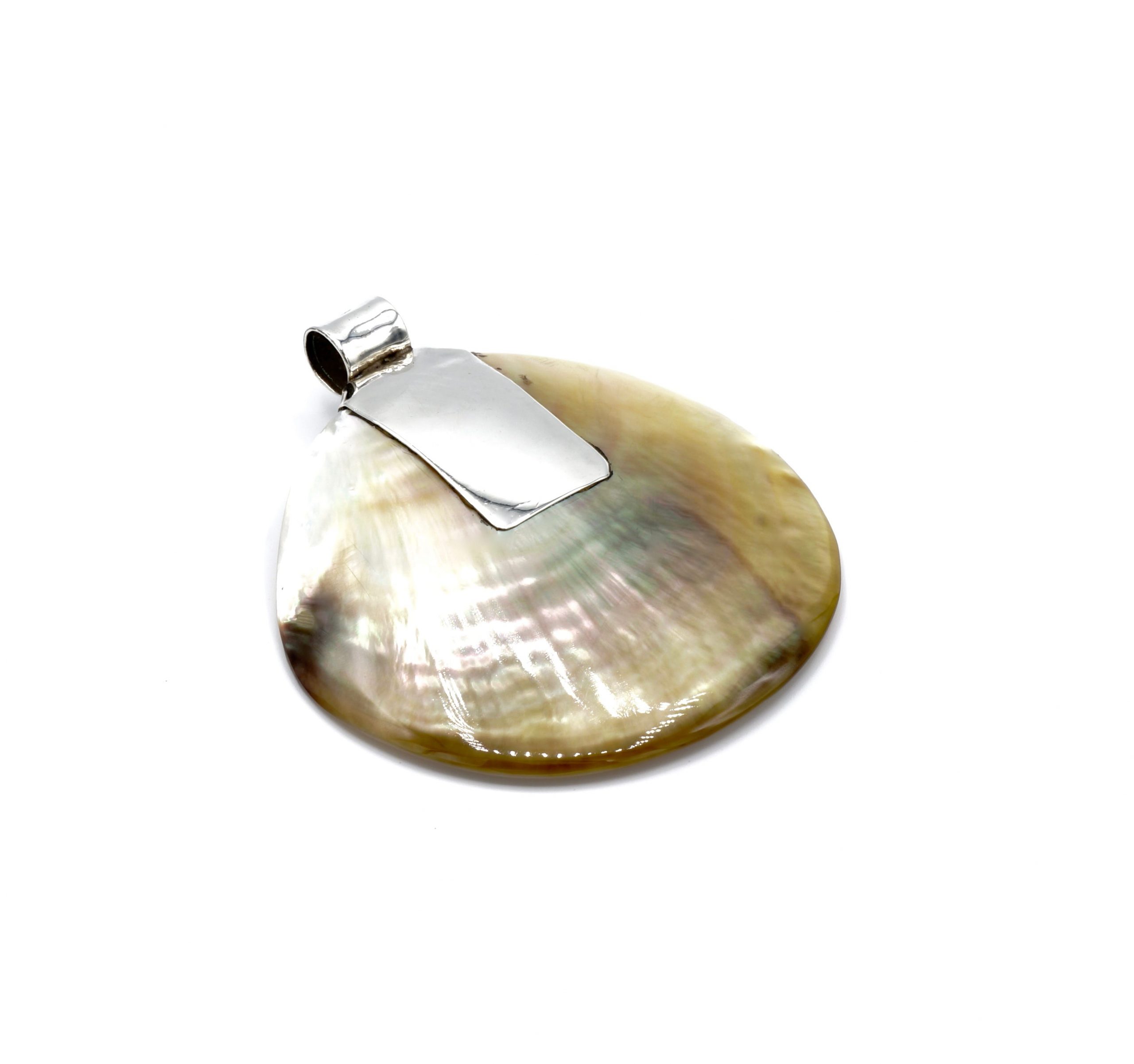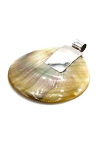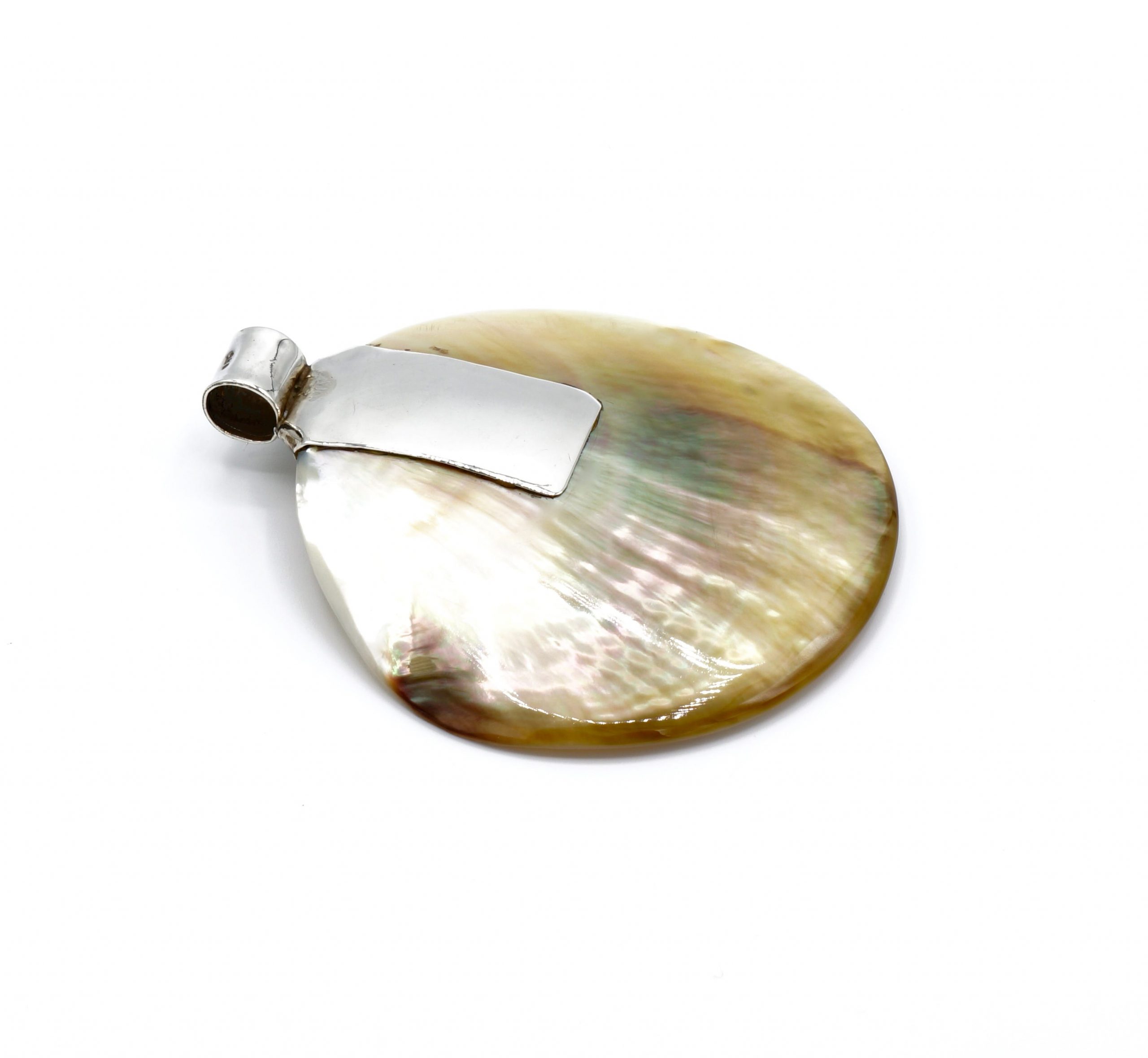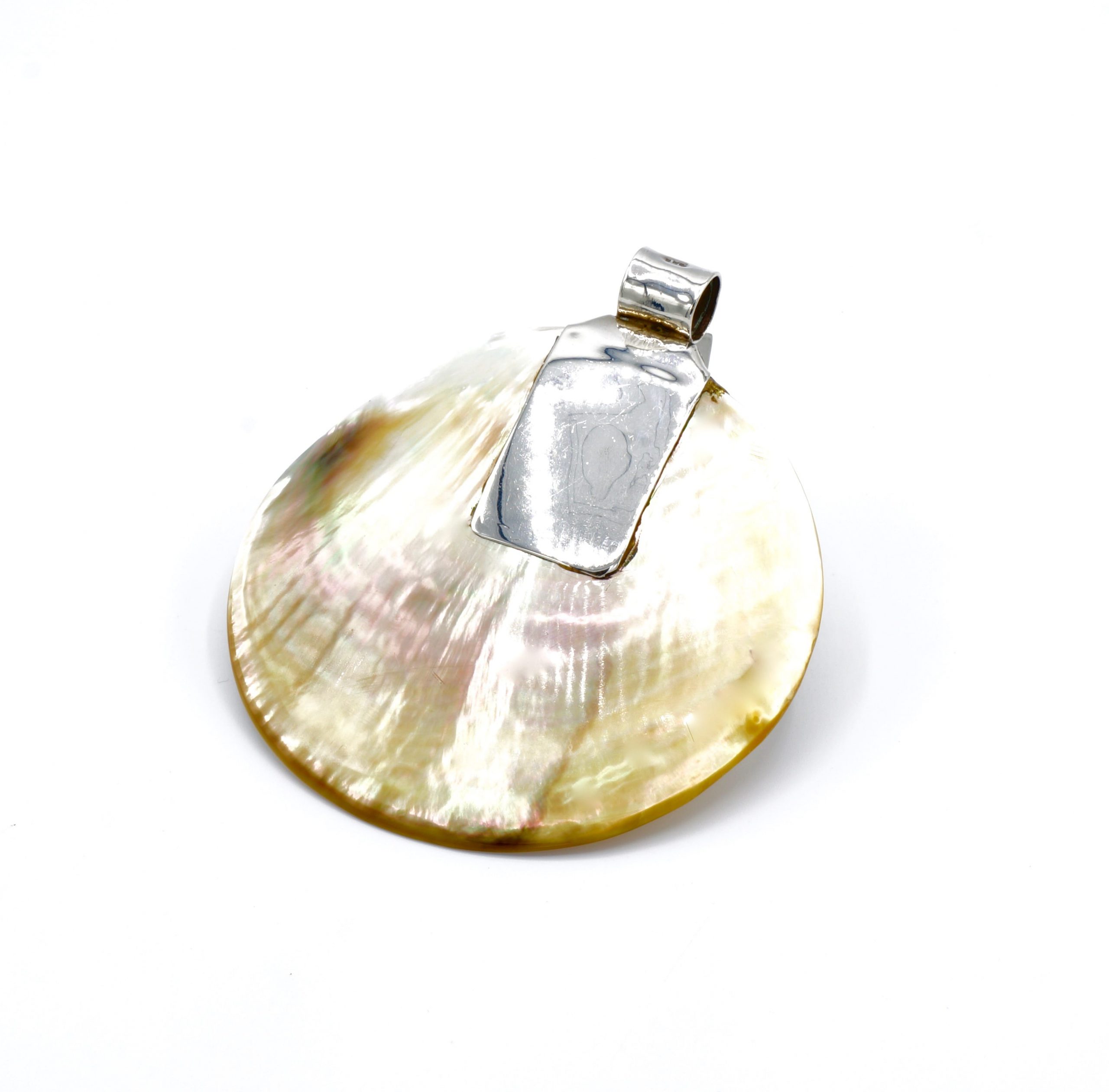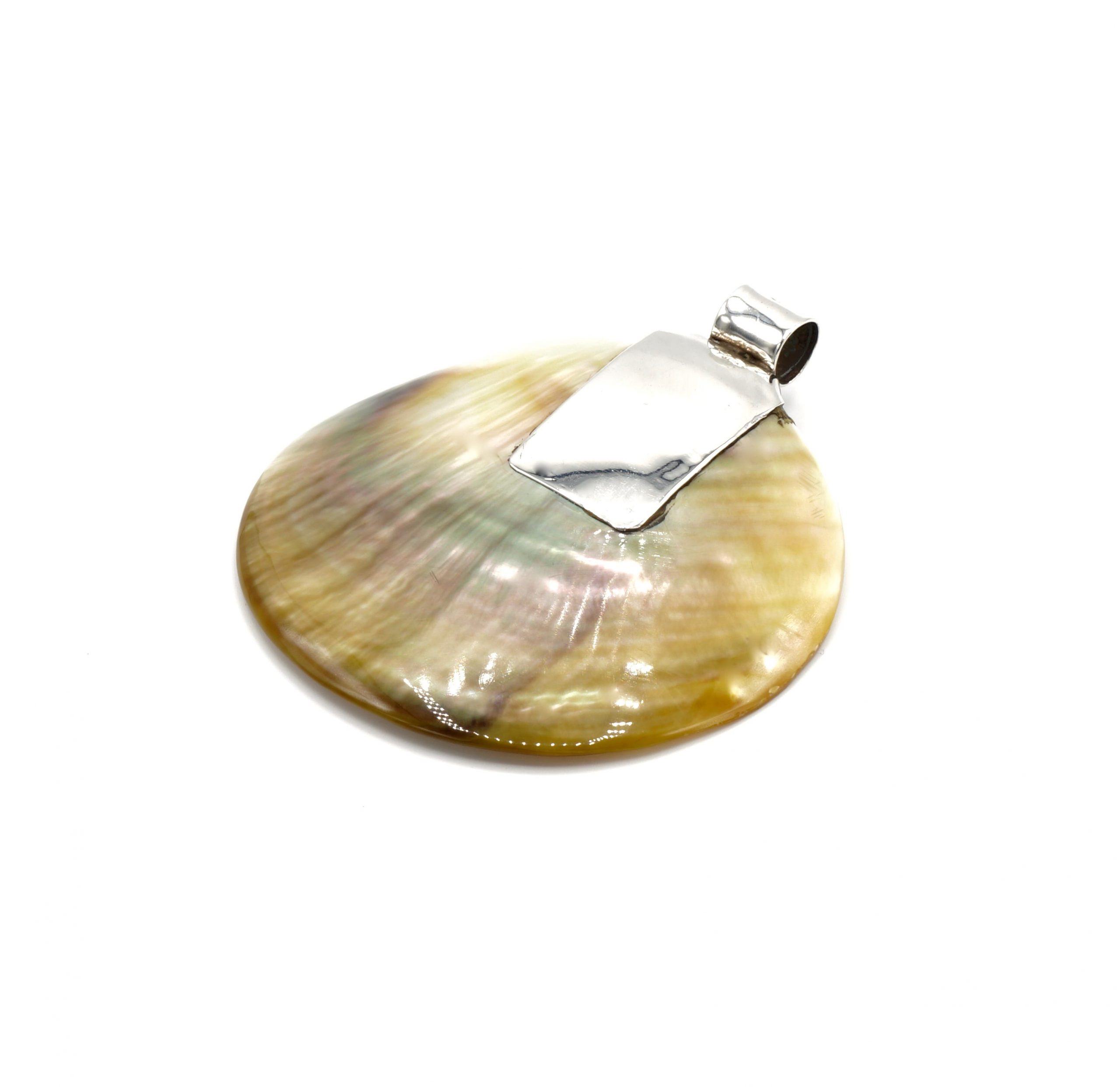 Deze prachtige, betoverende hanger is handgemaakt van verfijnd, exclusief geel parelmoer dat perfect is ingelegd in een zilveren design.