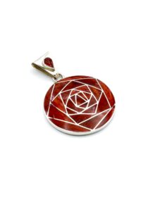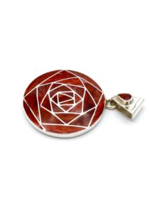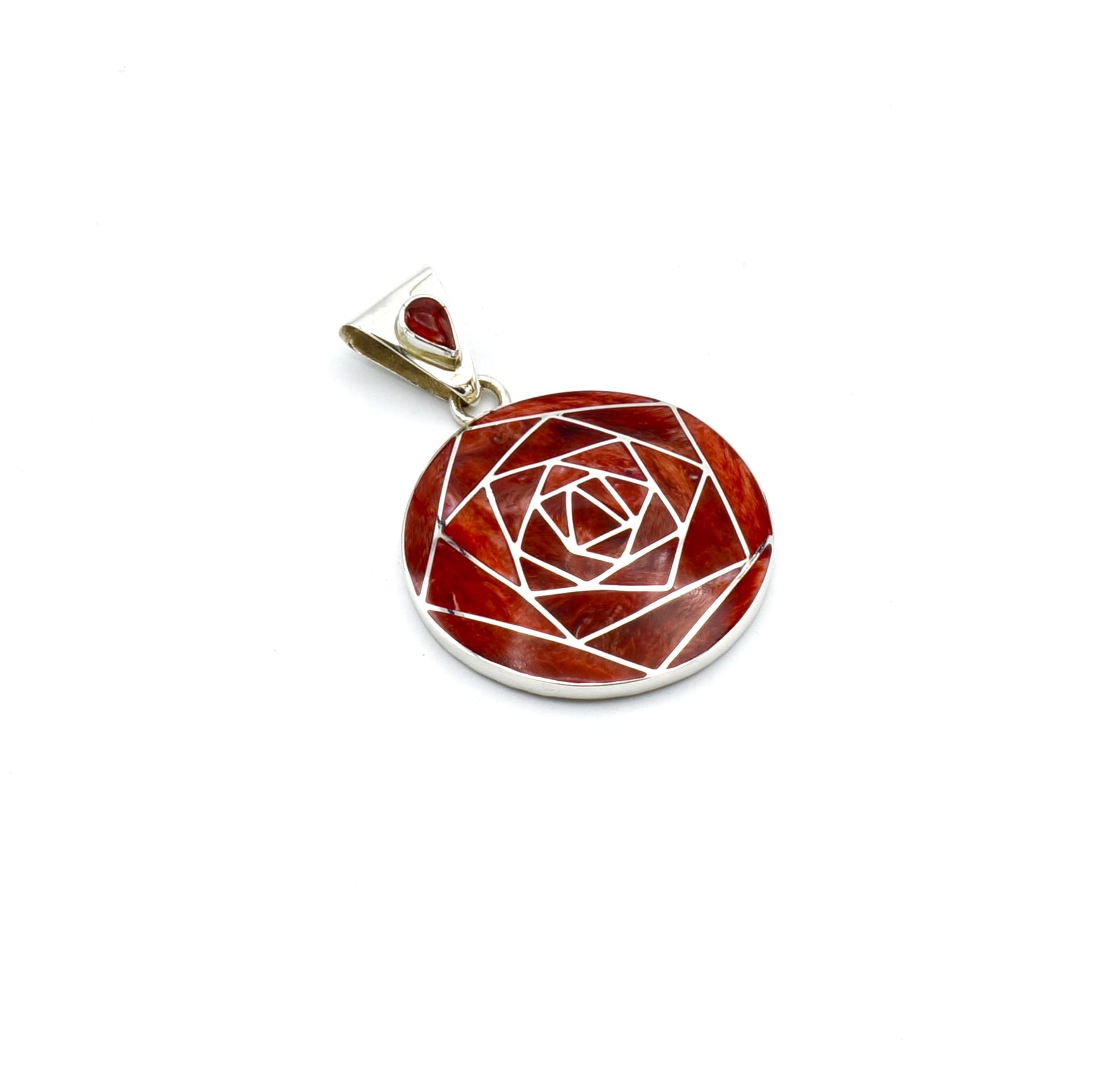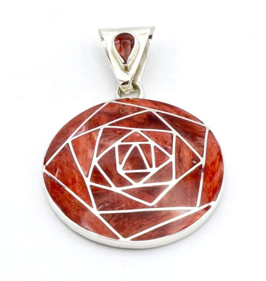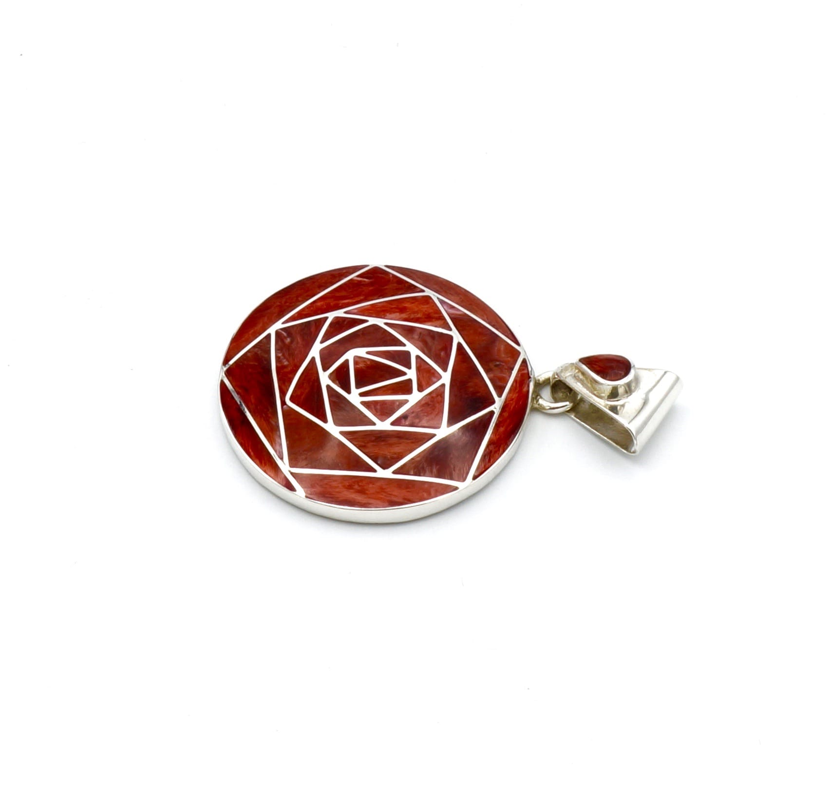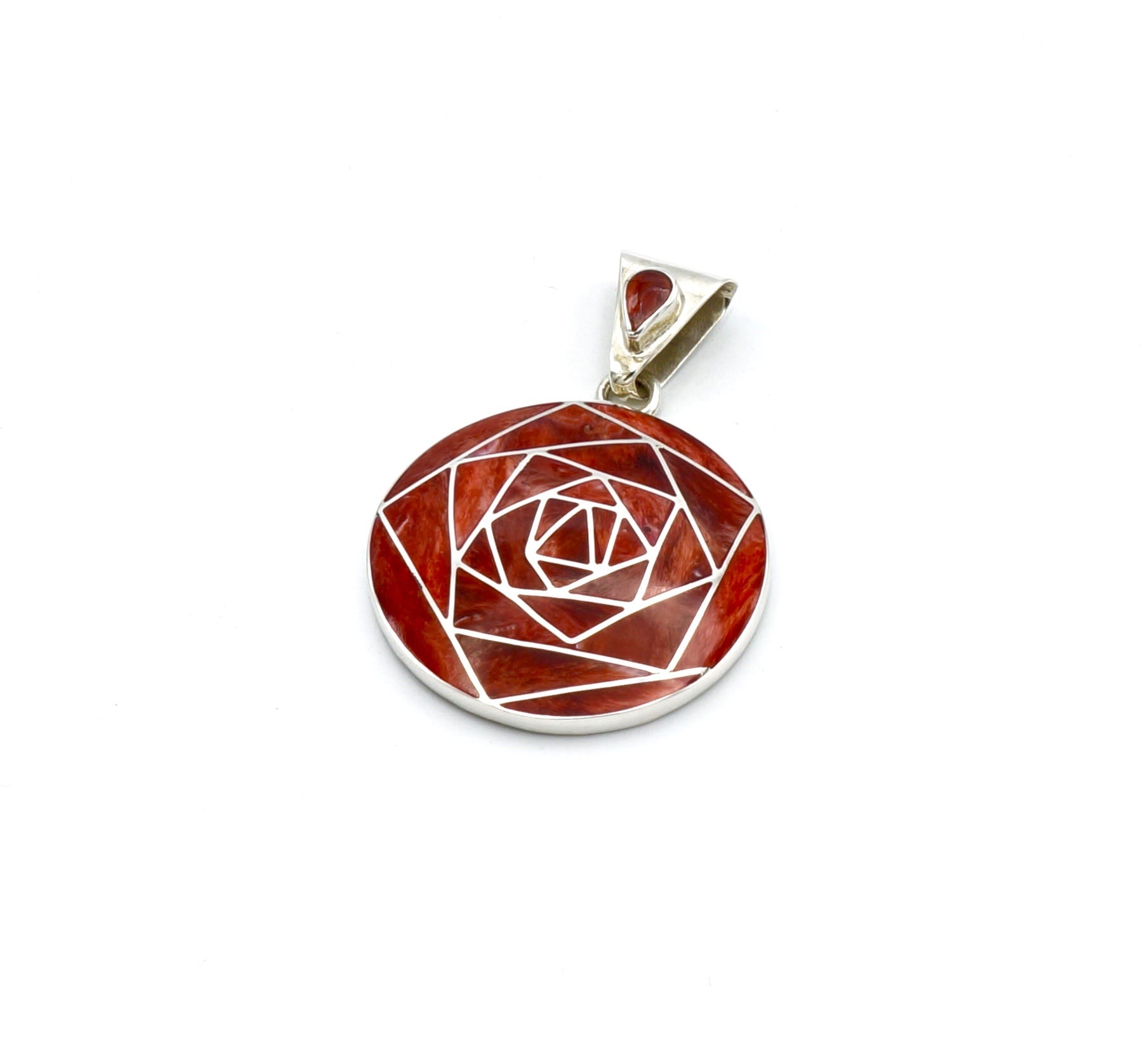 Deze prachtige, geometrische hanger is handgemaakt van verfijnde, exclusieve Peruaanse rode Spondylus schelpen, die perfect zijn ingelegd in een zilveren design.