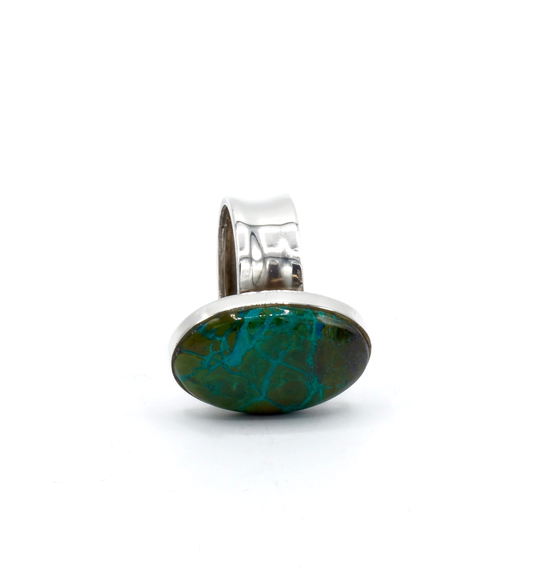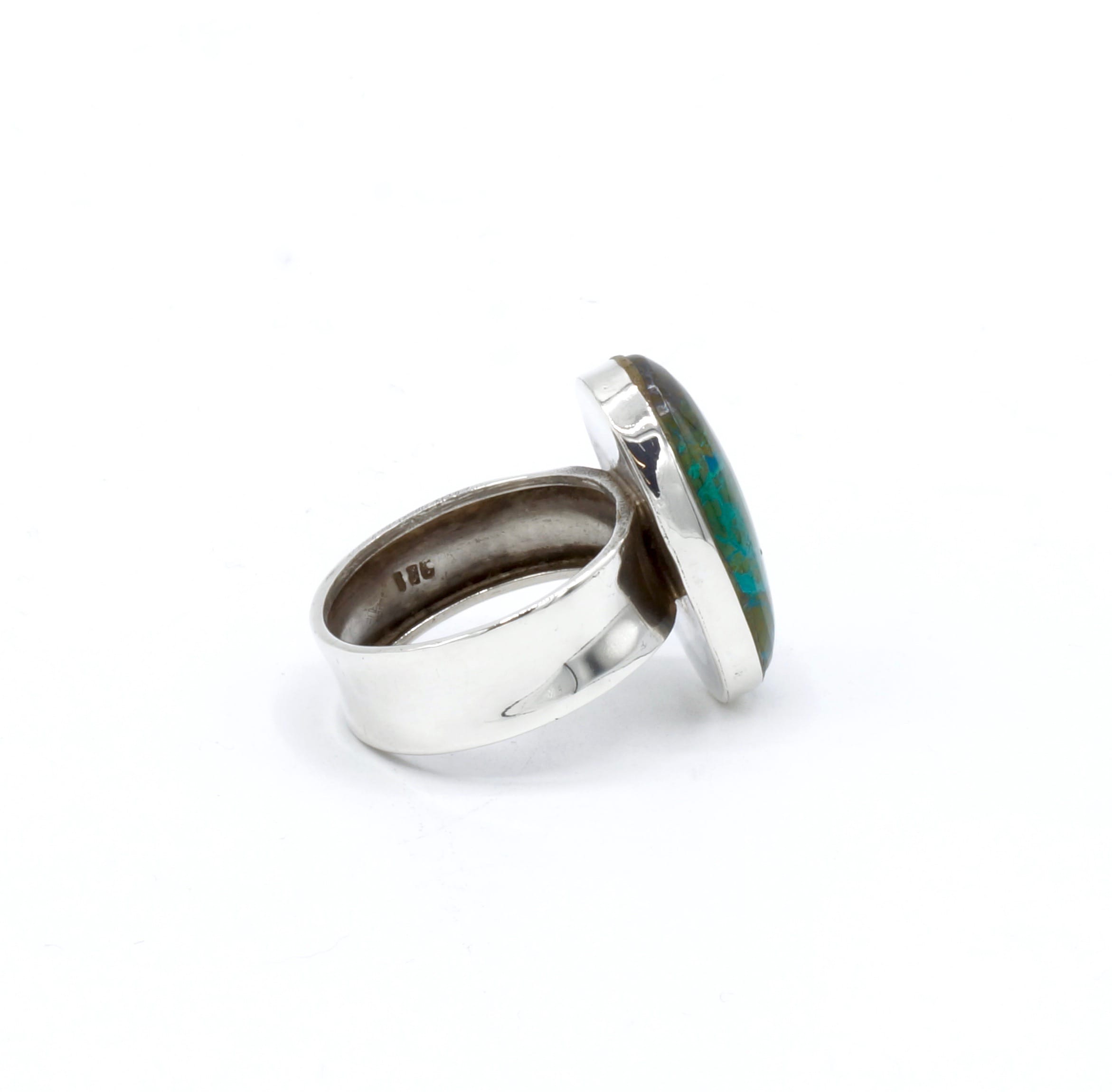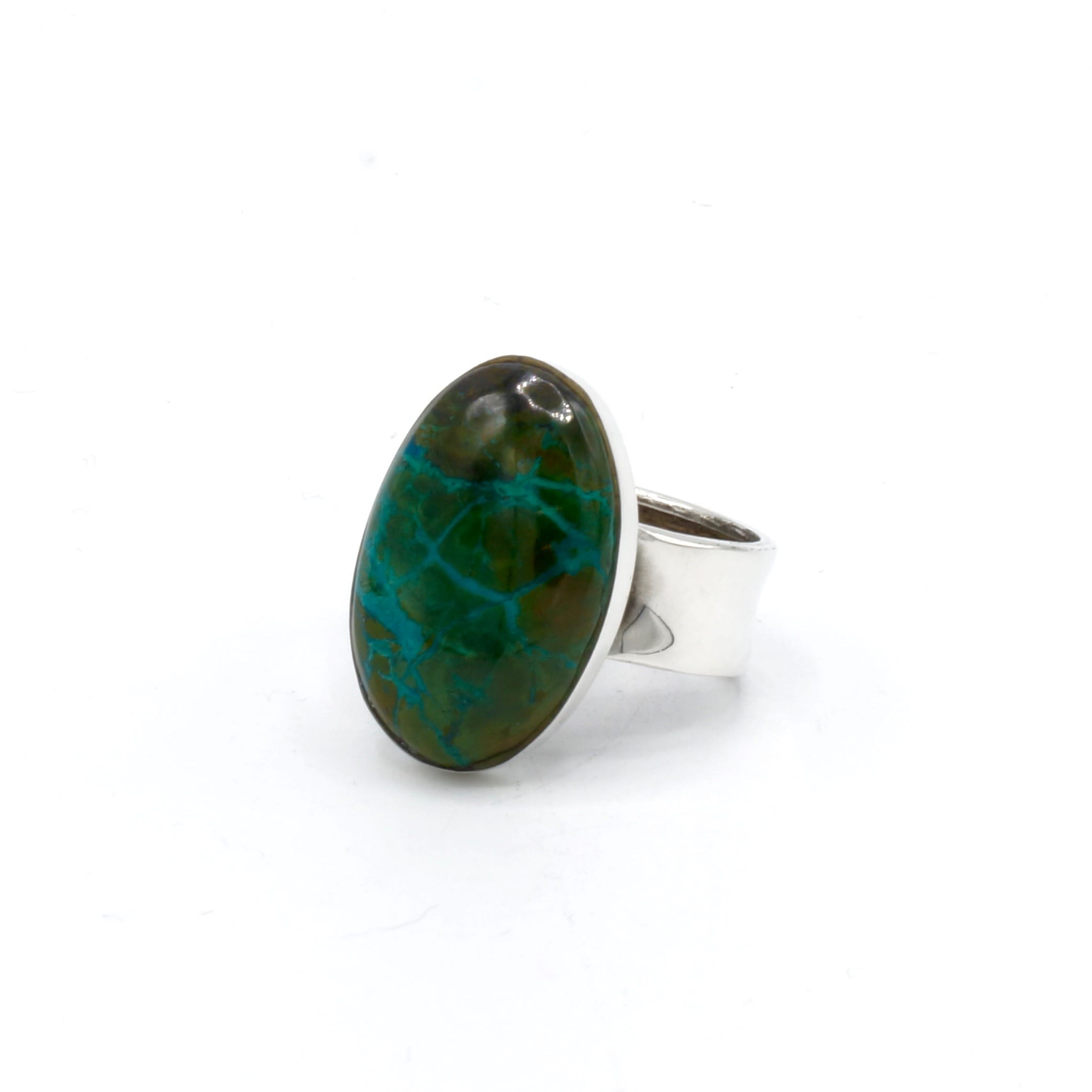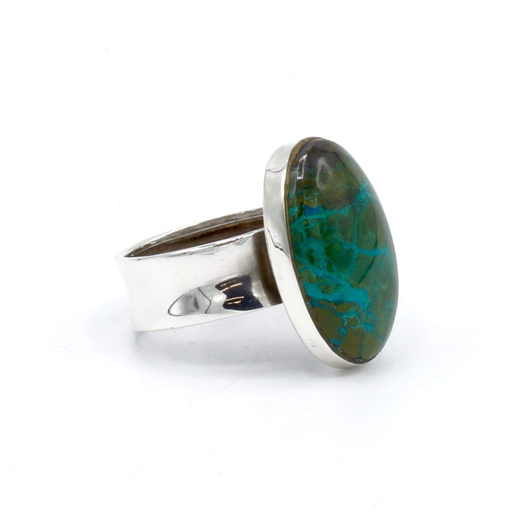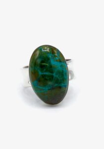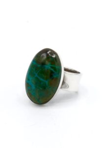 Als u van zware en luxueuze ringen houdt dan is deze ring perfect voor u! Deze ring is gemaakt door Peruaanse ambachtslieden met zilver met een gehalte van 950 van de beste kwaliteit, en een prachtige Chrysocolla steen!