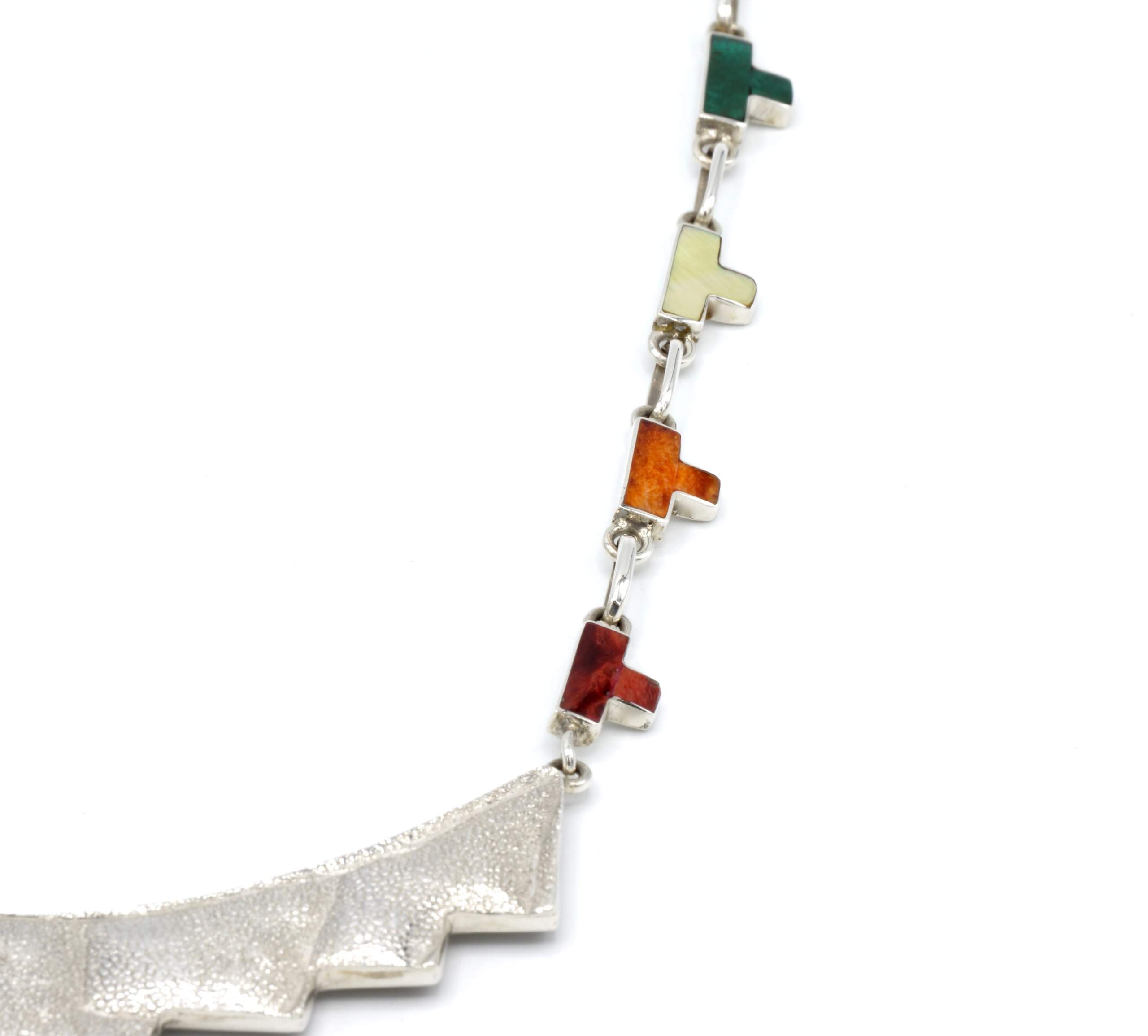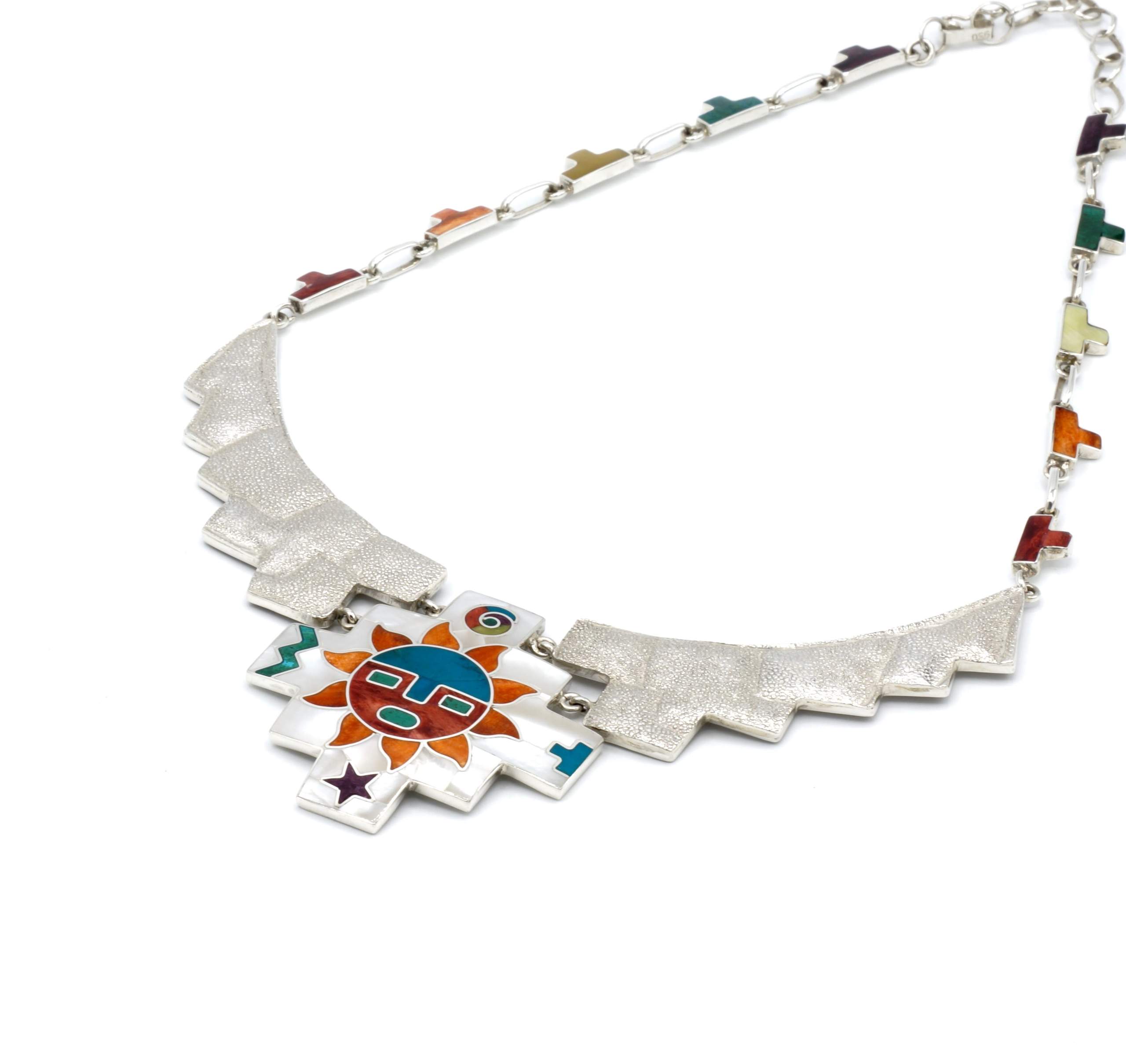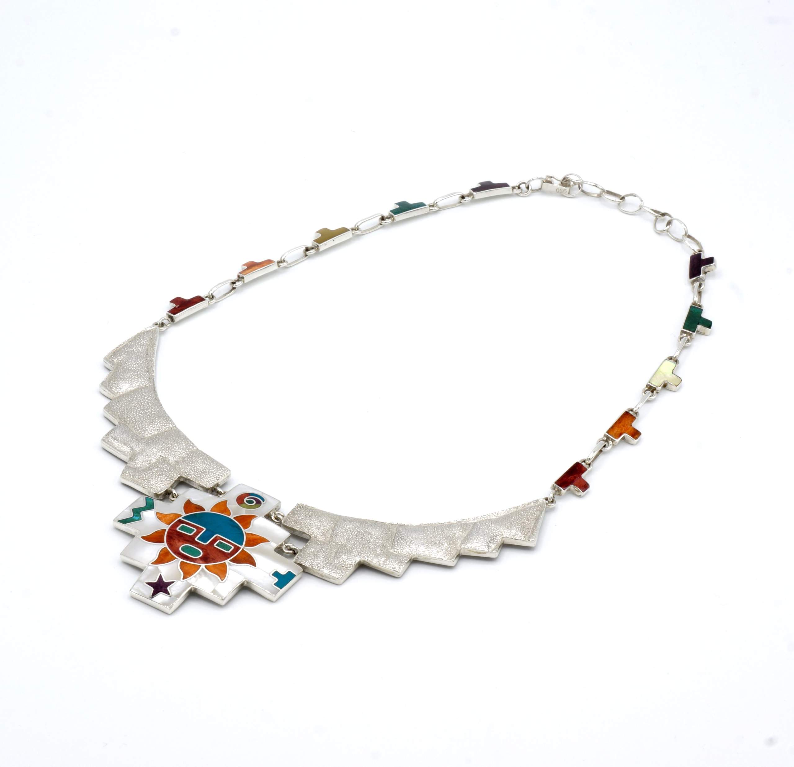 - Luxe zilveren collier ingelegd met prachtig fijn gesneden Spondylus schelpen, parelmoer, Abalone schelp, turkoois en Chrysocolla stenen