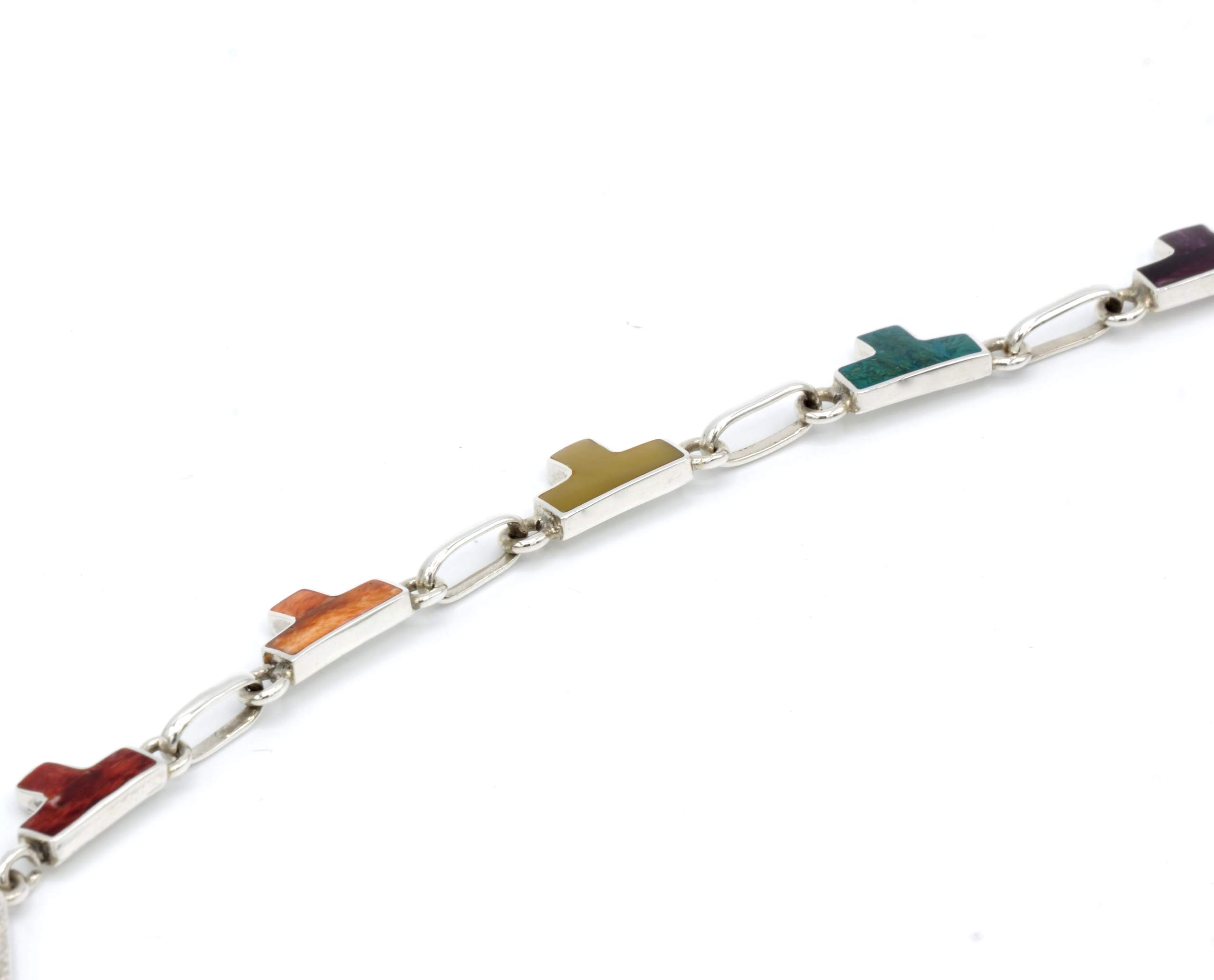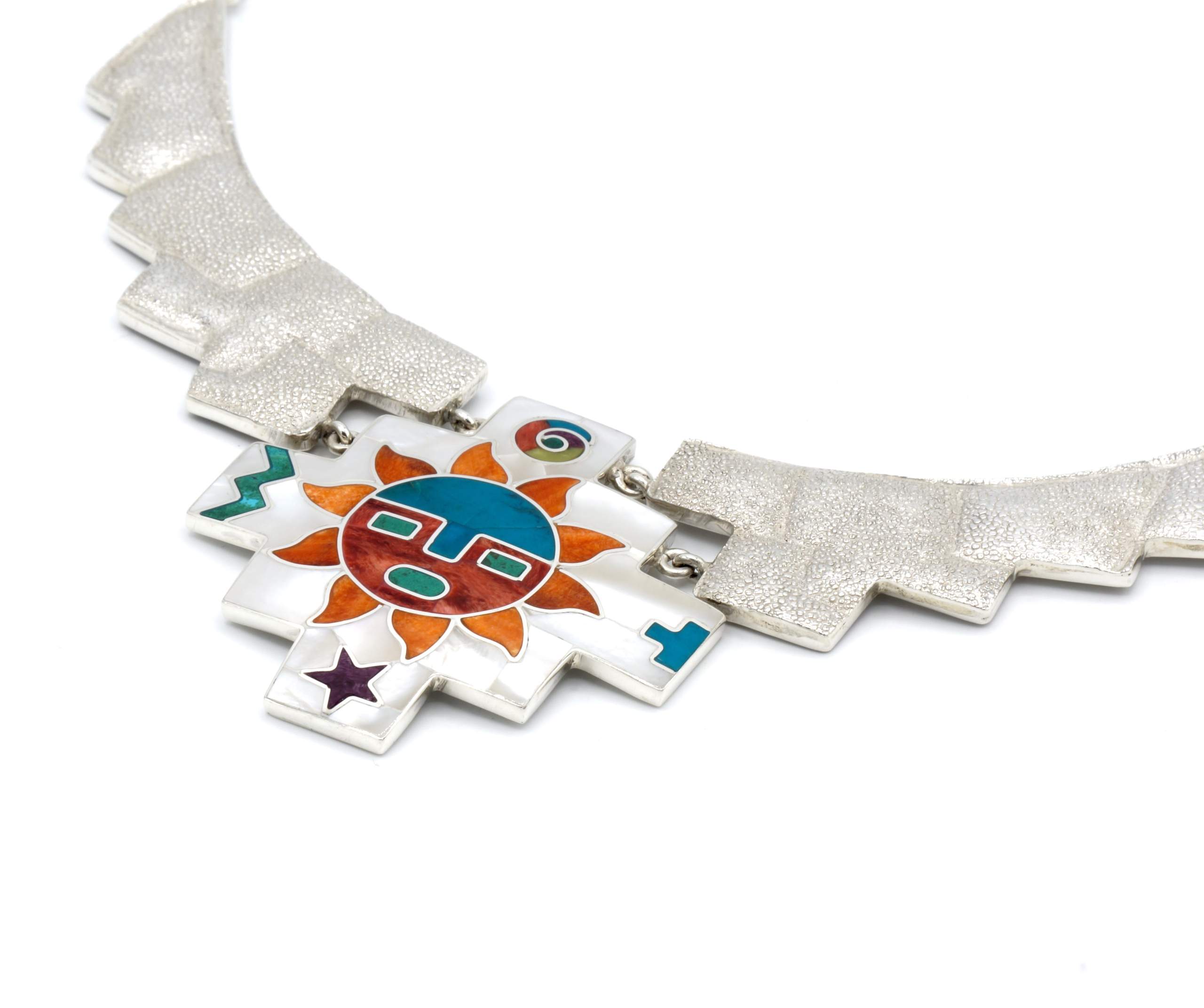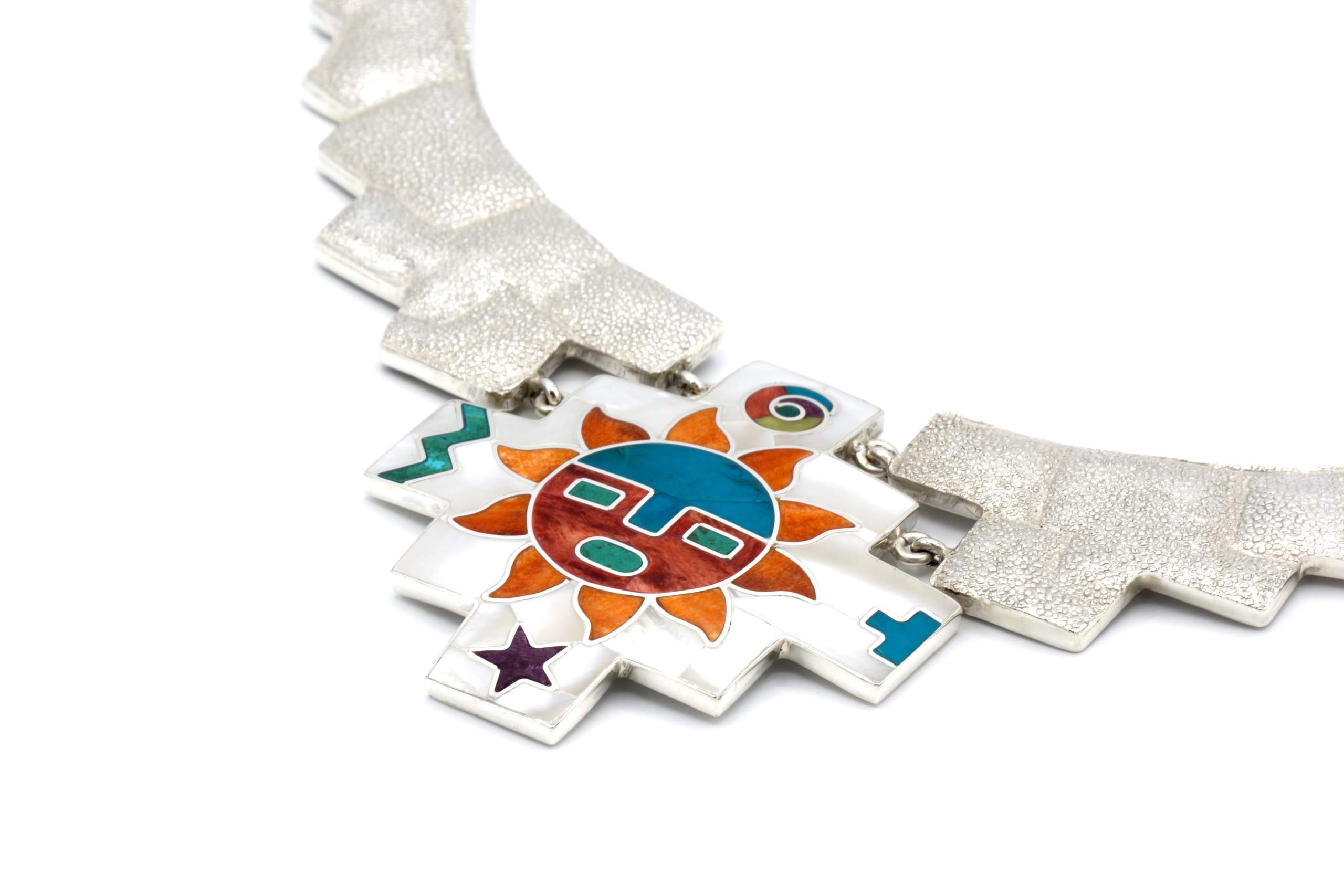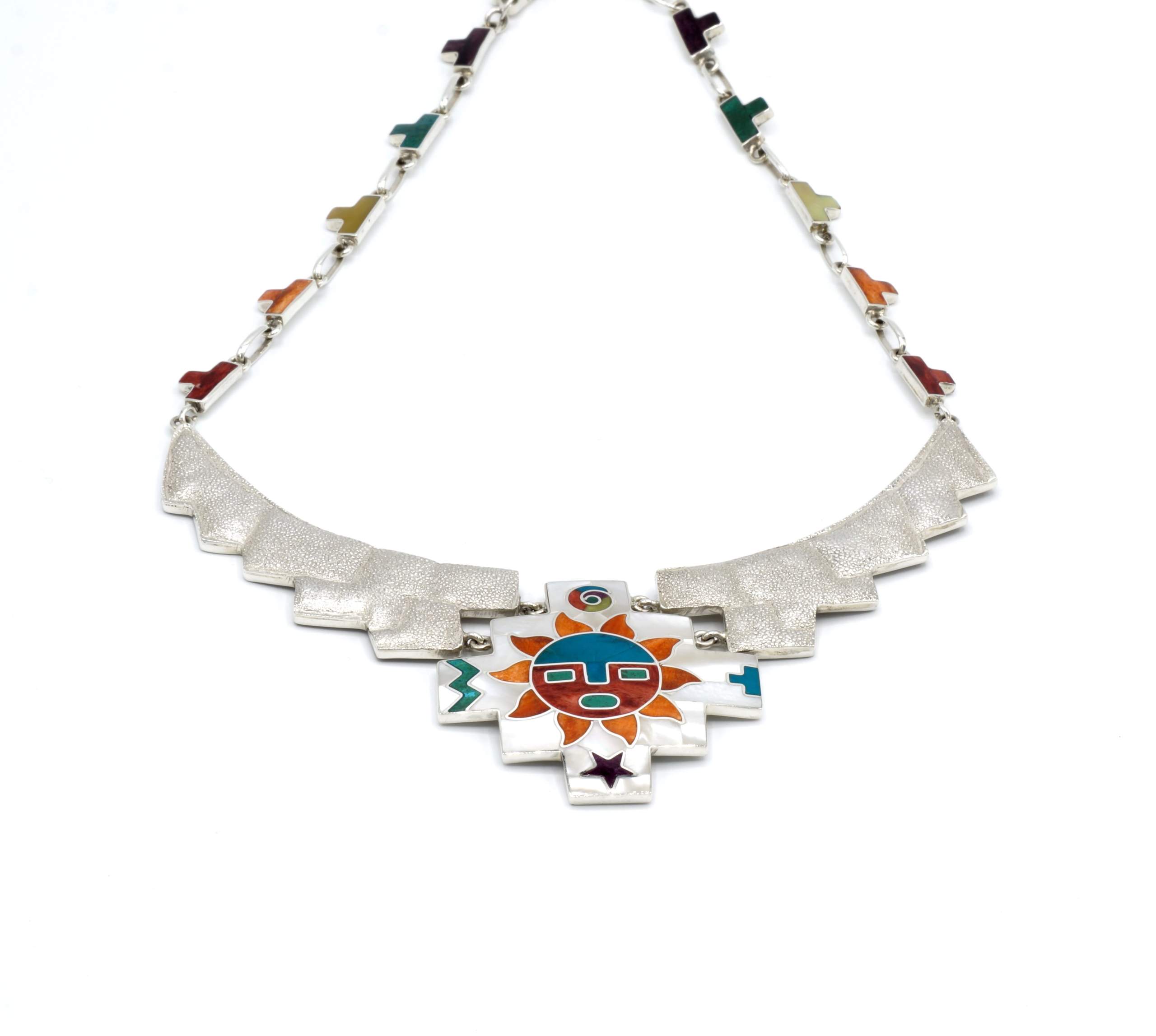 - Luxe zilveren collier ingelegd met prachtig fijn gesneden Spondylus schelpen, parelmoer, Abalone schelp, turkoois en Chrysocolla stenen