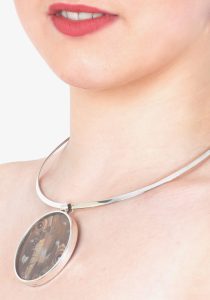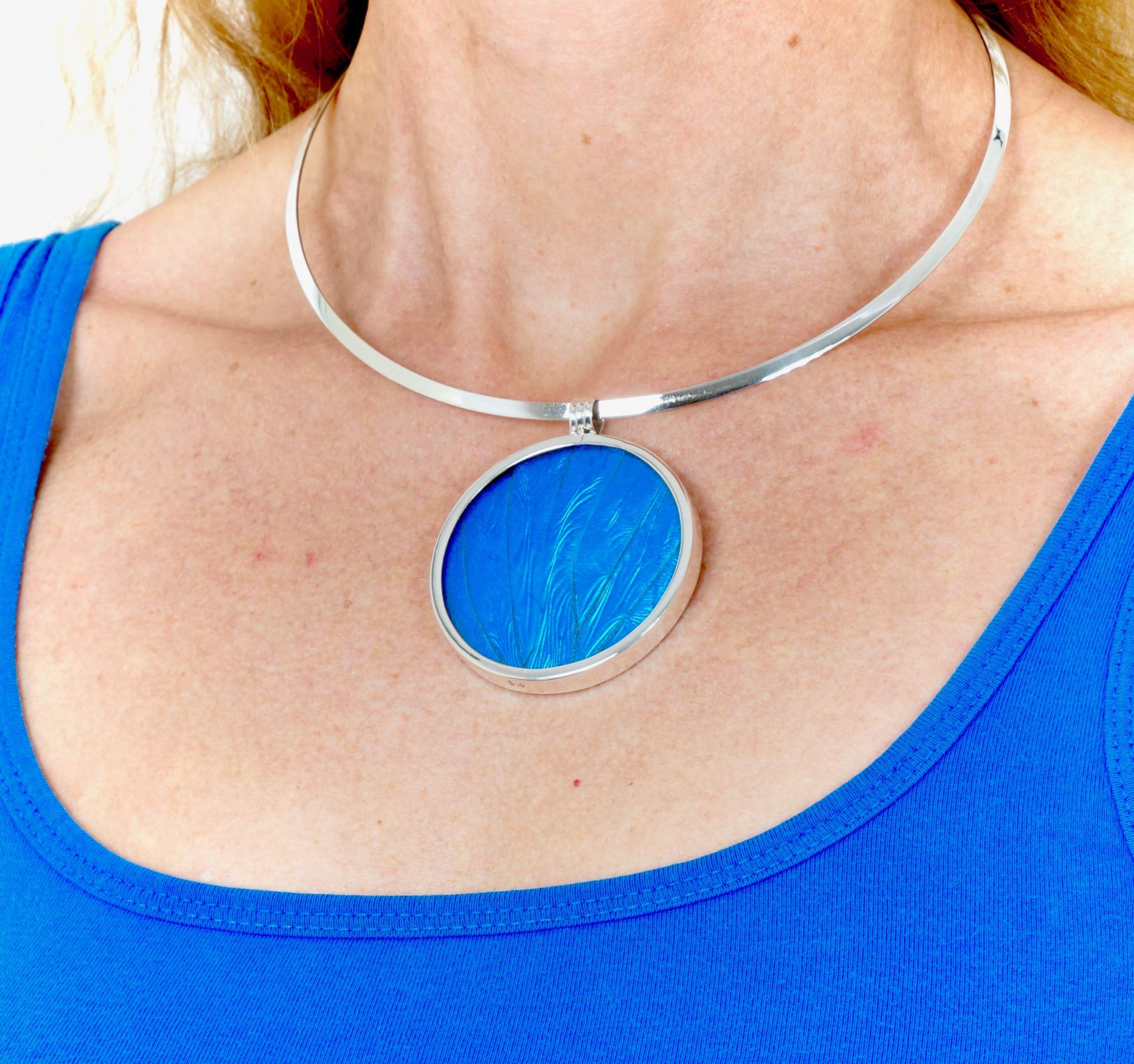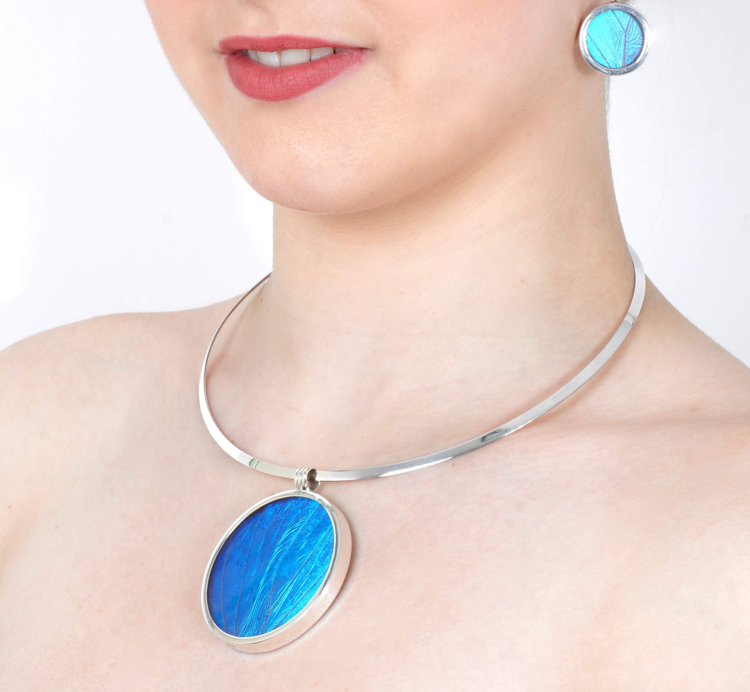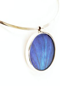 Dit sieraad is één van de meest originele items in onze luxe vlindercollectie. Met dit glamoureuze medaillon geniet u elke dag van de prachtige en iriserende kleuren van de Morpho Helena!