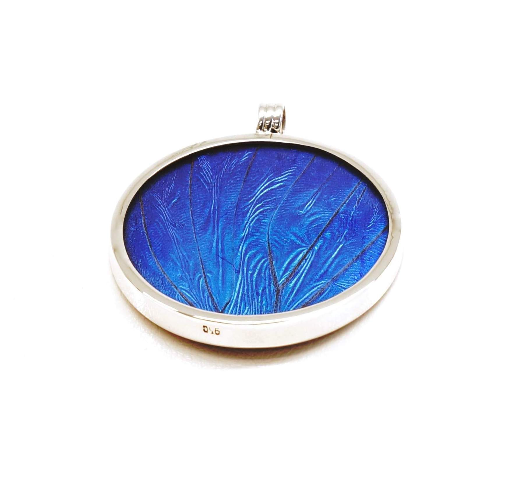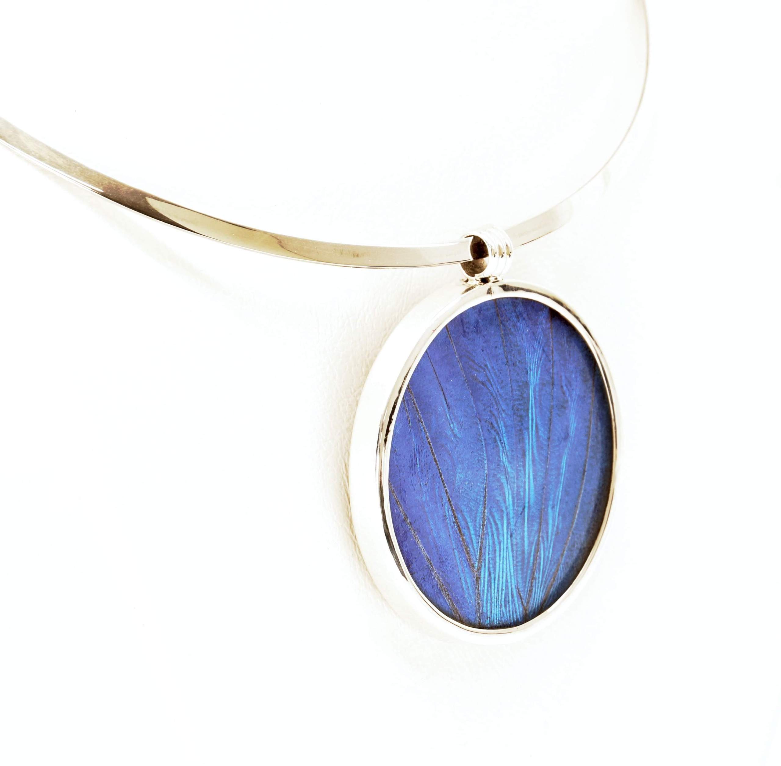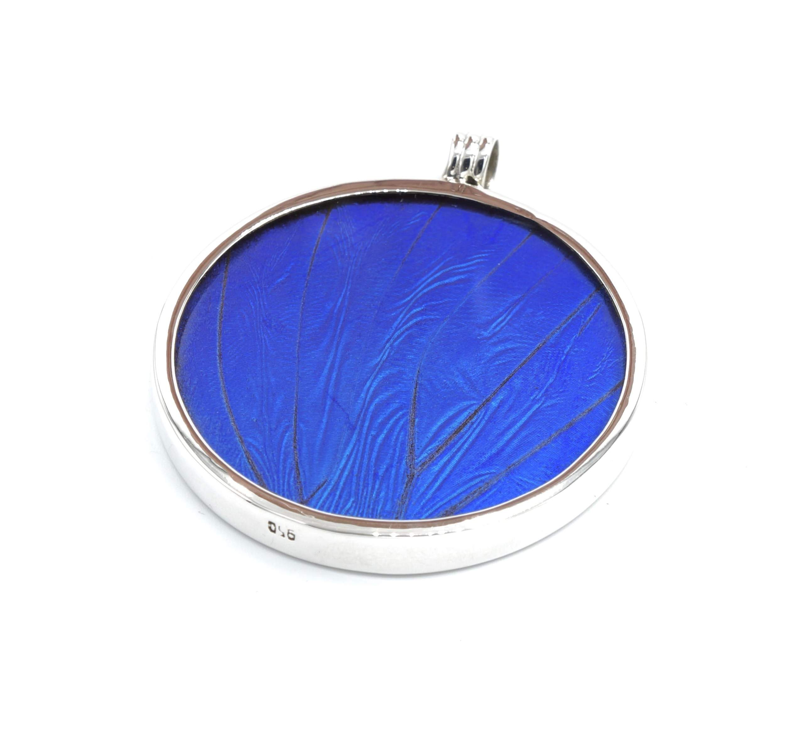 Dit uitzonderlijke kunstwerk is een prachtig, handgemaakt medaillon van de vleugel van de magische vlinder Morpho Helena in een delicaat zilveren ontwerp.