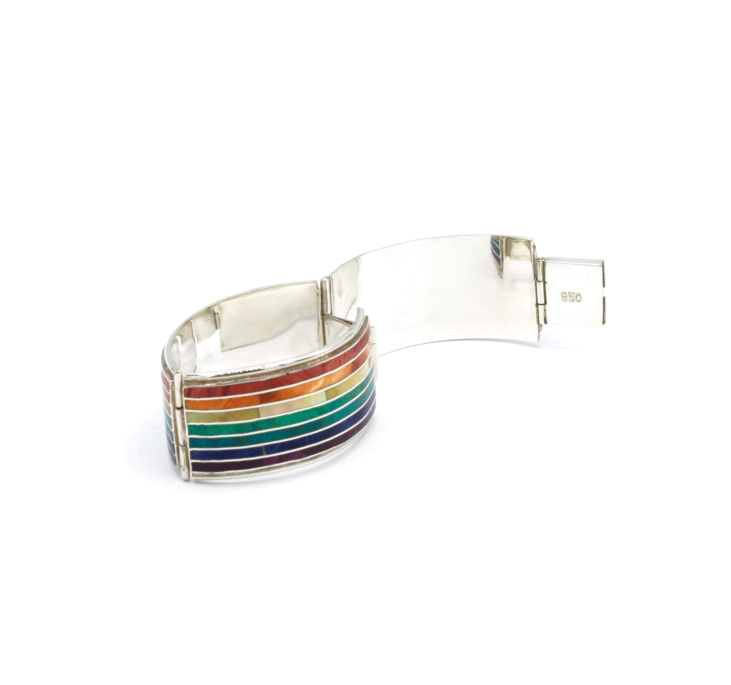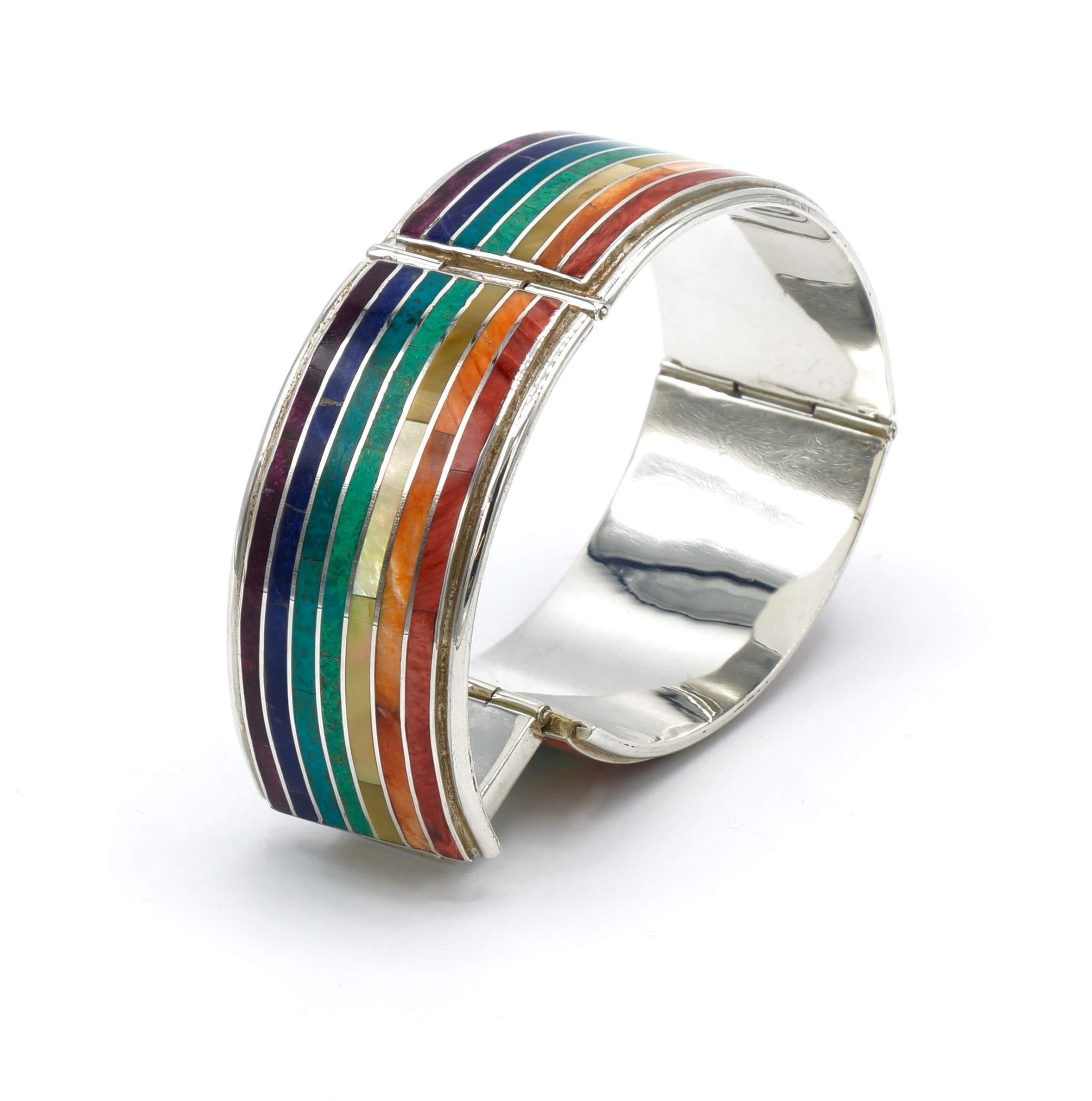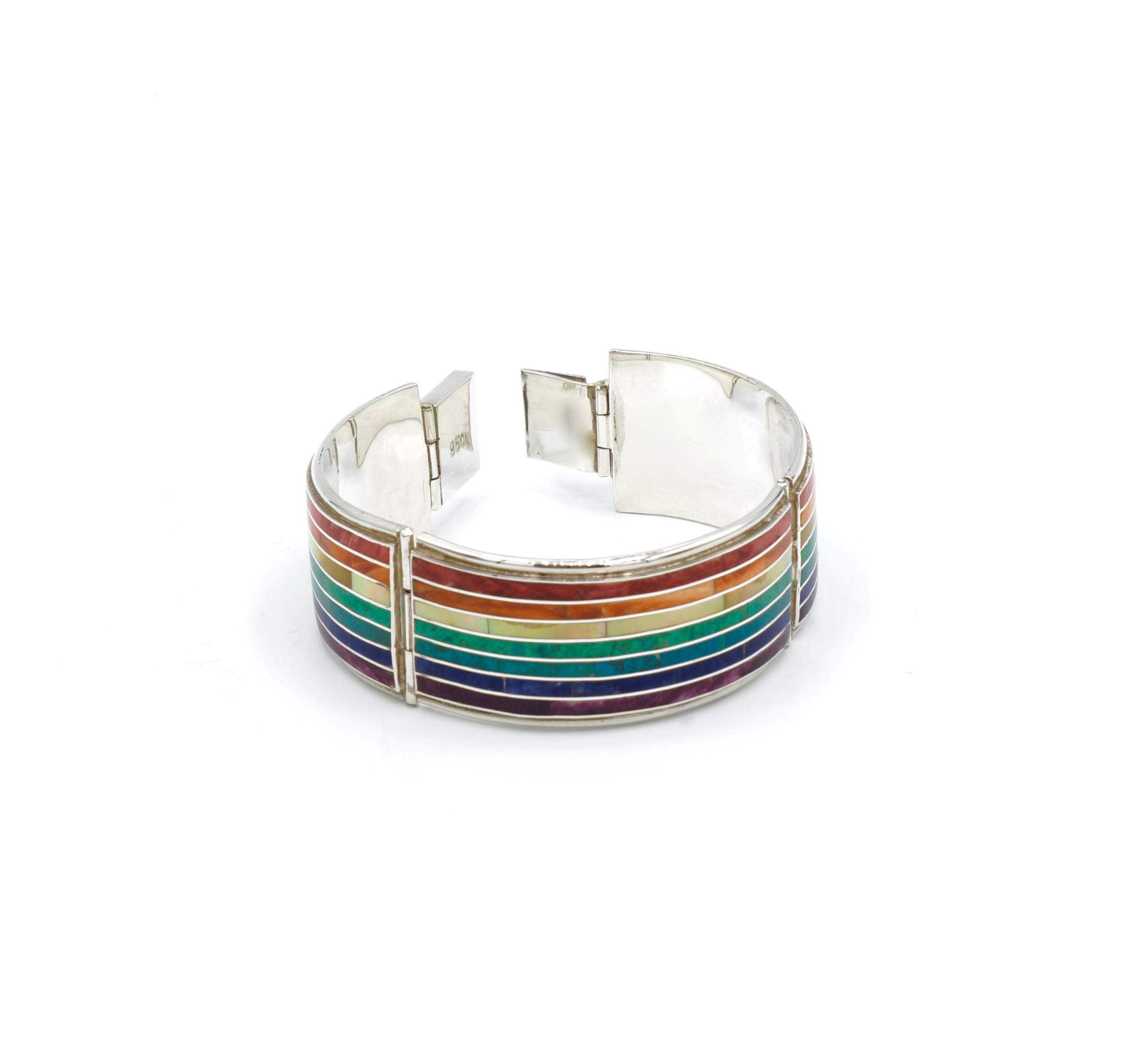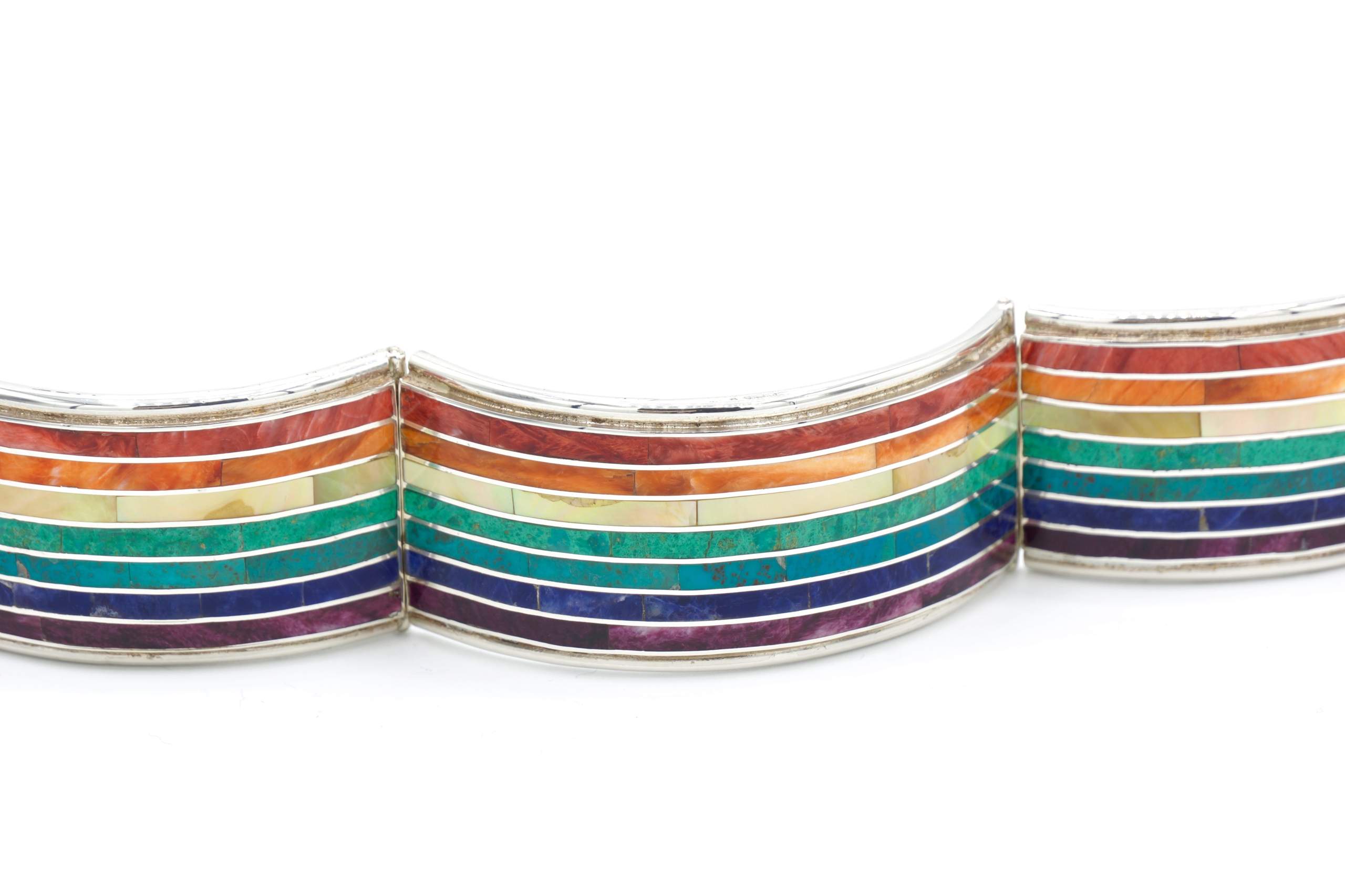 - Luxe zilveren armband ingelegd met prachtig fijn gesneden Spondylus schelpen, parelmoer, Abalone schelp, turkoois en Chrysocolla stenen