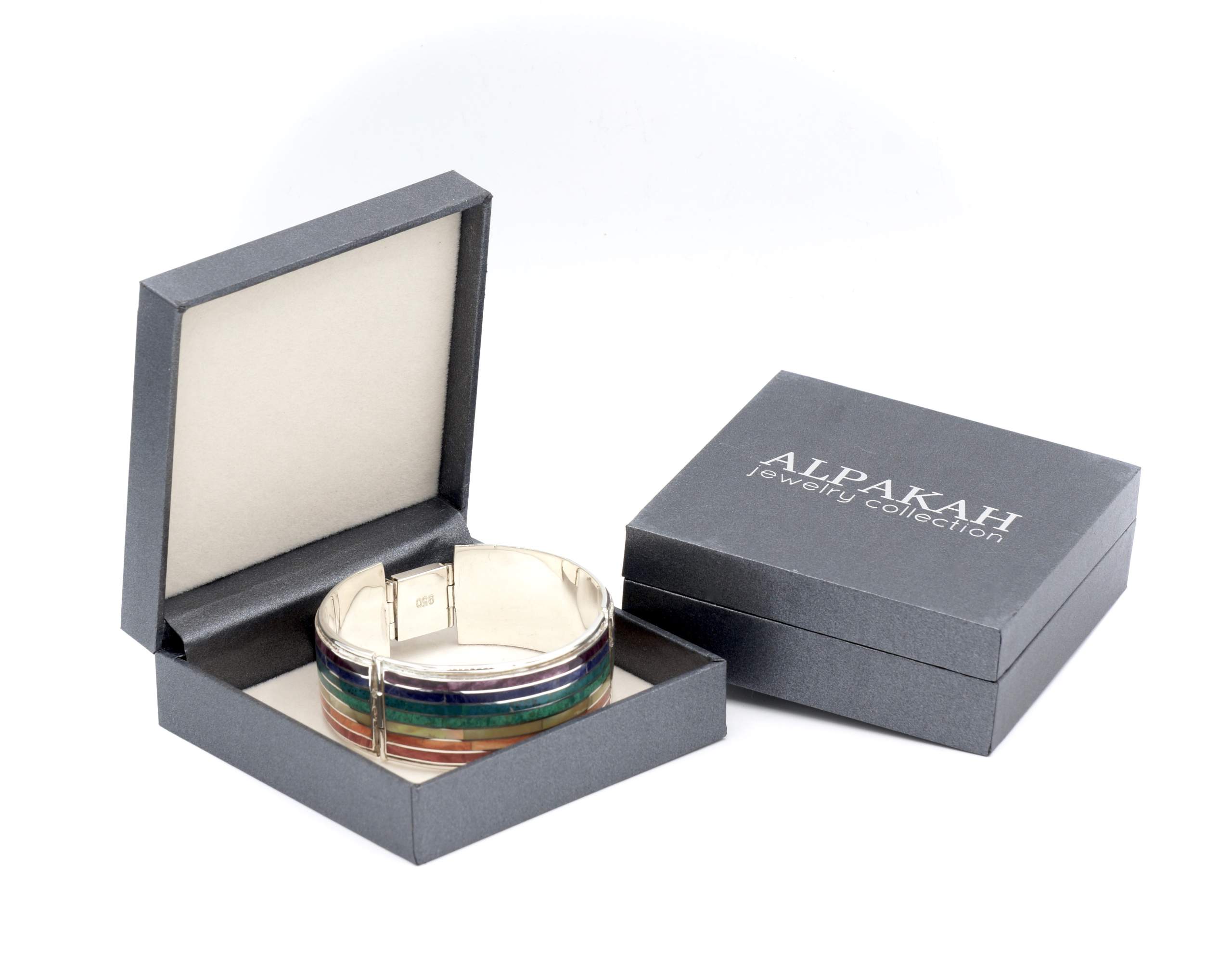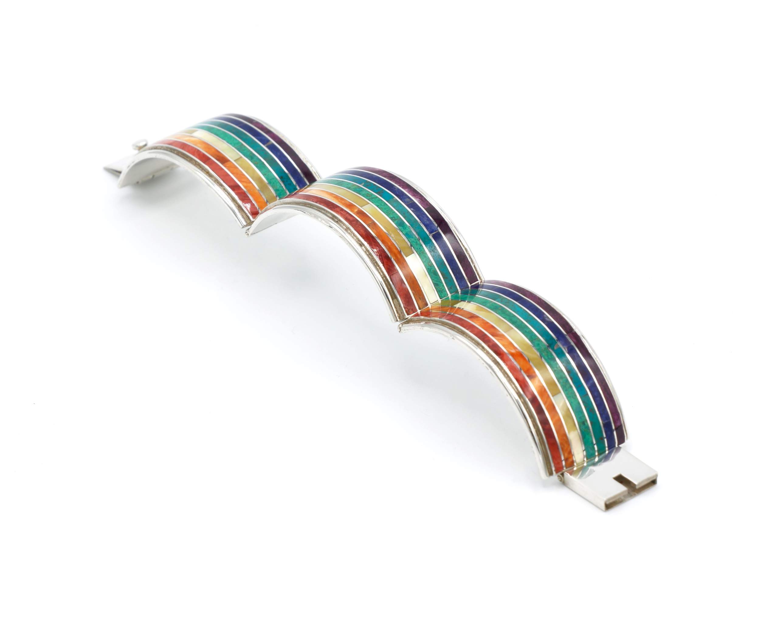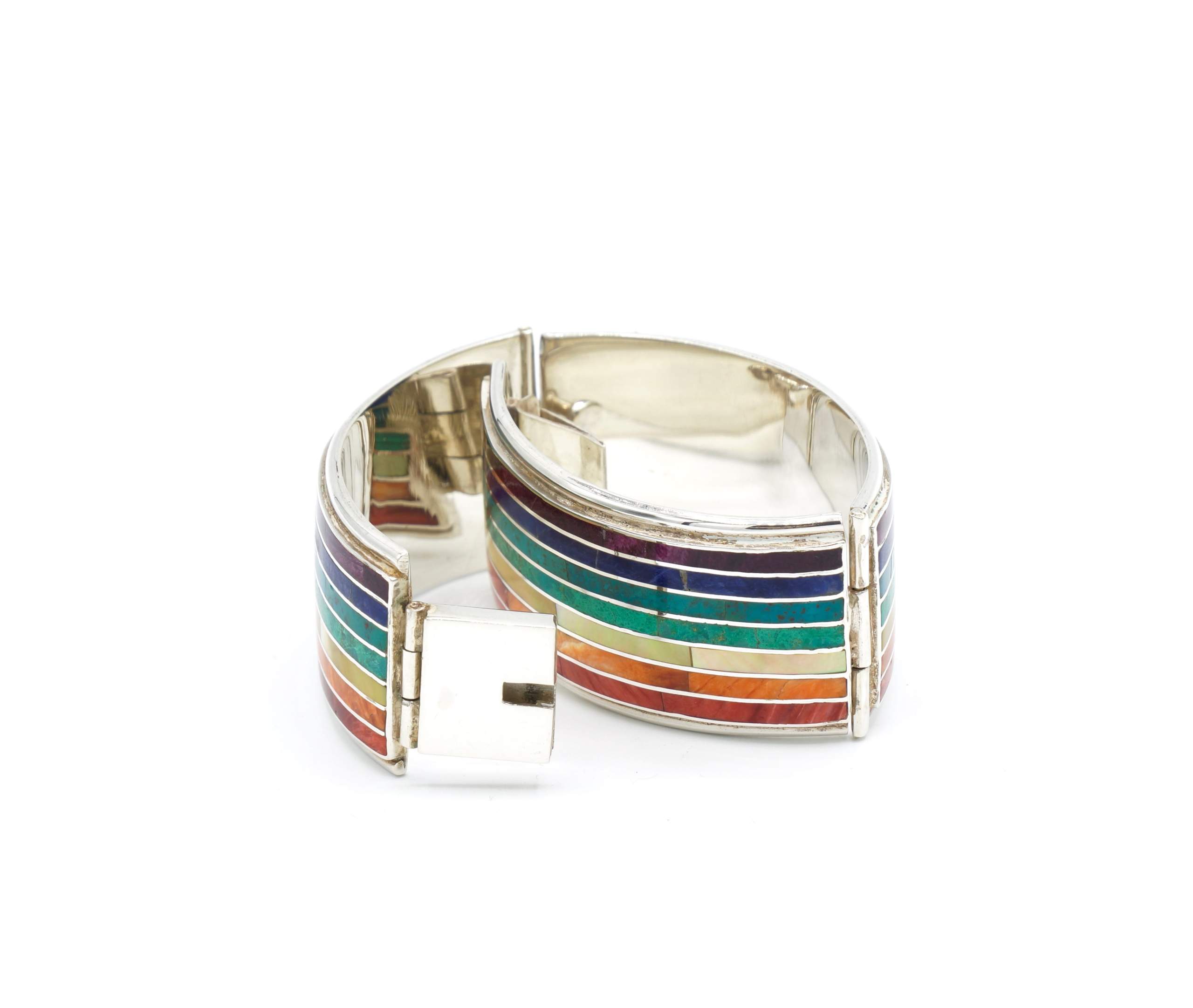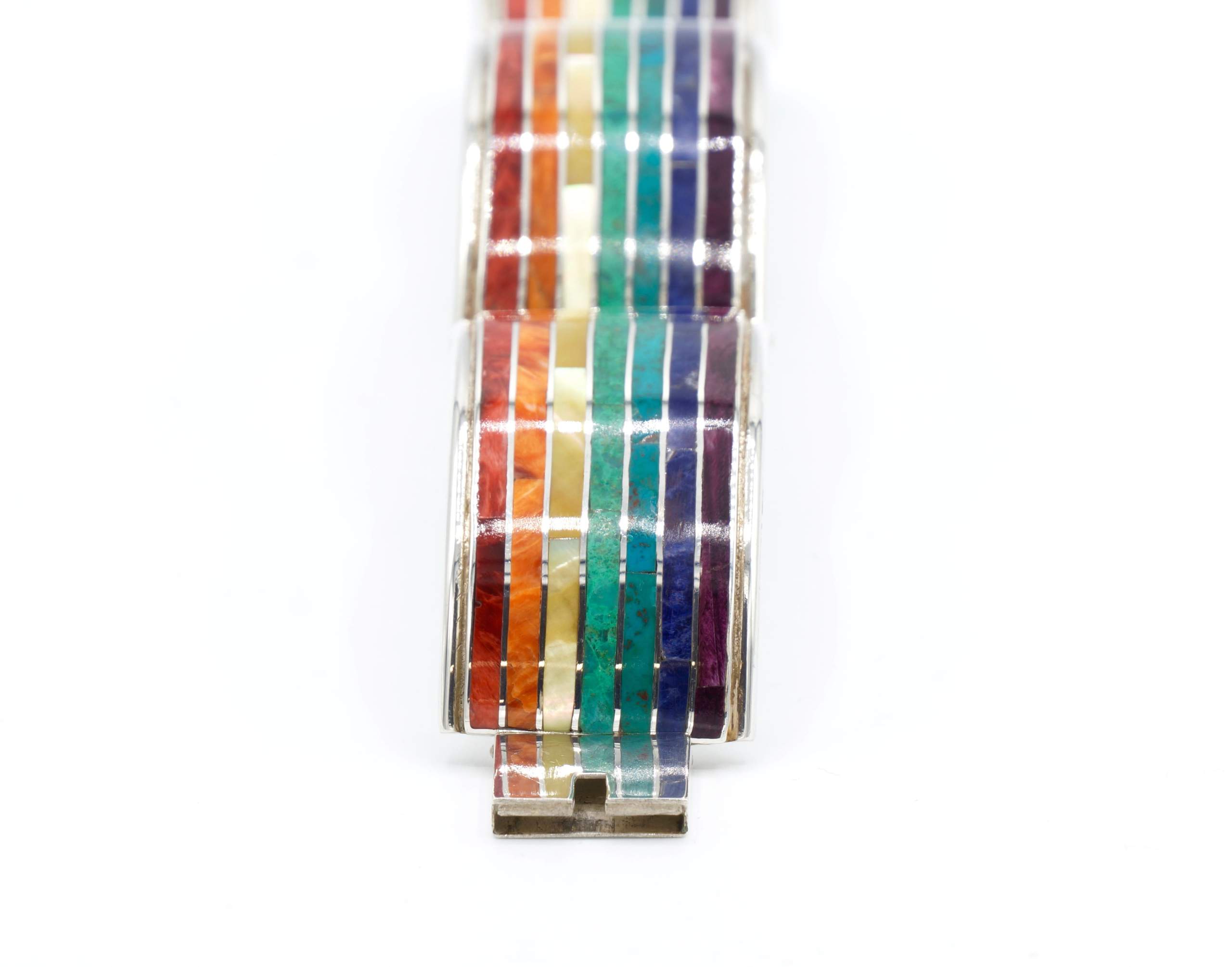 - Luxe zilveren armband ingelegd met prachtig fijn gesneden Spondylus schelpen, parelmoer, Abalone schelp, turkoois en Chrysocolla stenen