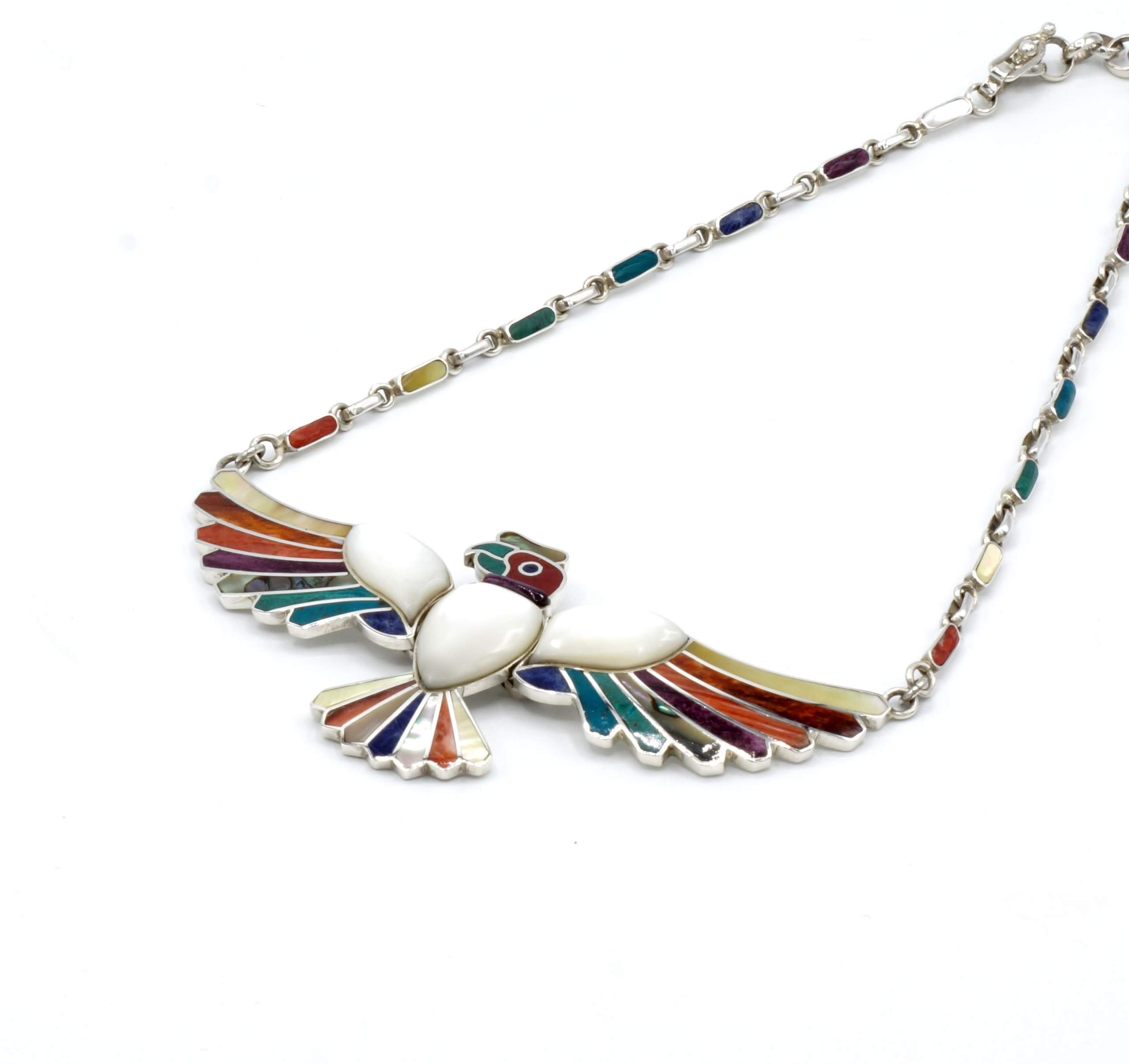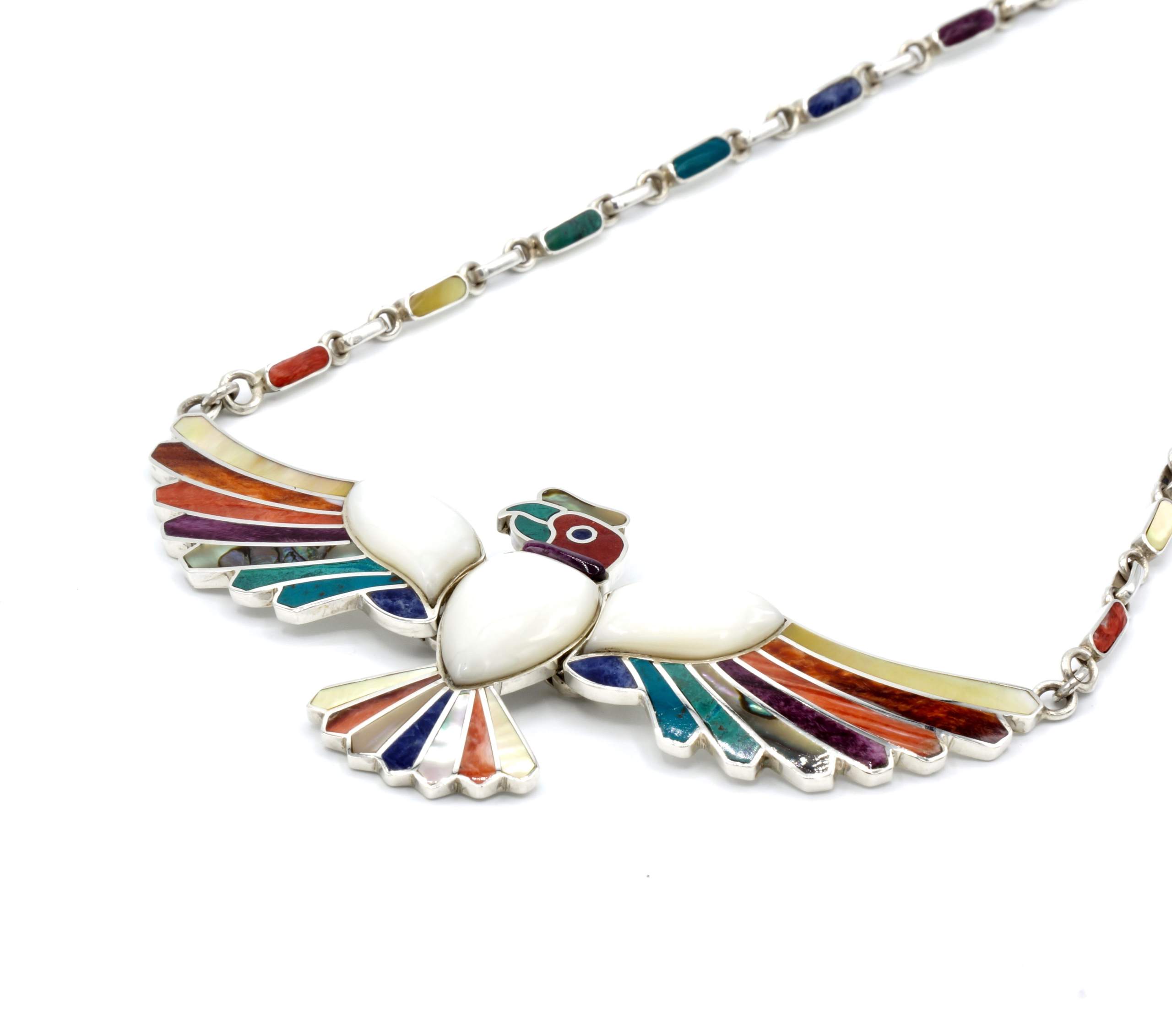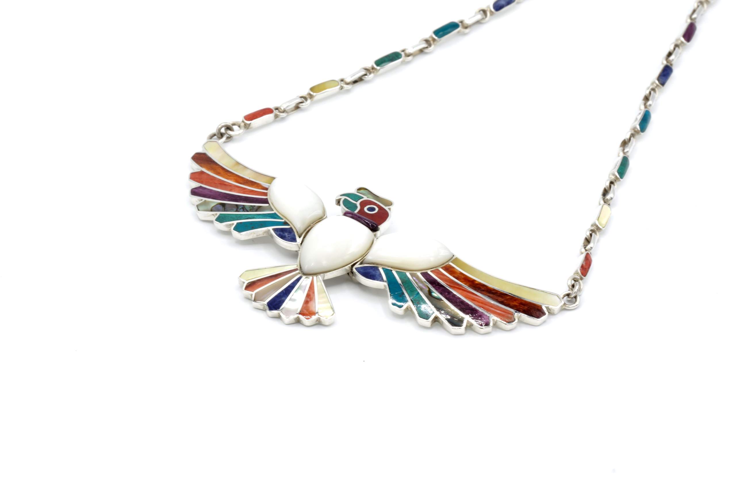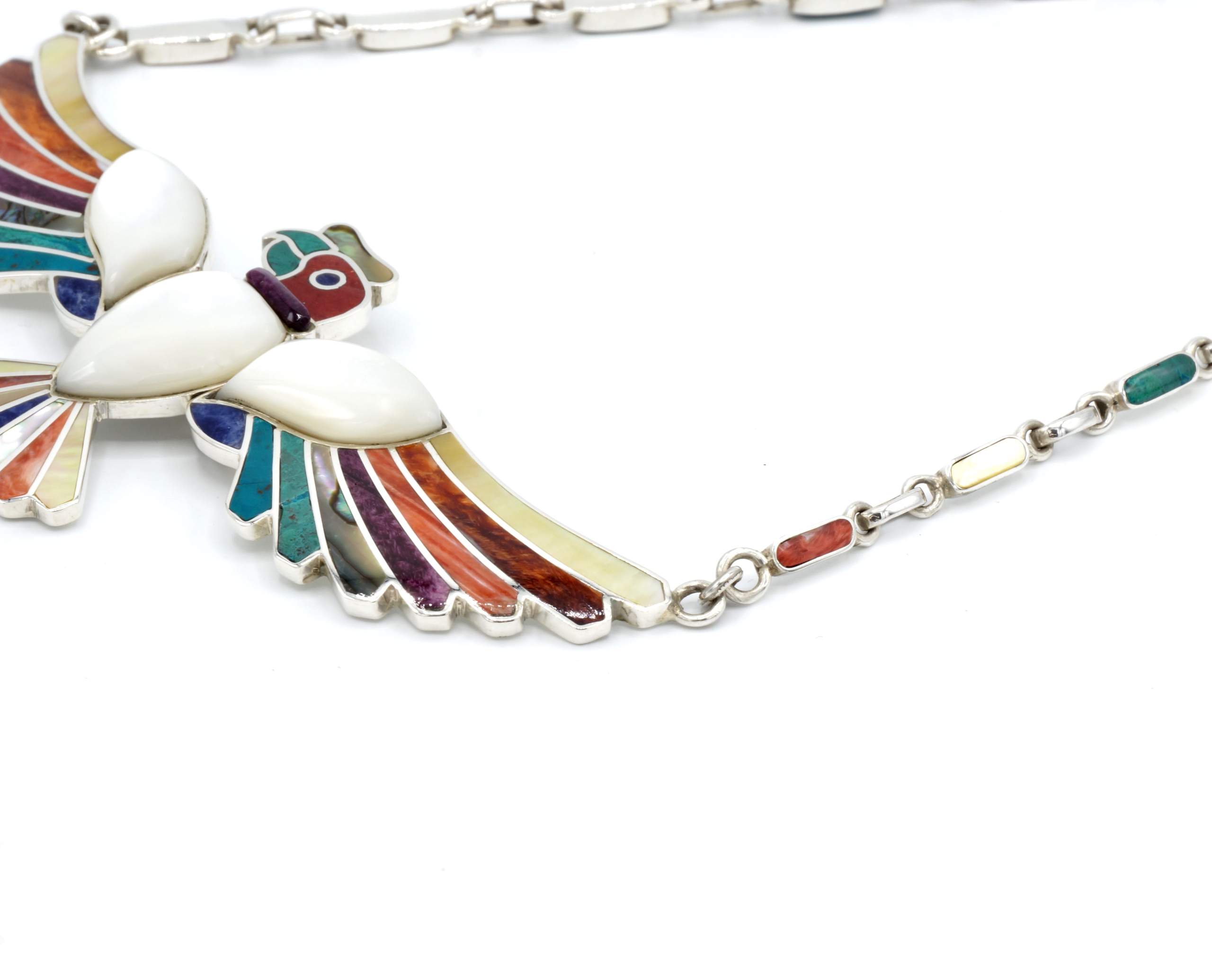 - Luxe zilveren collier ingelegd met prachtig fijn gesneden Spondylus schelpen, parelmoer, Abalone schelp, turkoois en Chrysocolla stenen