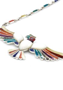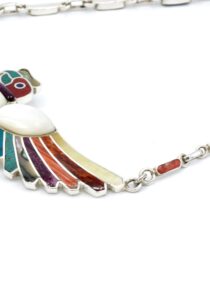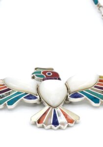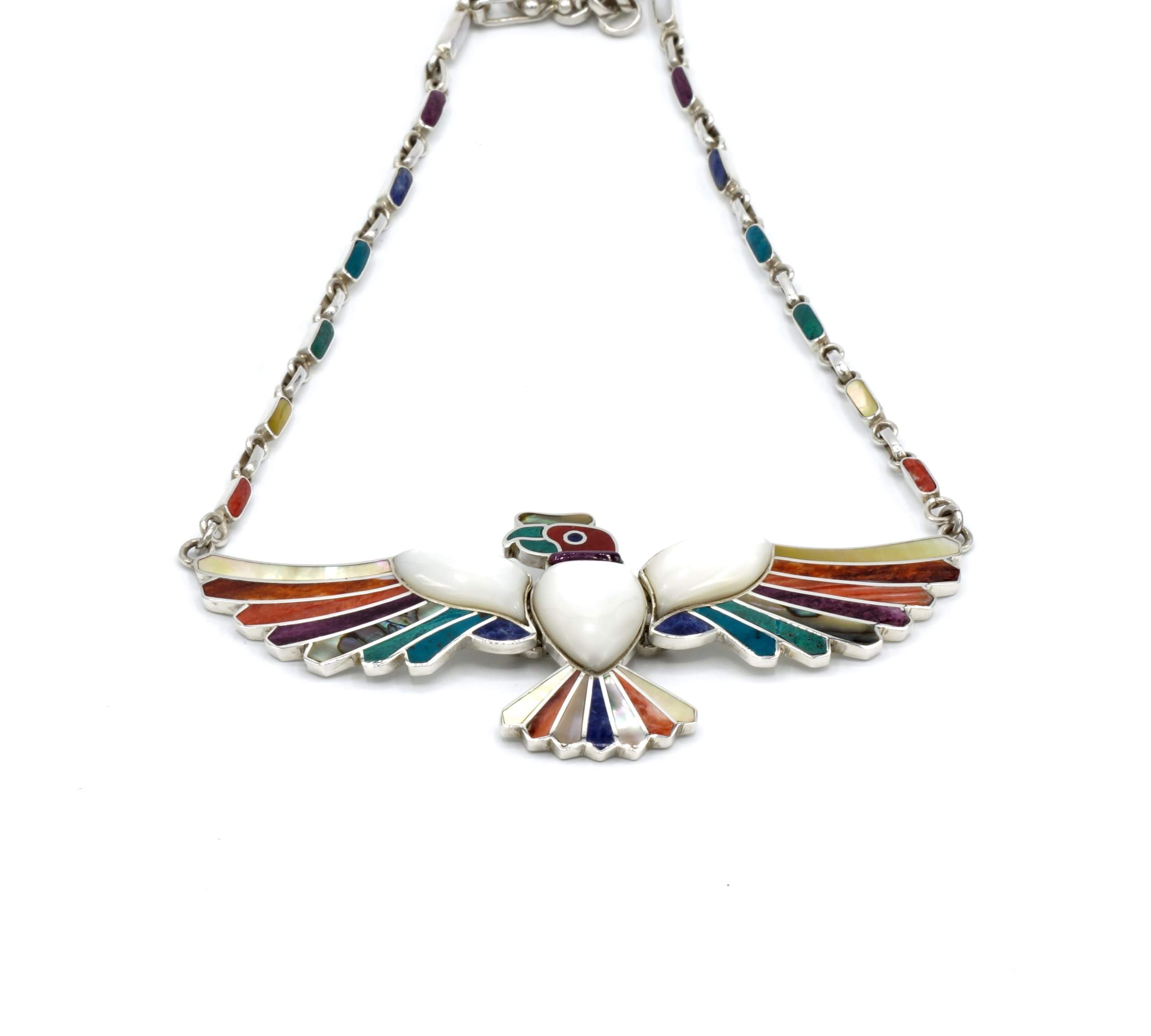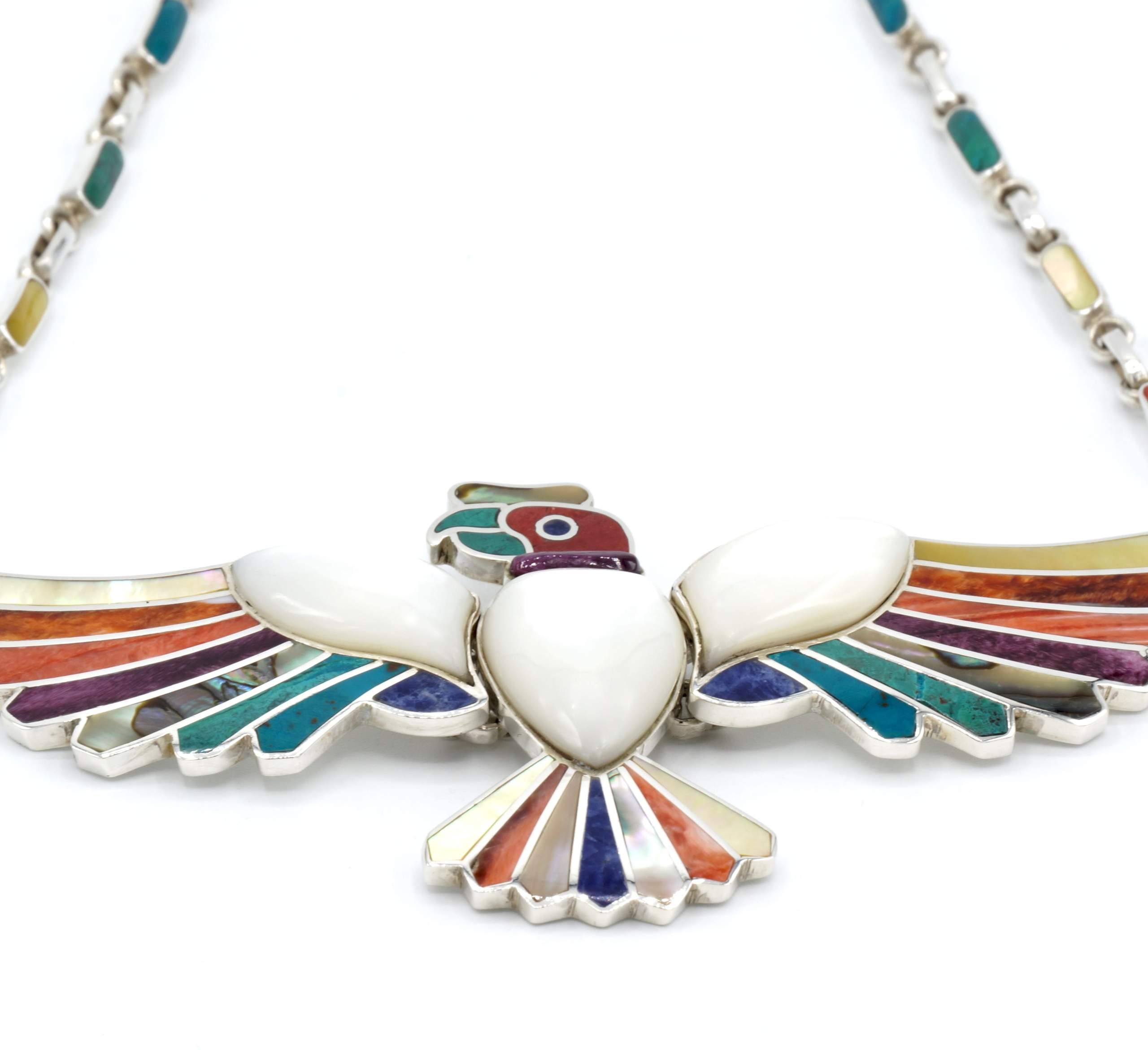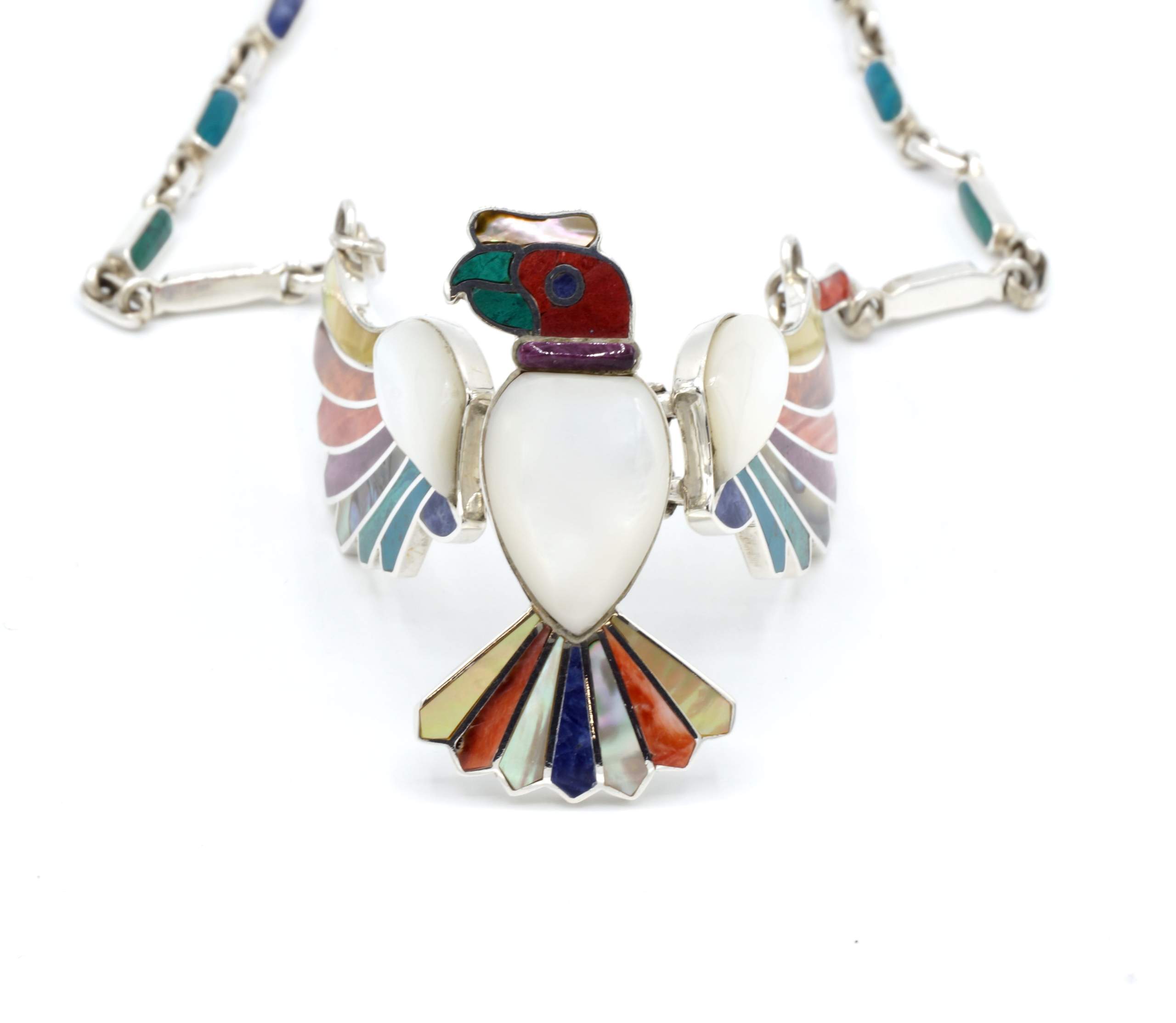 - Luxe zilveren collier ingelegd met prachtig fijn gesneden Spondylus schelpen, parelmoer, Abalone schelp, turkoois en Chrysocolla stenen