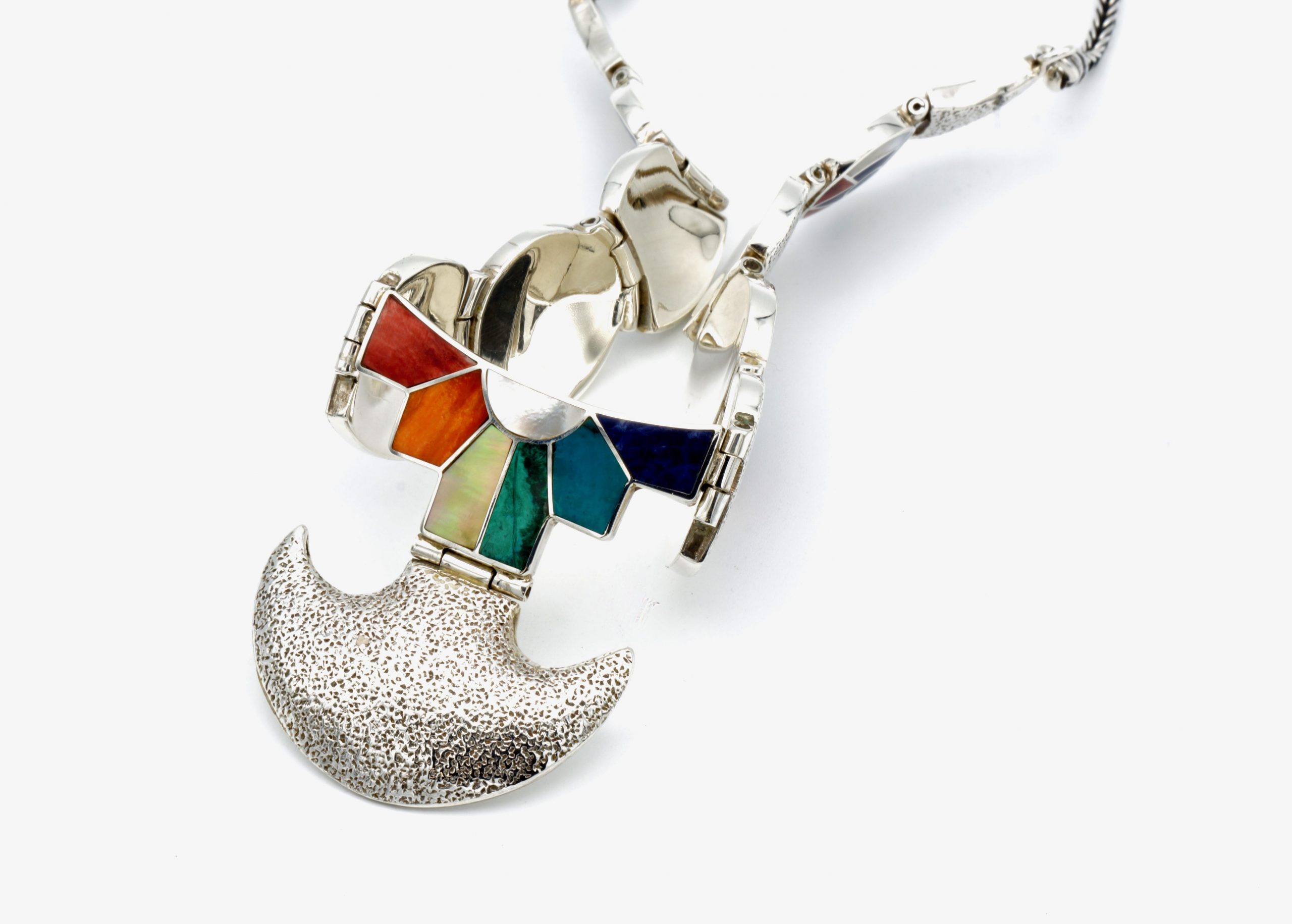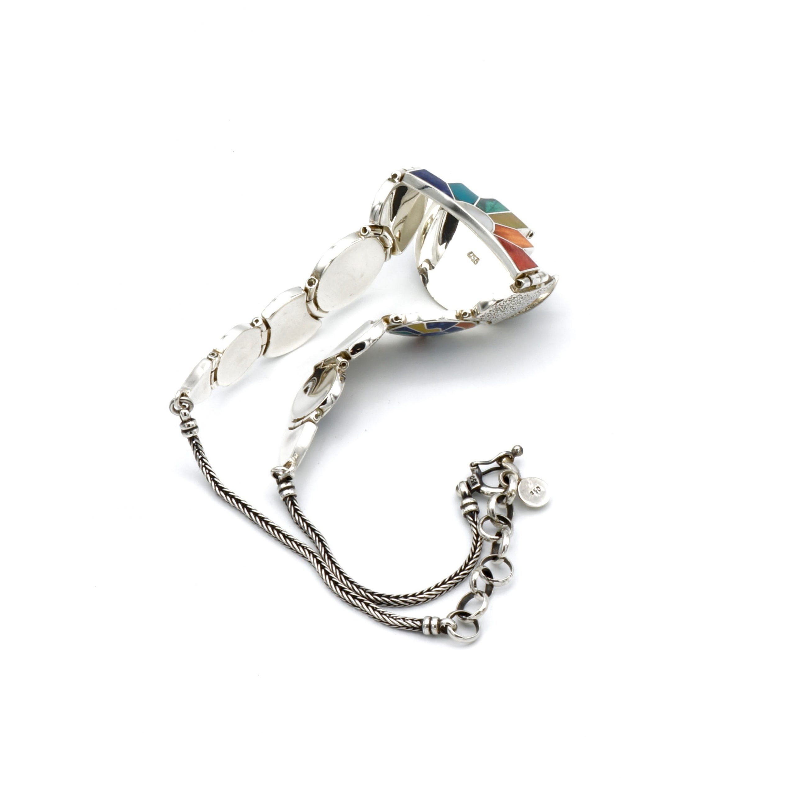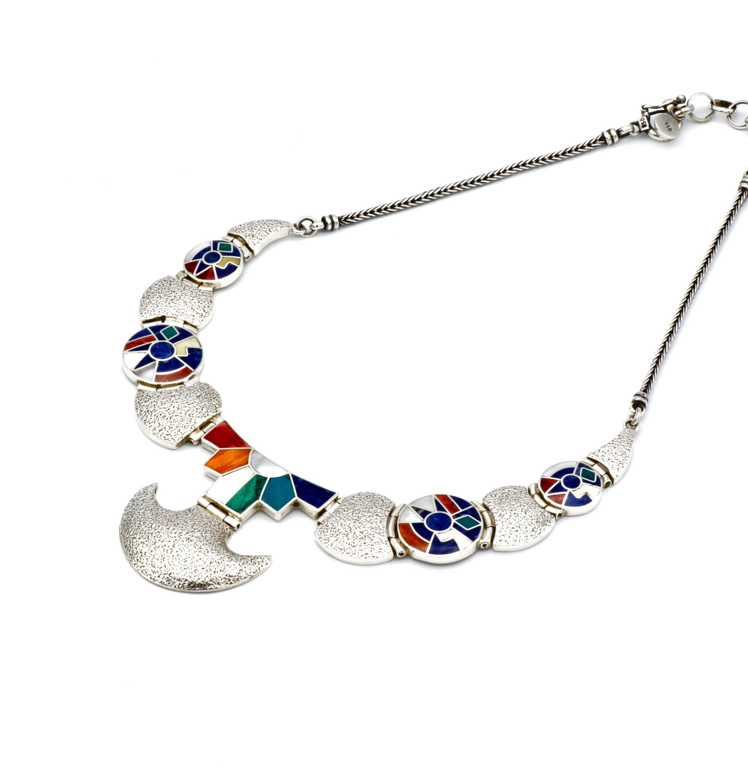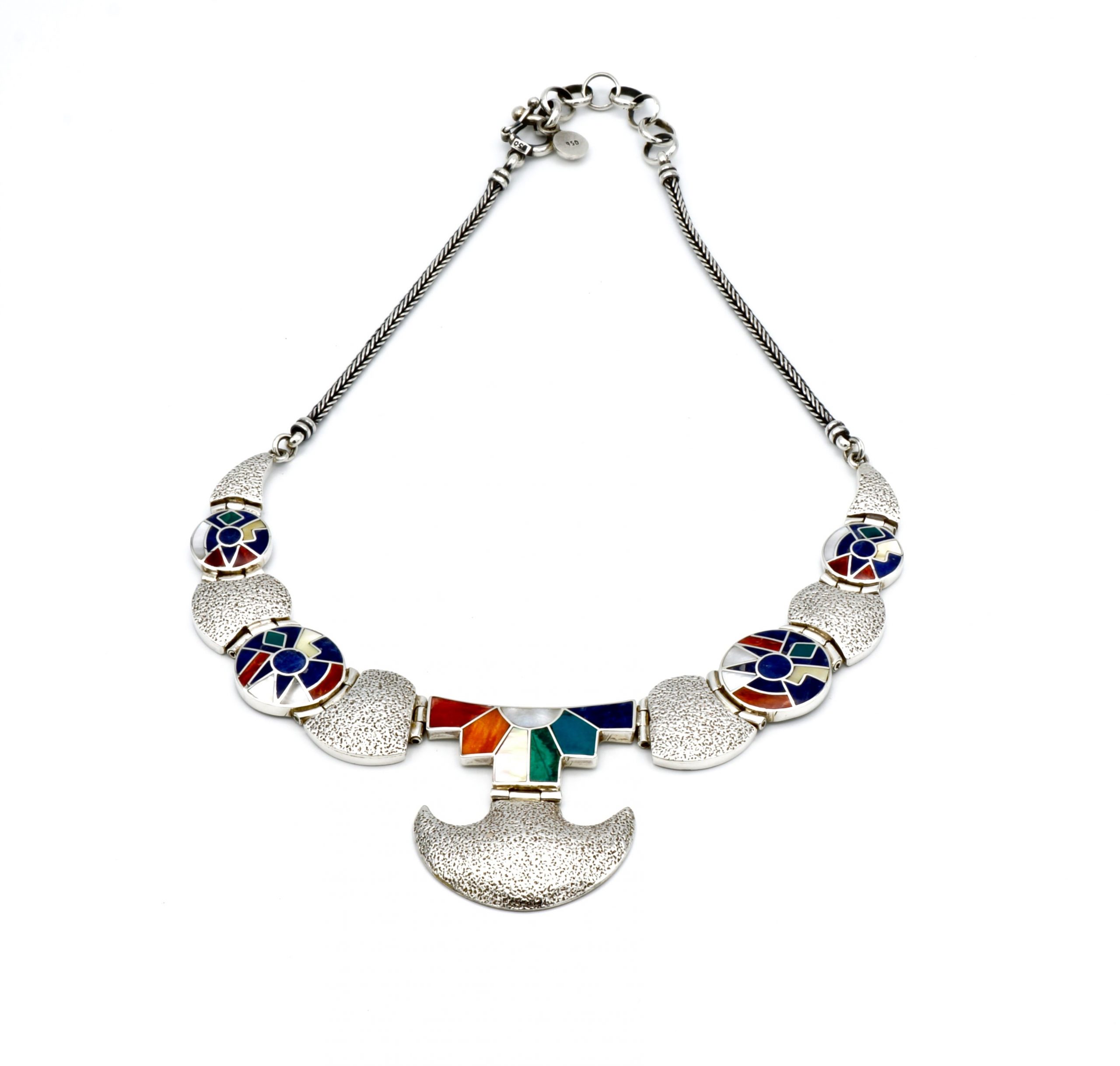 - Luxe zilveren collier ingelegd met prachtig fijn gesneden Spondylus schelpen, parelmoer, Abalone schelp, turkoois en Chrysocolla stenen
