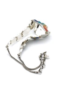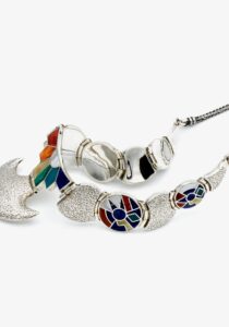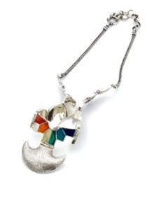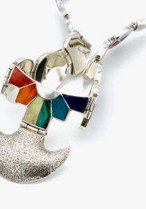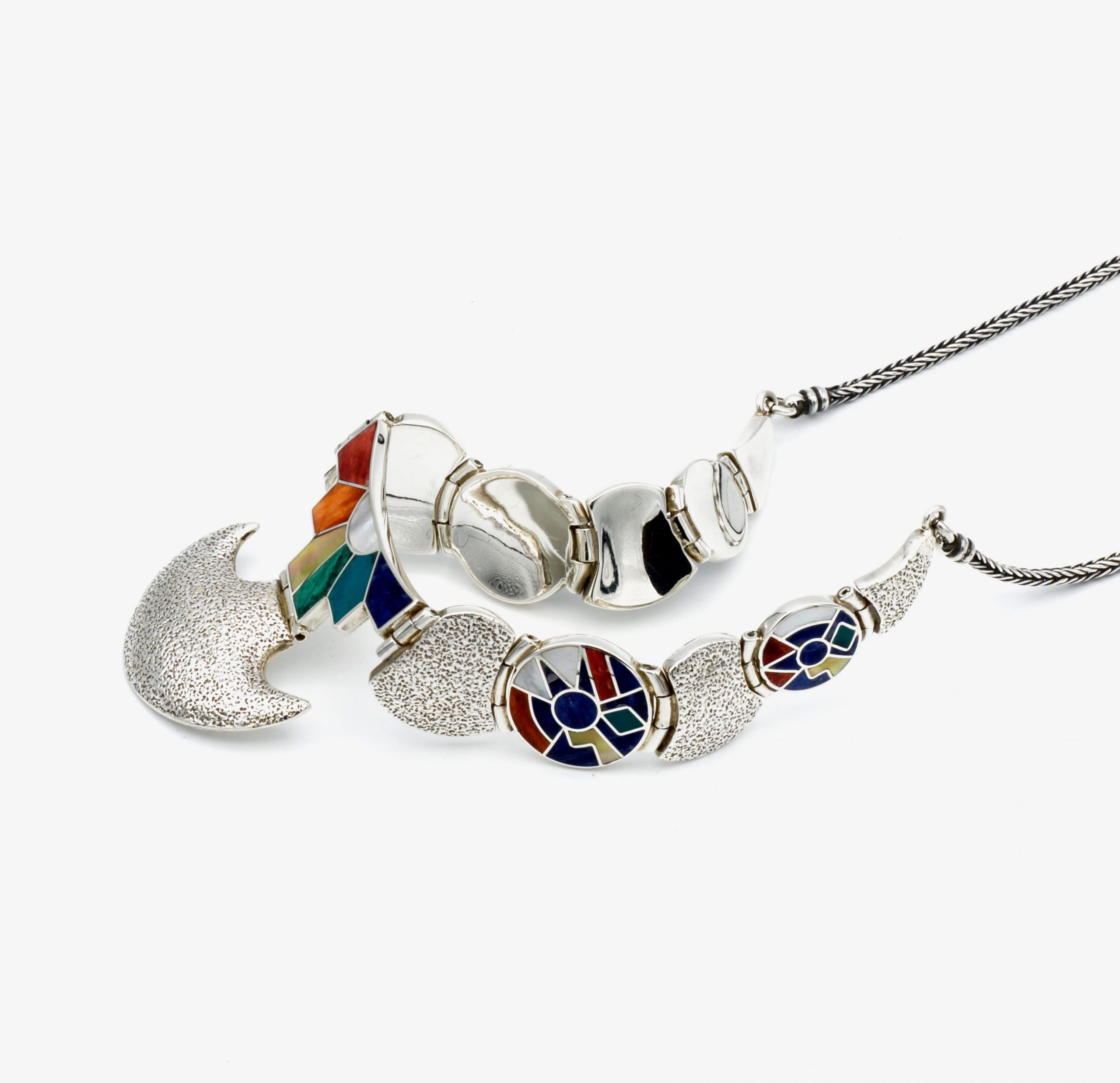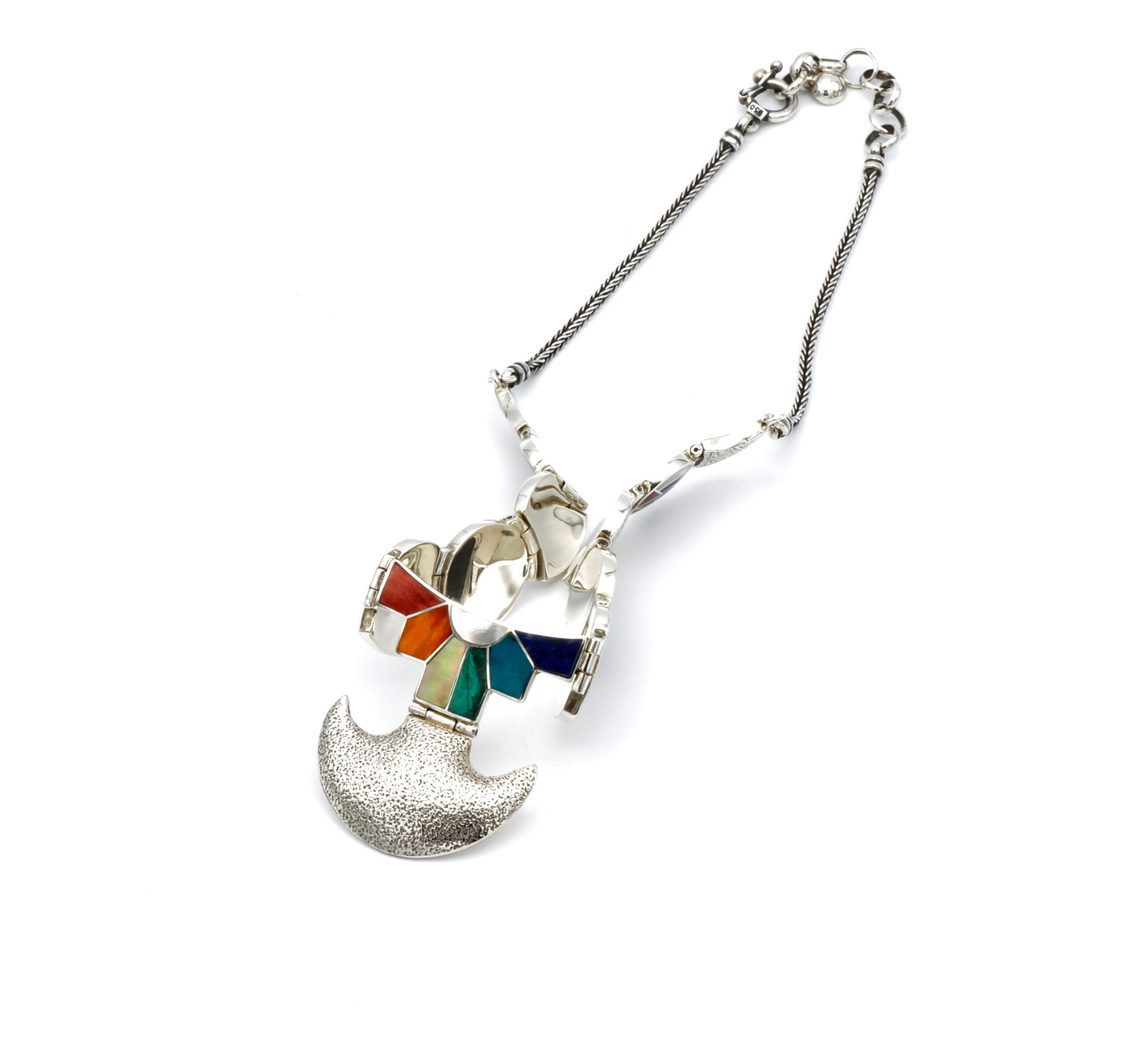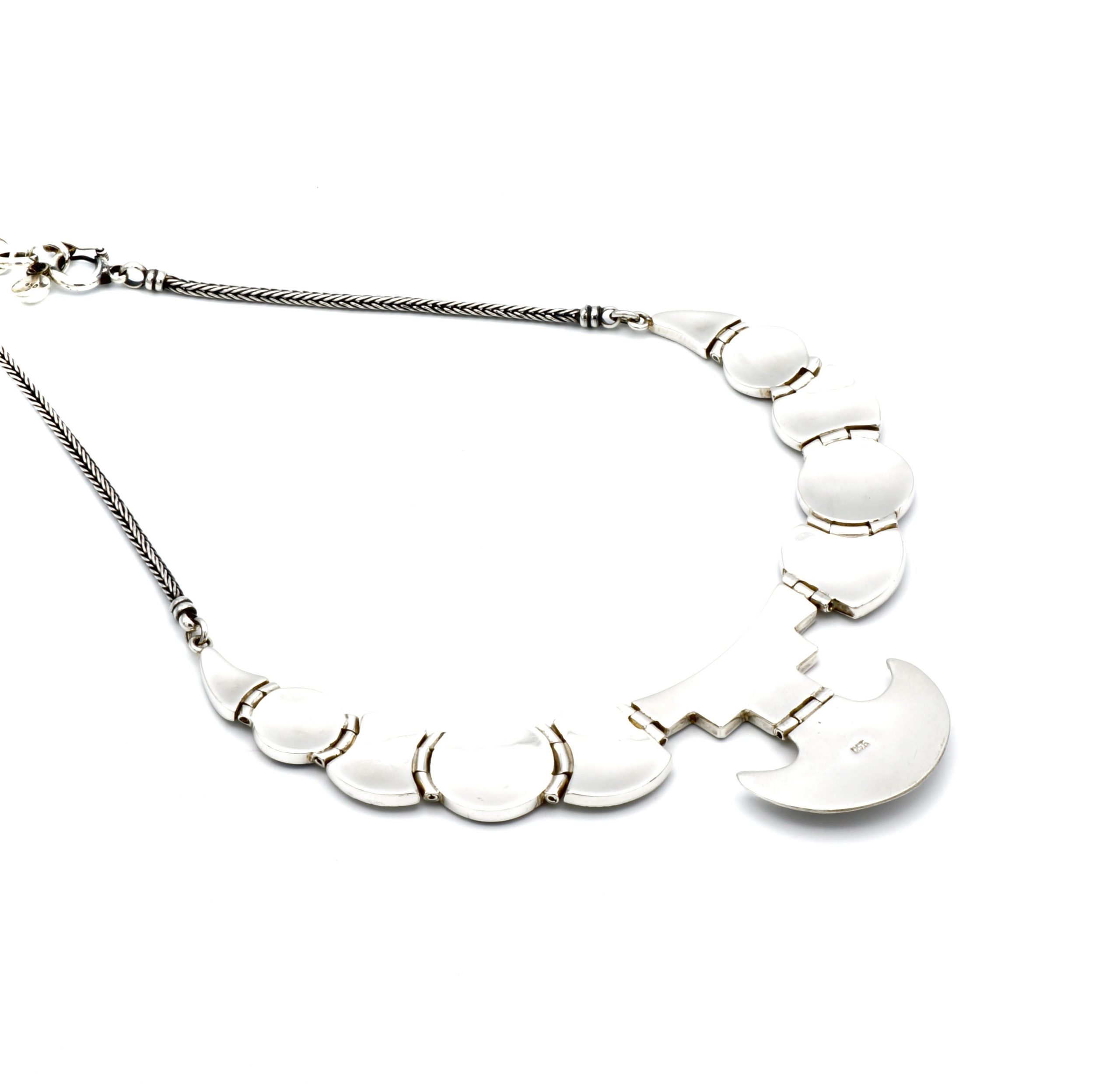 - Luxe zilveren collier ingelegd met prachtig fijn gesneden Spondylus schelpen, parelmoer, Abalone schelp, turkoois en Chrysocolla stenen