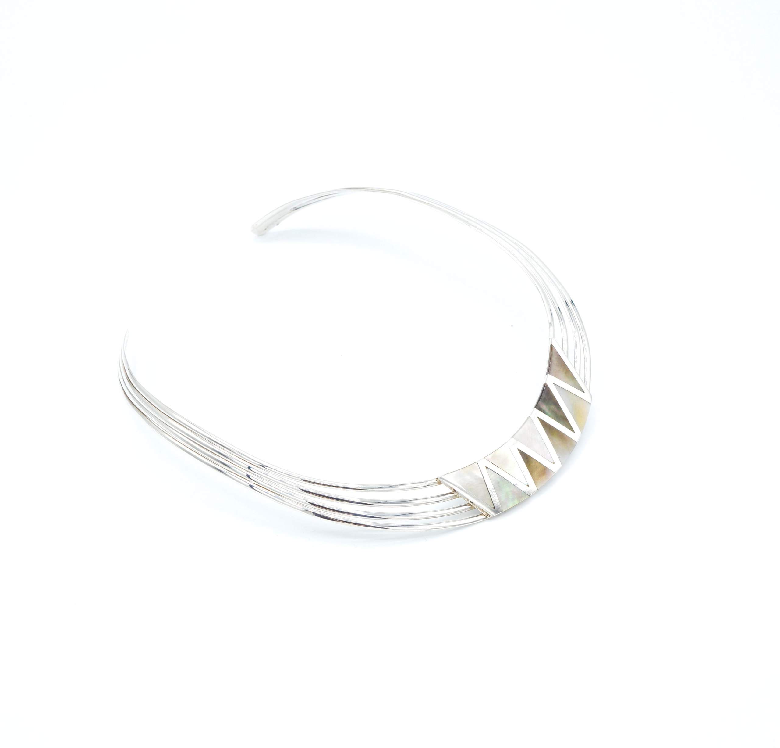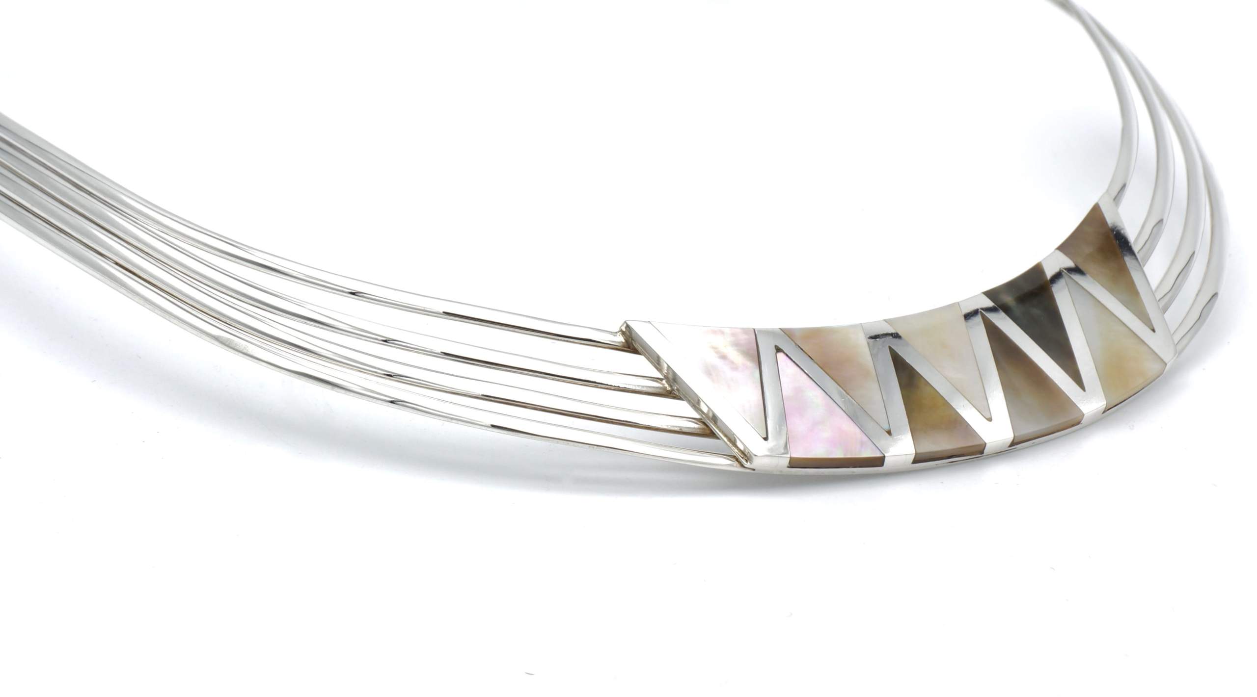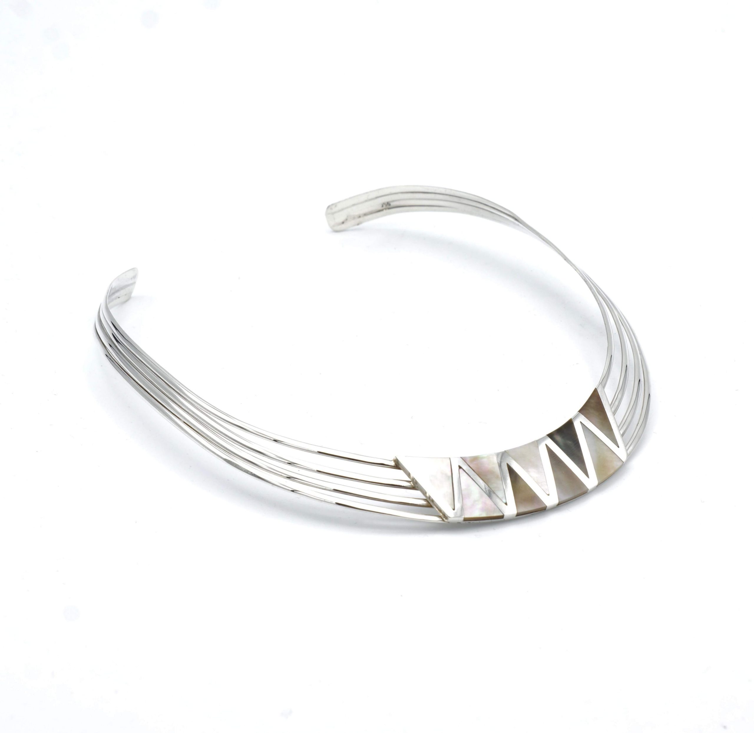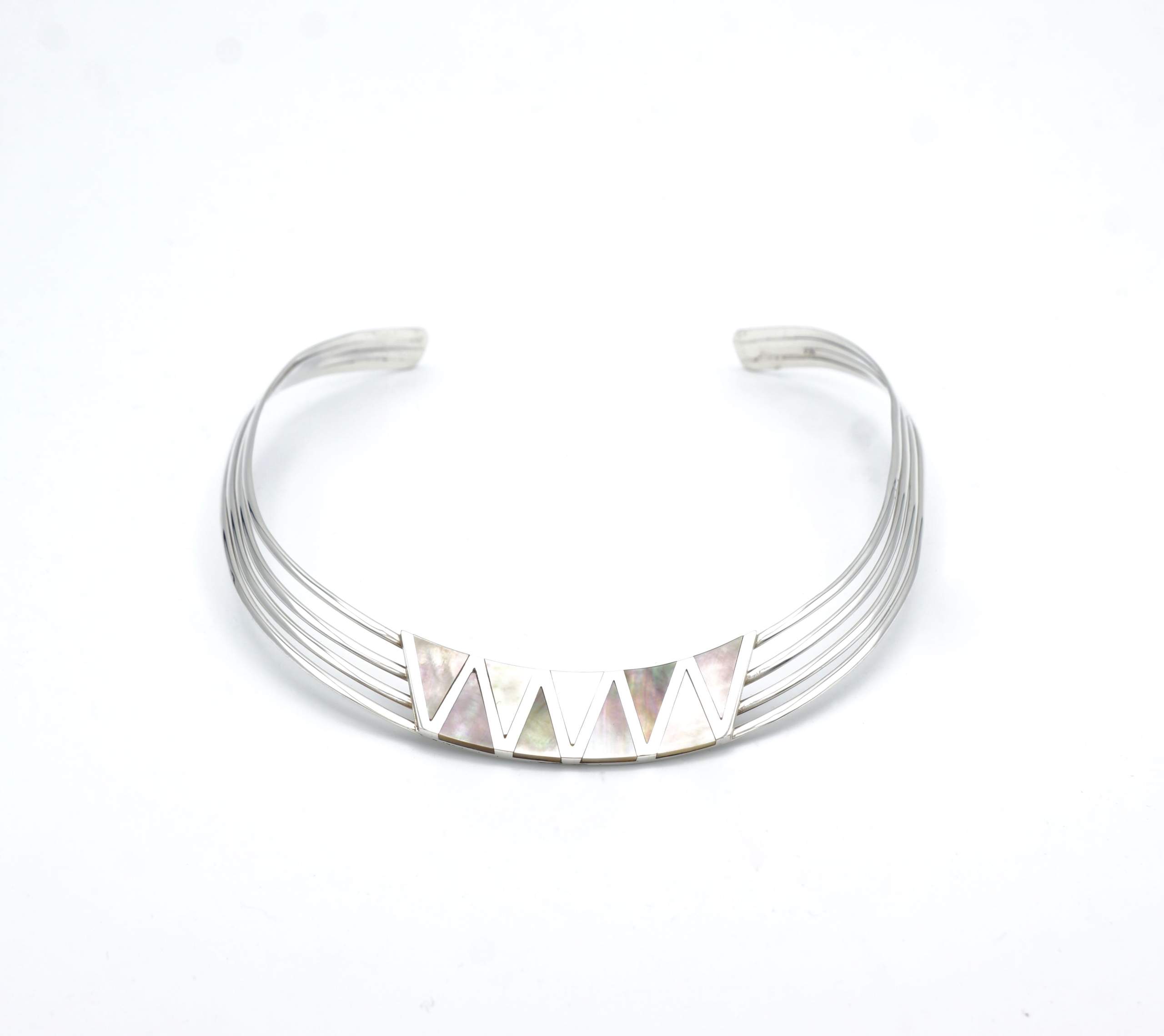 Dit collier is verstelbaar en zeer gemakkelijk om te dragen vanwege zijn zeer flexibele 950 puur zilver. De paarlemoer driehoeken worden zorgvuldig en professioneel gelegd in het zilver om een superieure afwerking te kunnen leveren. Dit collier is handgemaakt in Peru en zoals met alle Alpakah by 2be-aware producten, hebben wij slechts één op de voorraad. Mis deze kans niet om deze schat te kopen en bezit deze tijdloos design collier nu!