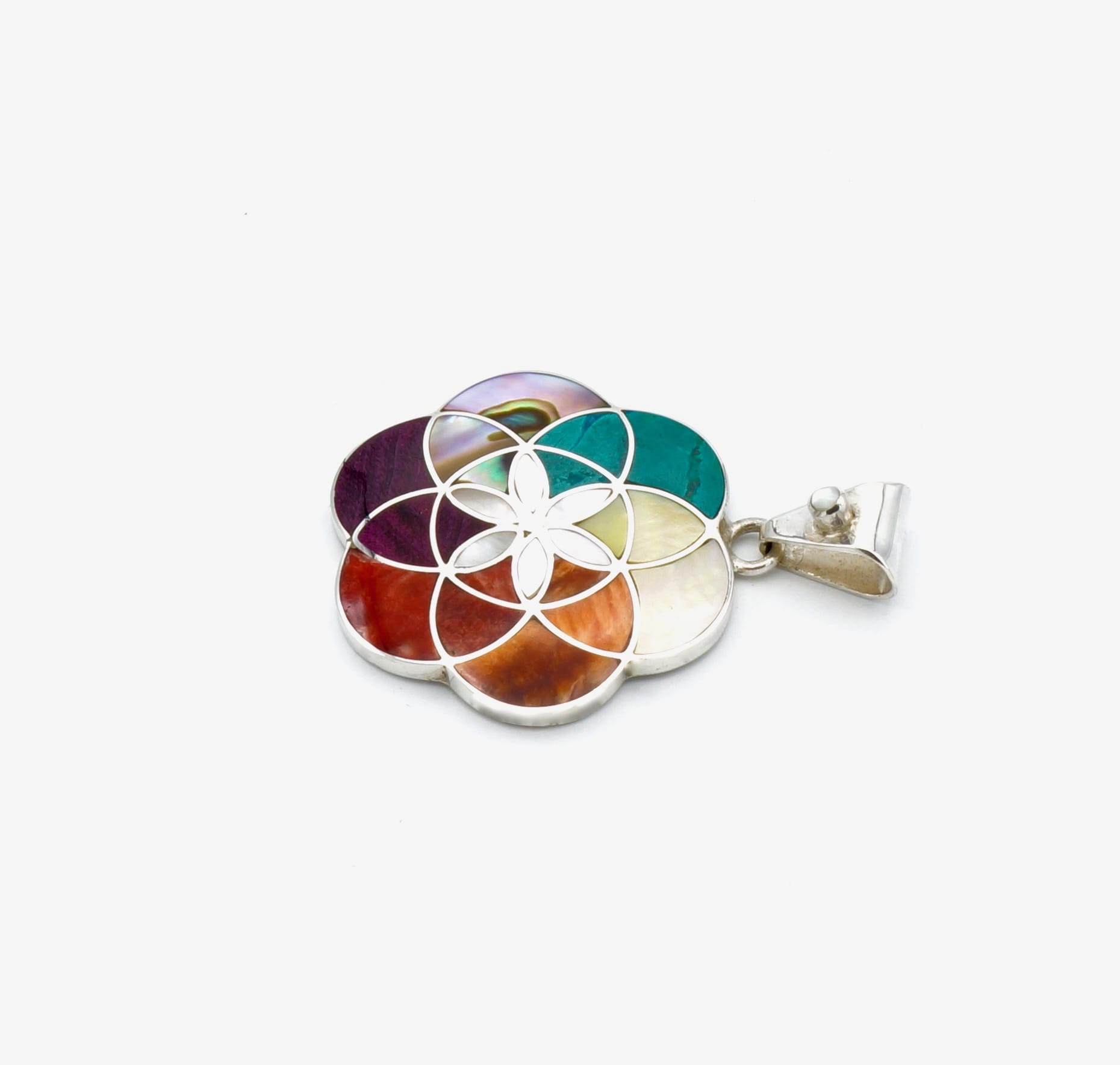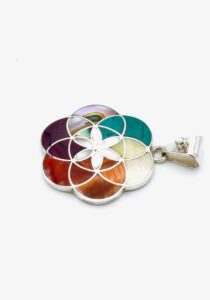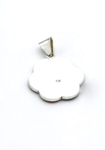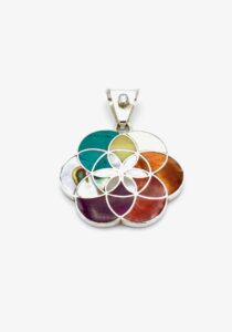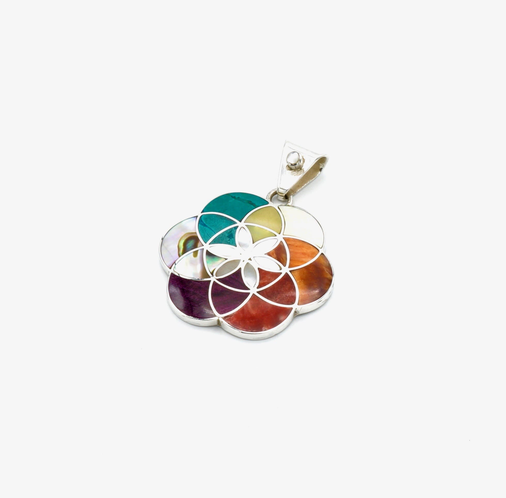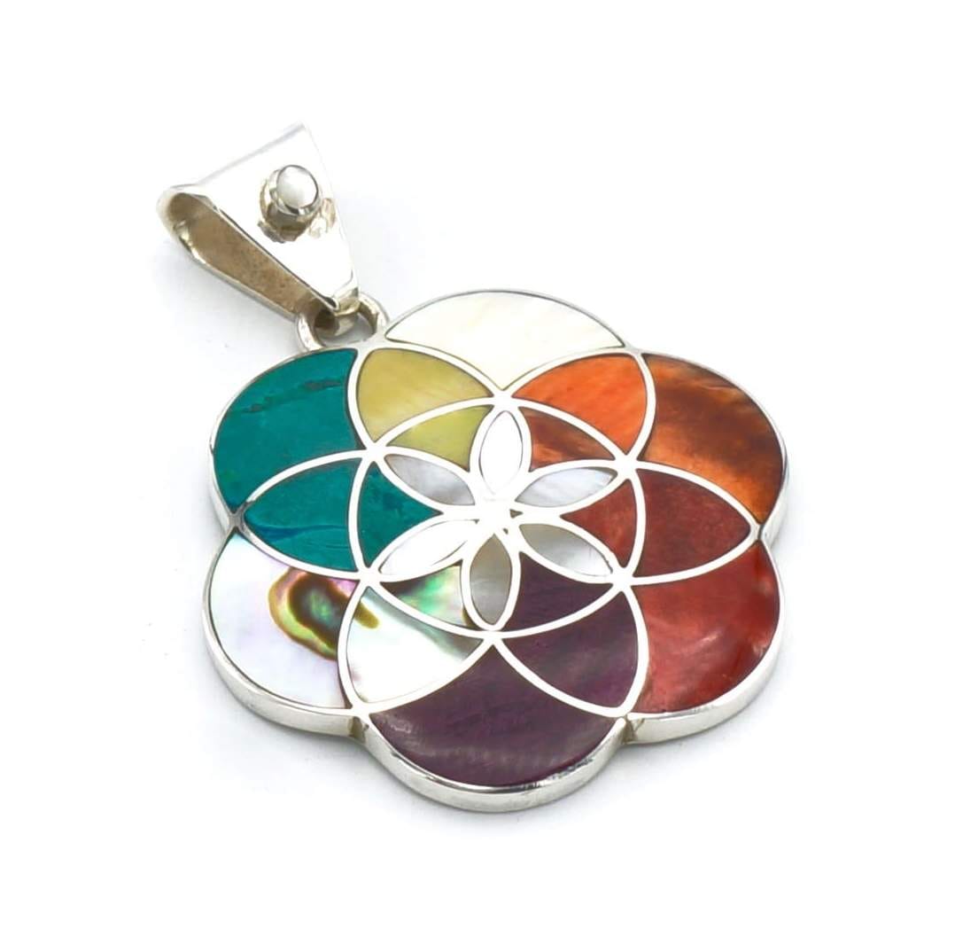 Deze prachtige, chique Tika hanger is handgemaakt van verfijnde, exclusieve Peruaanse stenen en schelpen, die perfect zijn ingelegd in een zilveren design.