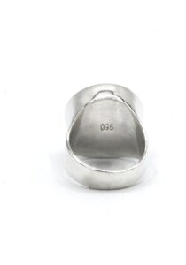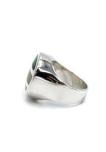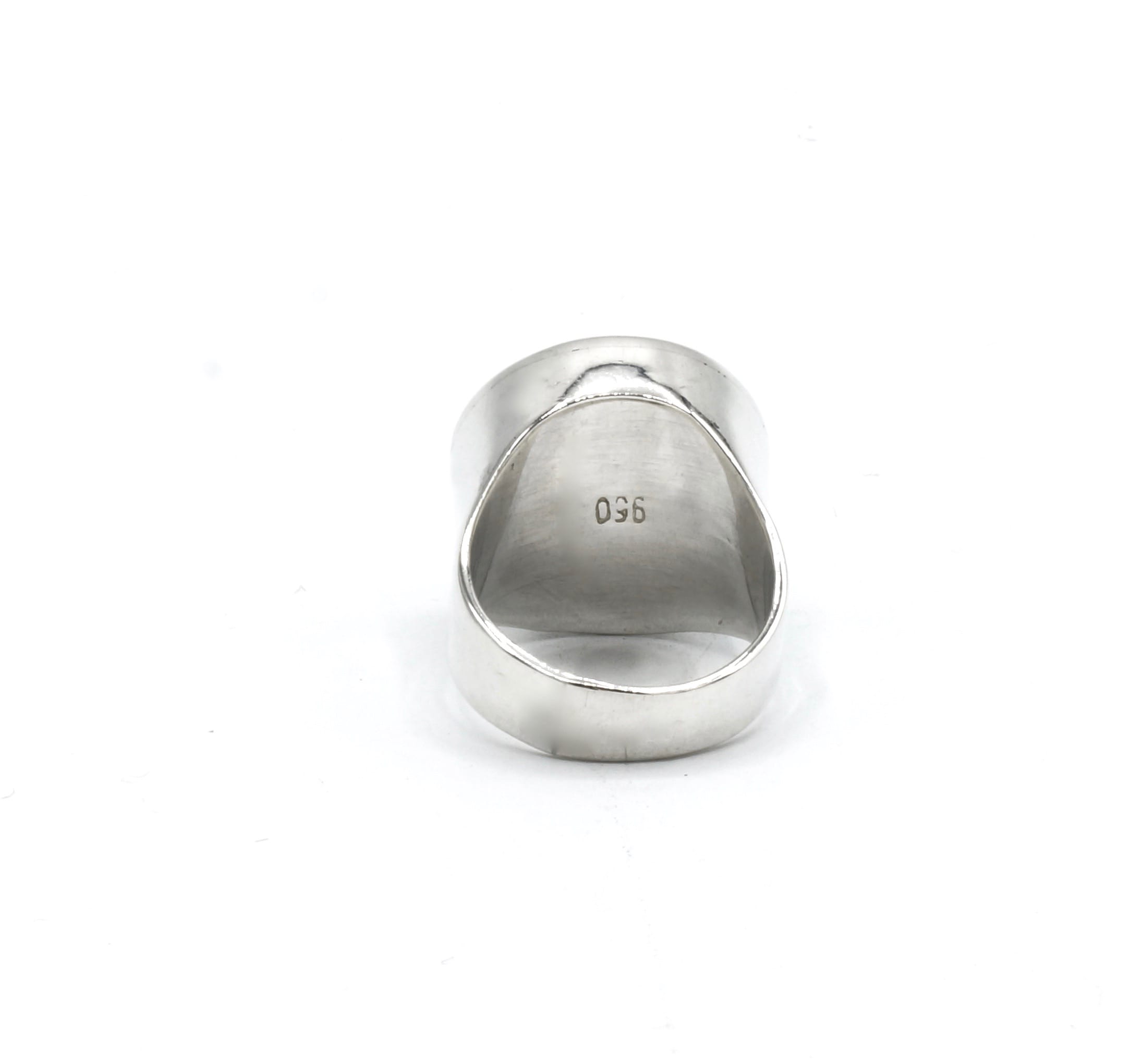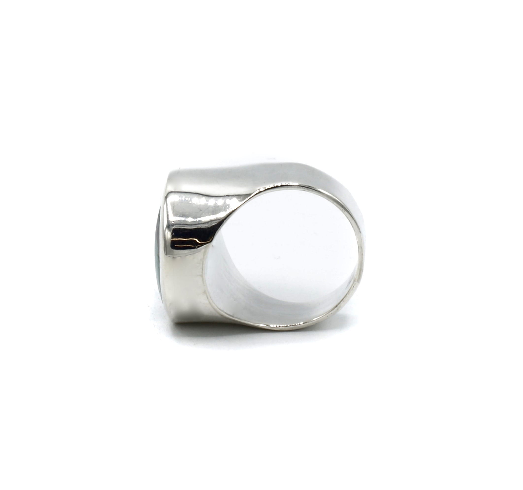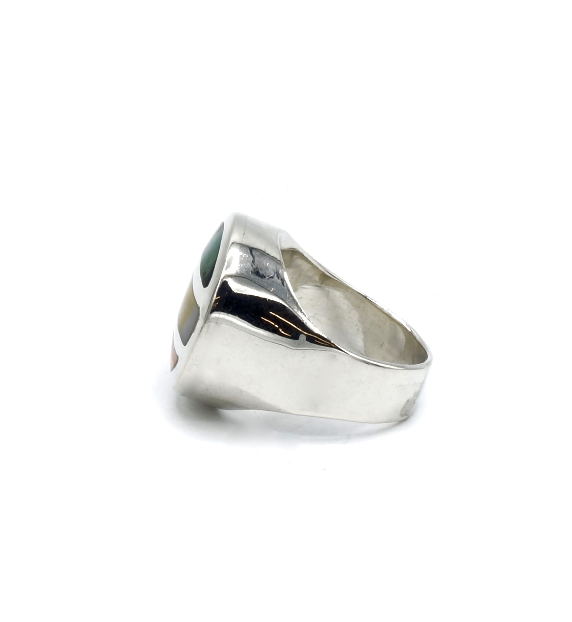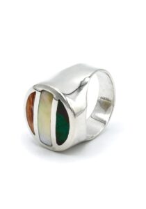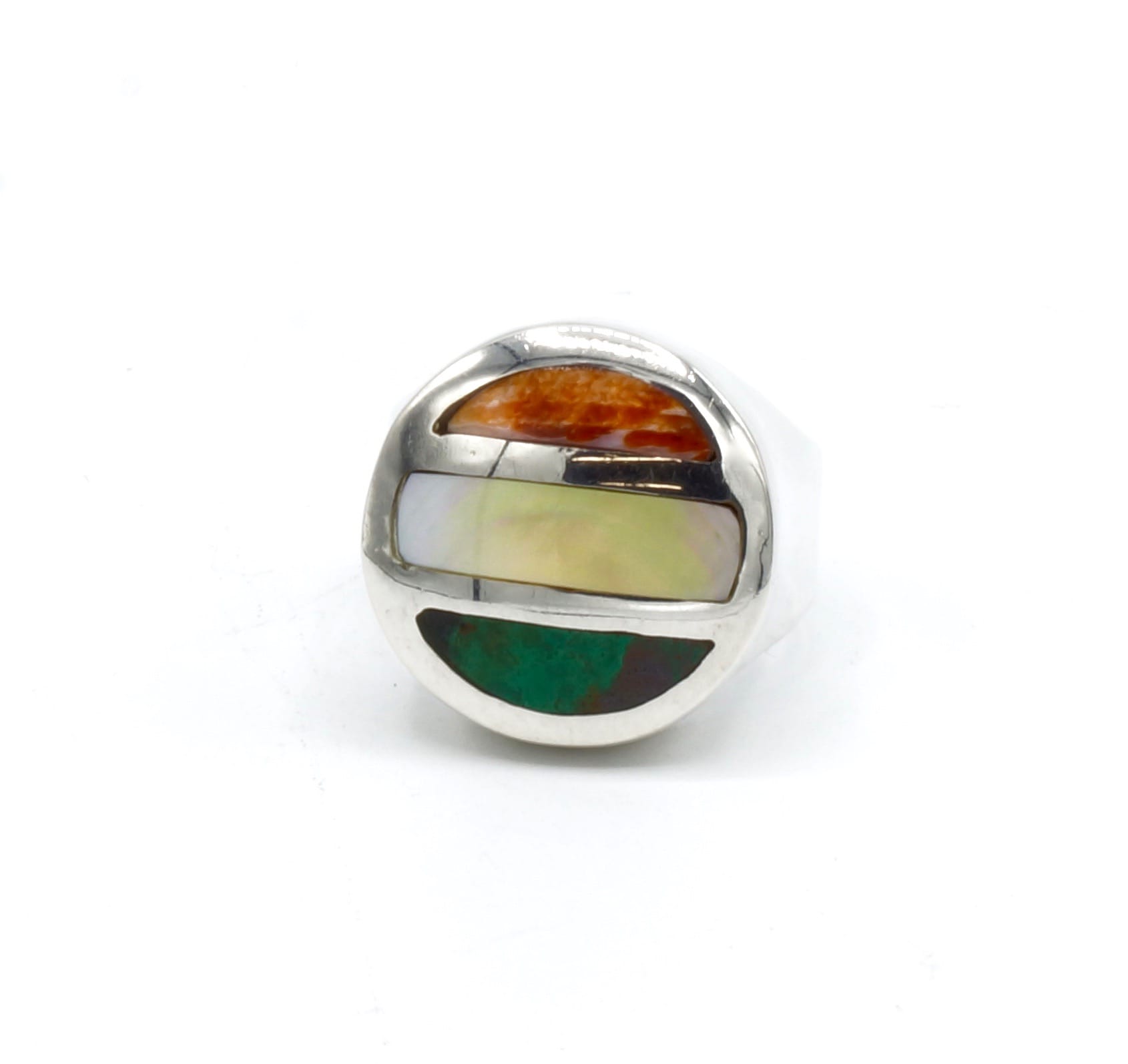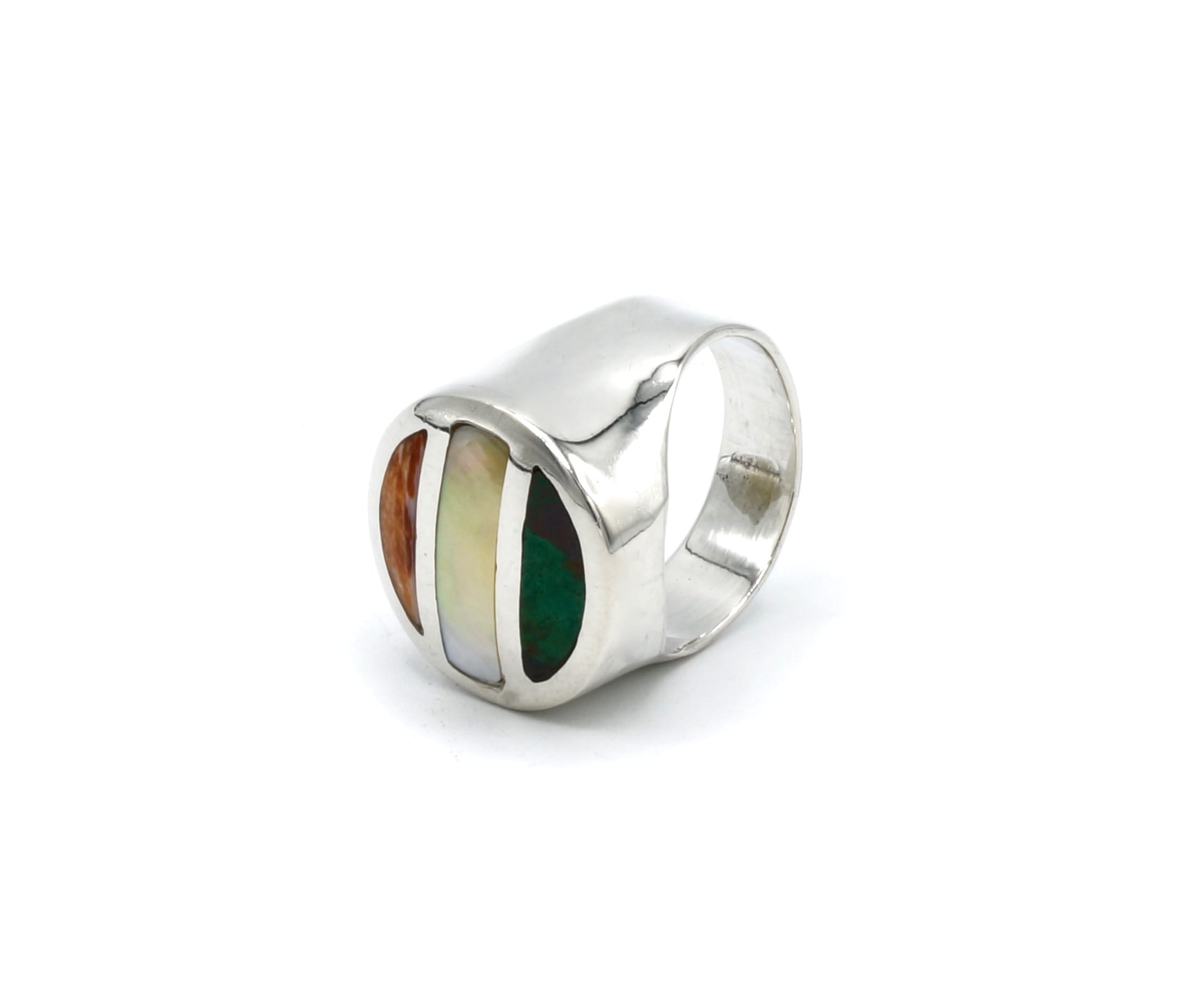 - Luxe zilveren ring ingelegd met prachtige, fijn gesneden oranje Spondylus schelp, geel parlemoer en Chrysocolla