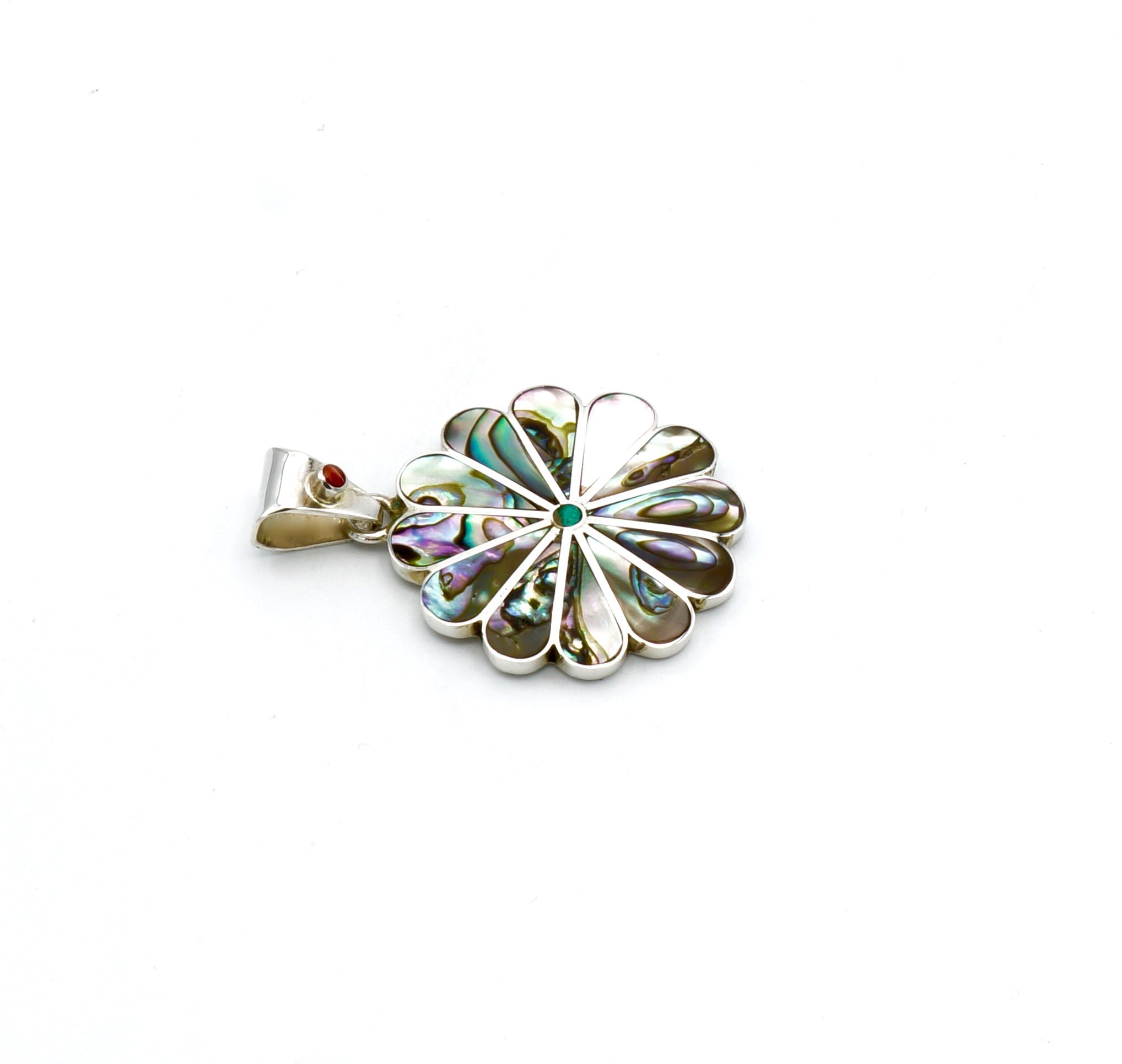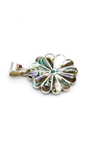 Deze prachtige, geometrische hanger is handgemaakt van verfijnde, exclusieve Peruaanse Abalone schelpen, die perfect zijn ingelegd in een zilveren margriet ontwerp.