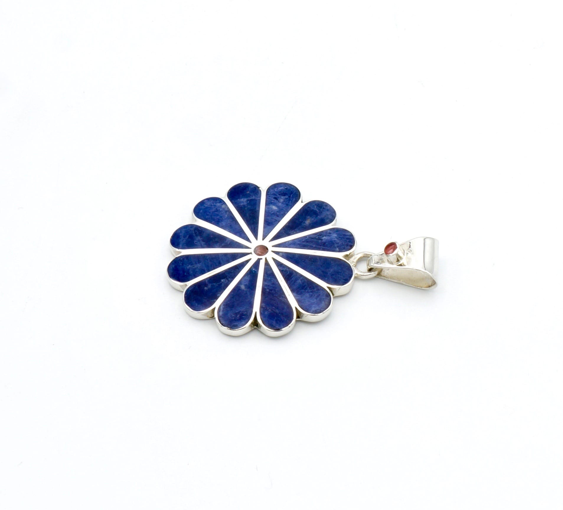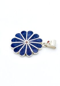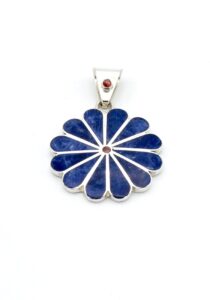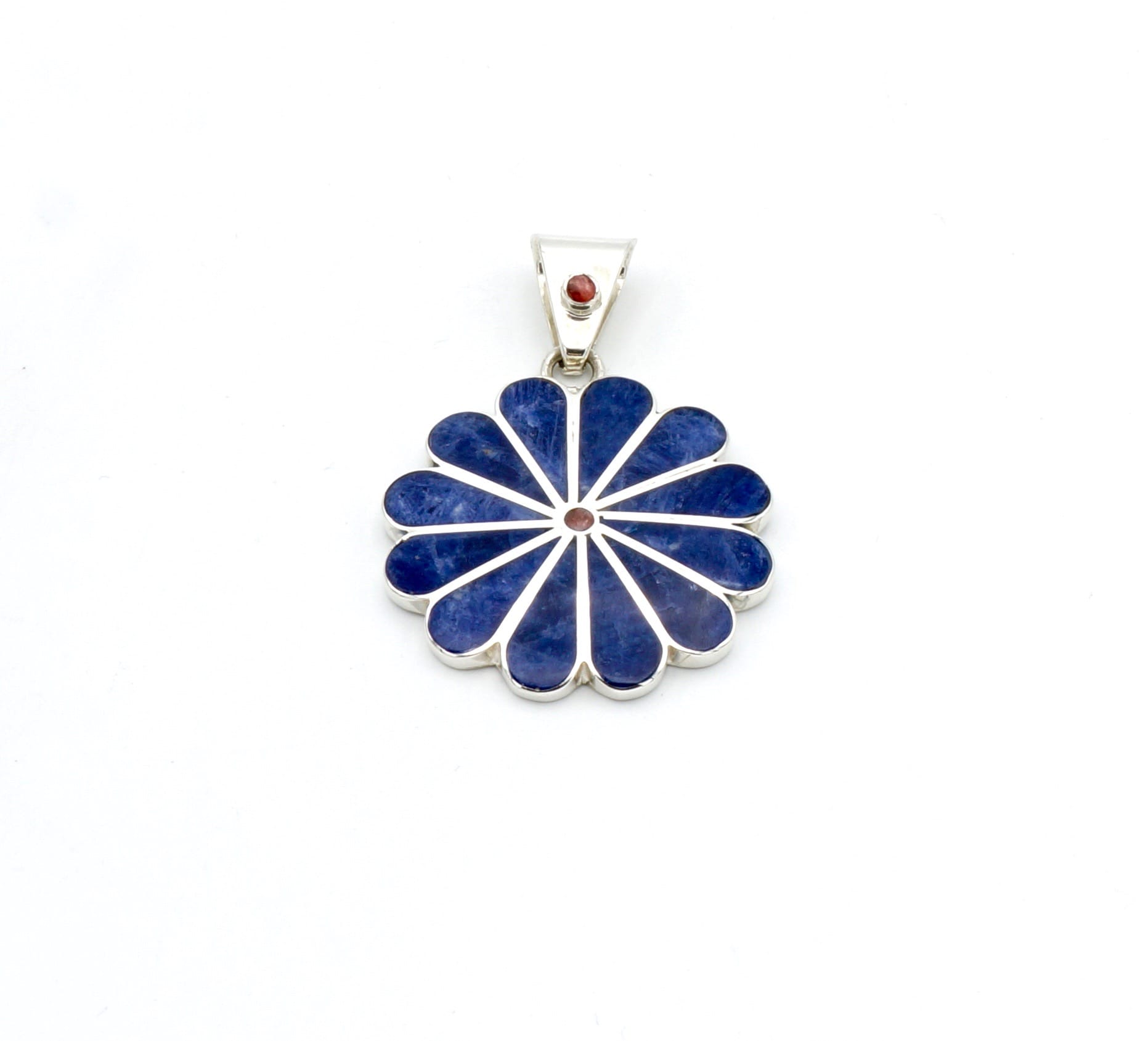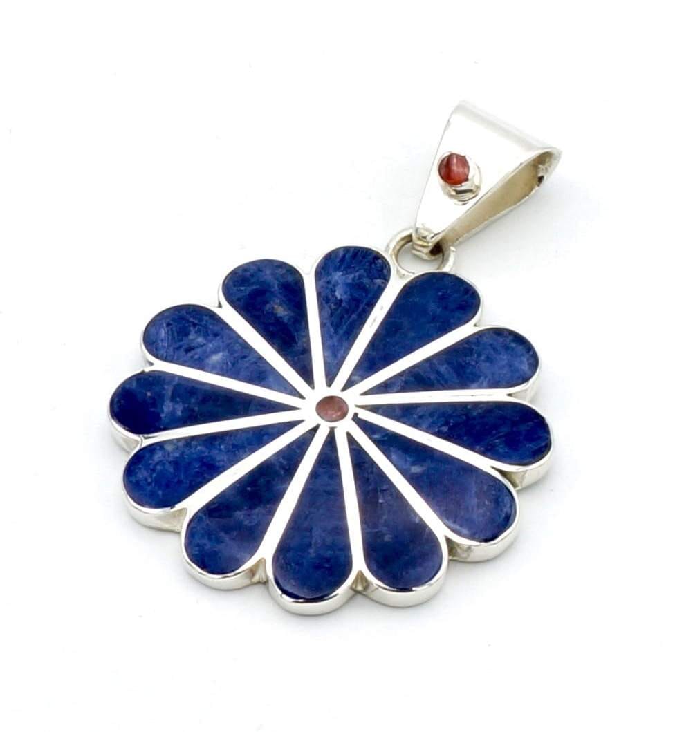 Deze mooie hanger is handgemaakt van verfijnde, exclusieve Sodaliet stenen, die perfect zijn ingelegd in een zilveren margriet ontwerp.
