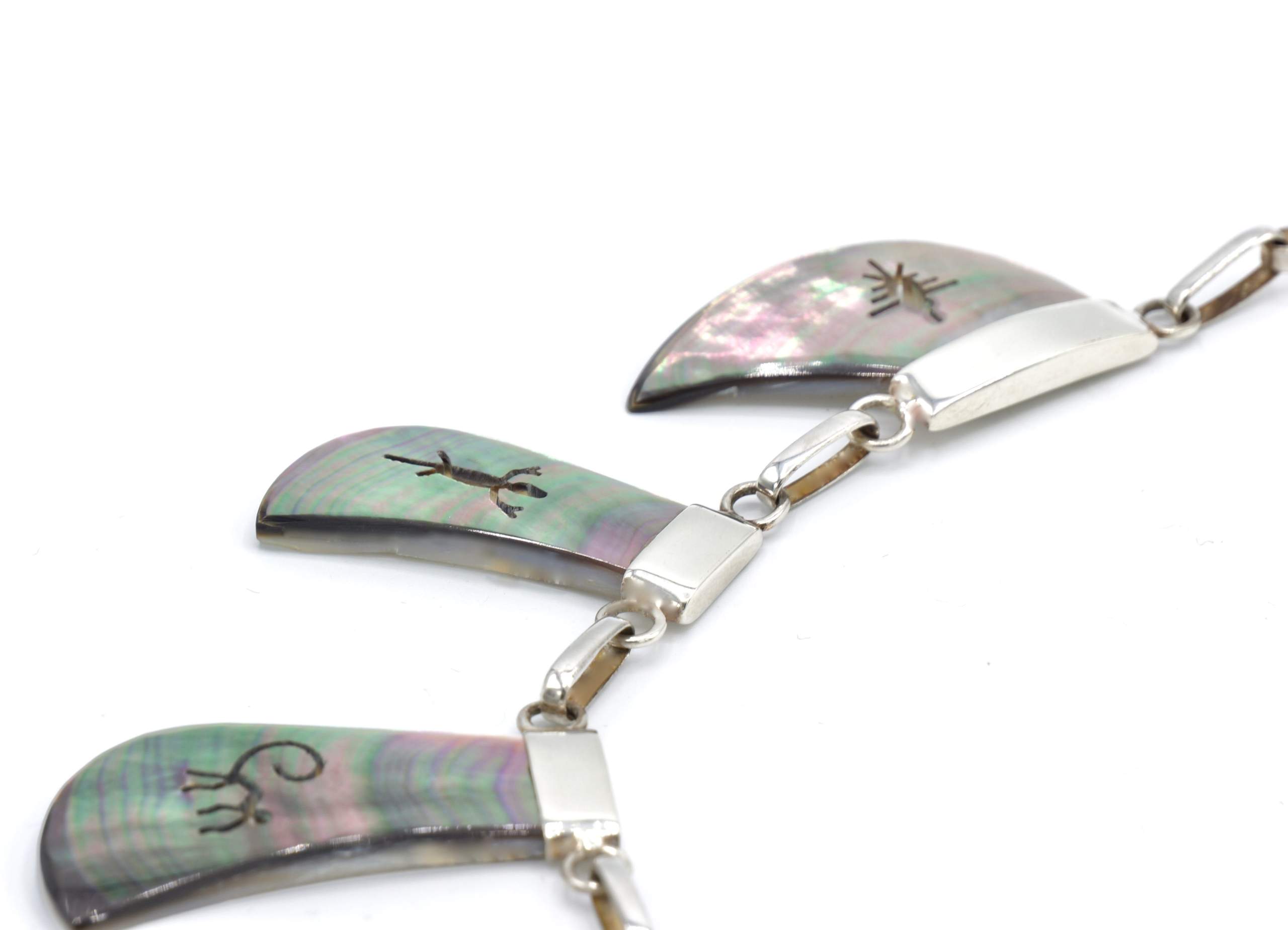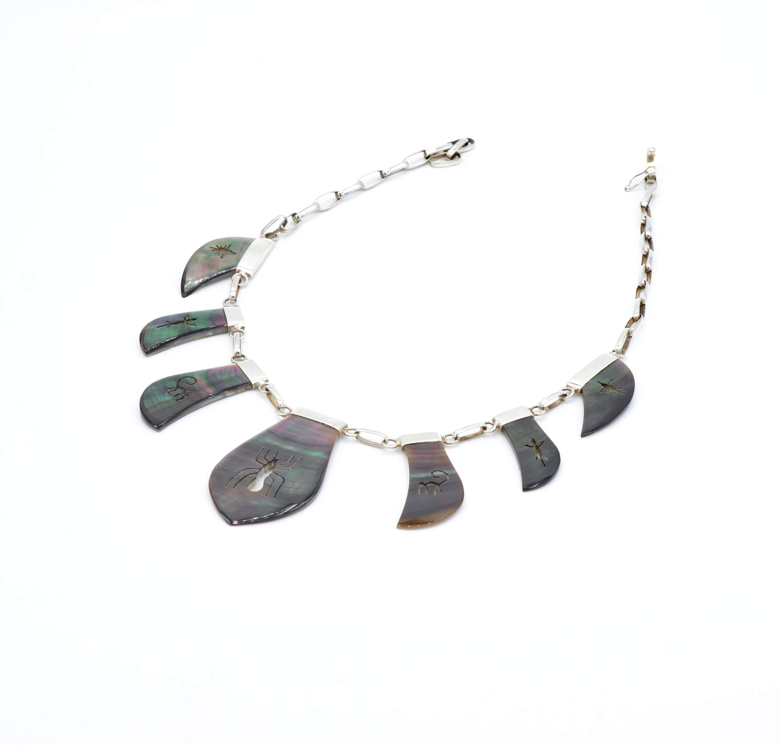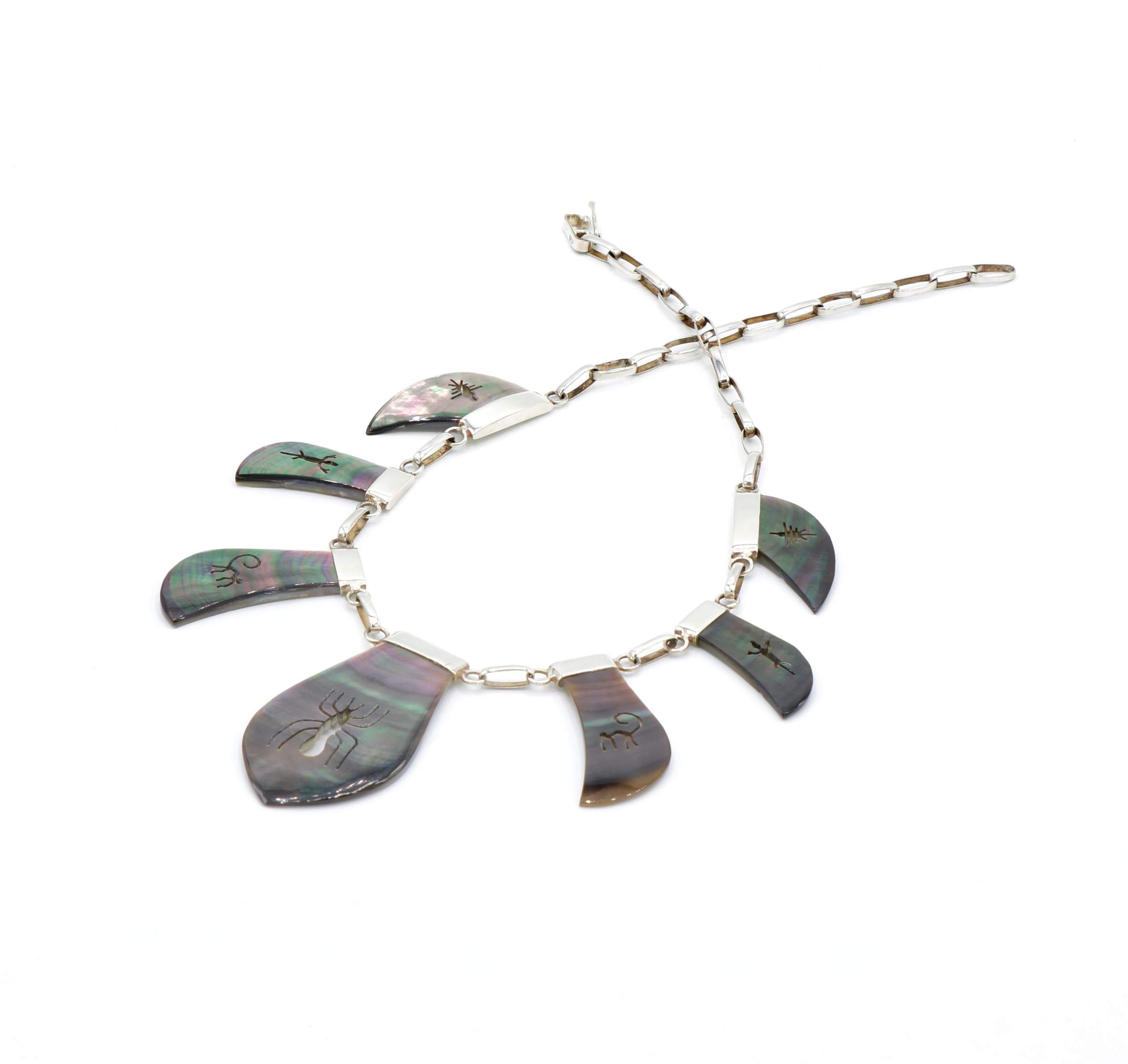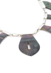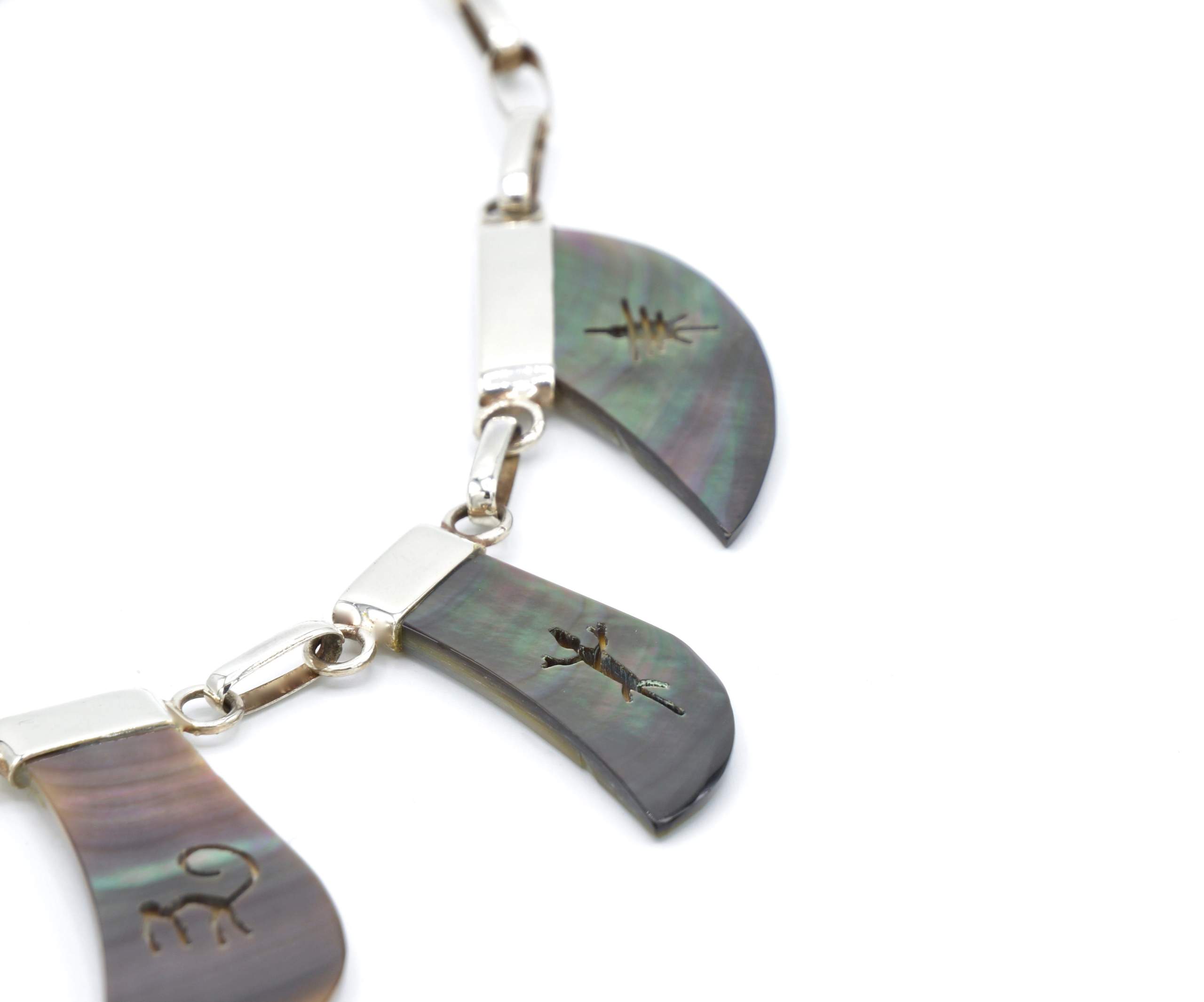 - Fijn gesneden organische grijs parelmoer met ingesneden Nazca geogliefen