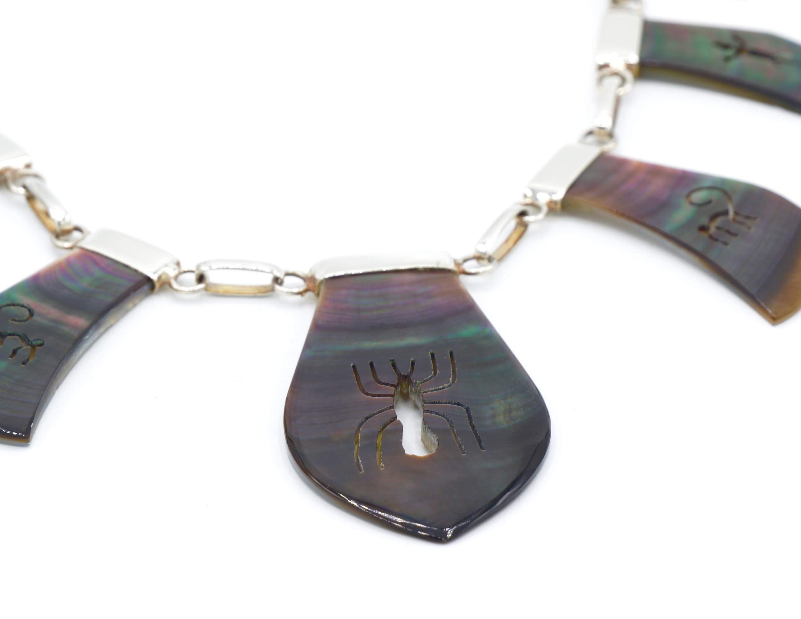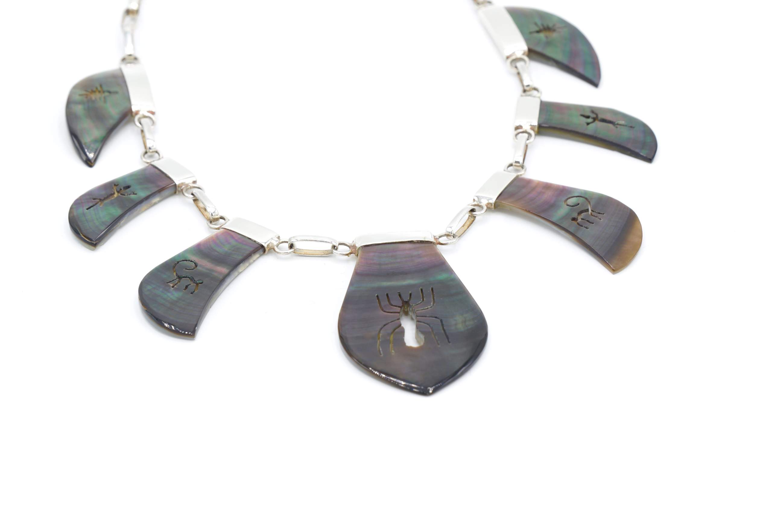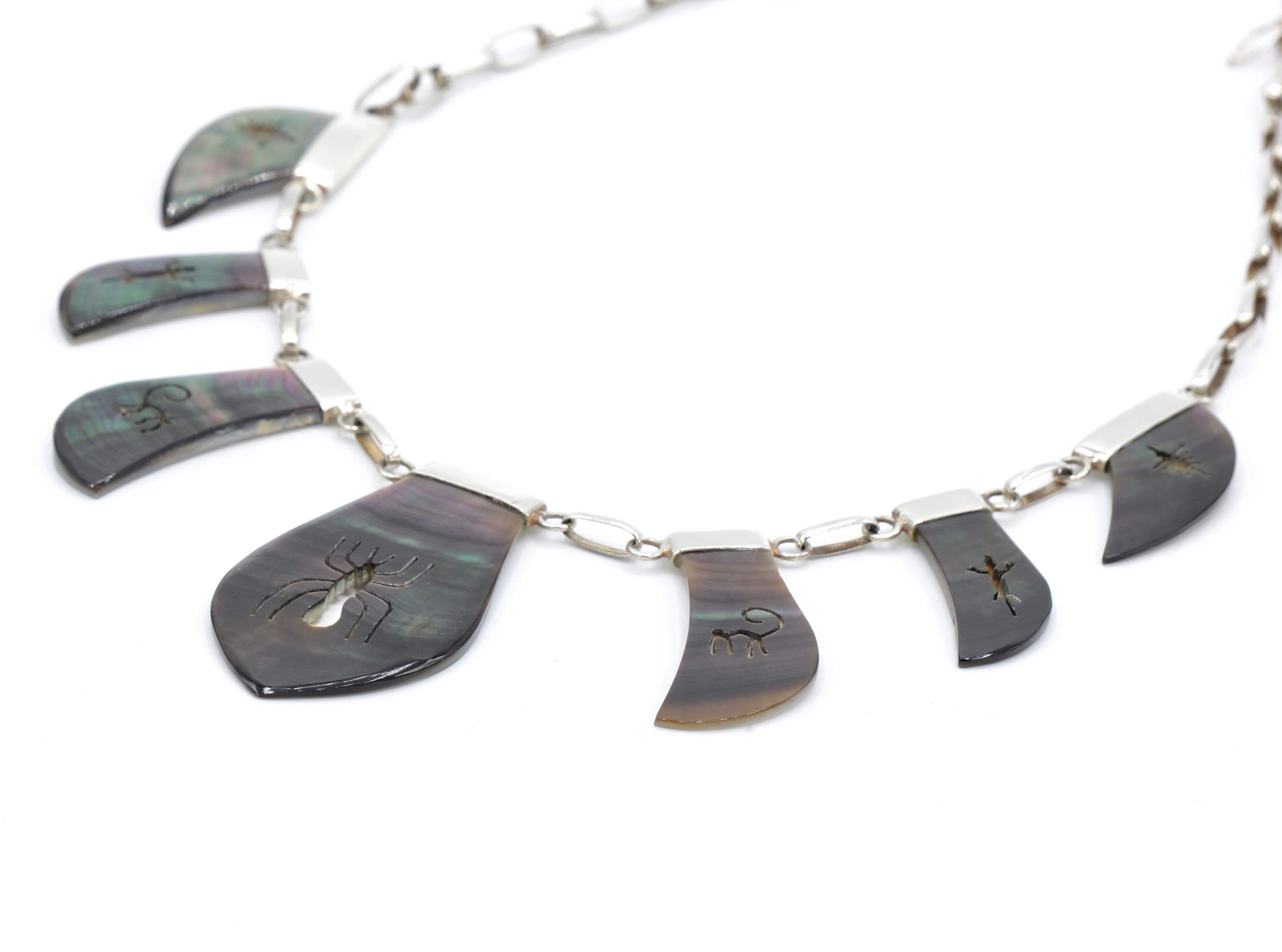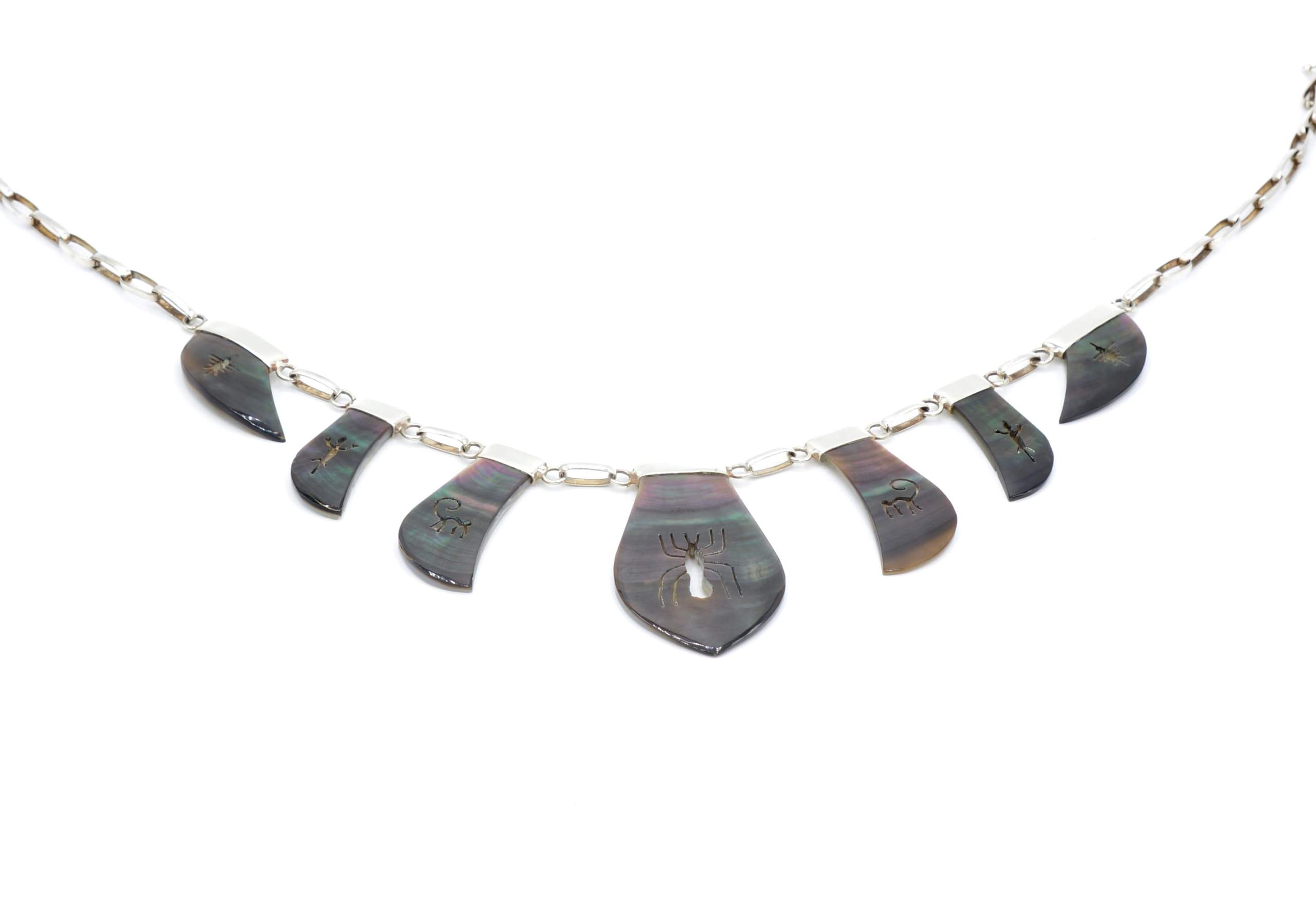 - Fijn gesneden organische grijs parelmoer met ingesneden Nazca geogliefen