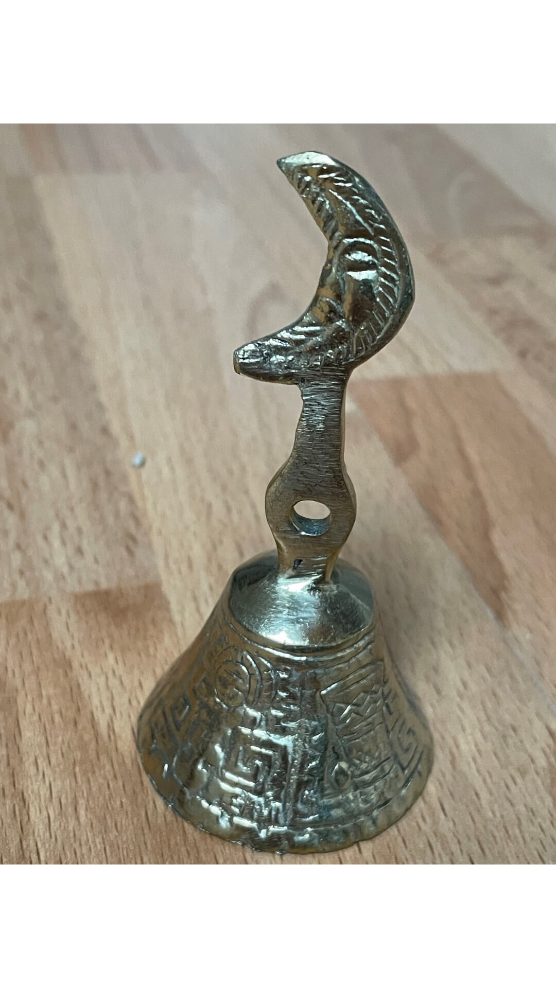 Het handvat heeft de afbeelding van een maan. Mooi te combineren als set met het peruaanse belletje Zon.