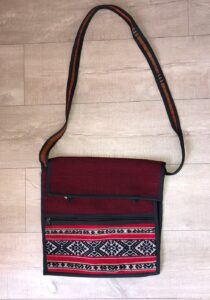 Prachtige originele sPeruaanse schoudertas Pacha mama uit Peru met patronen en een oranje lint.