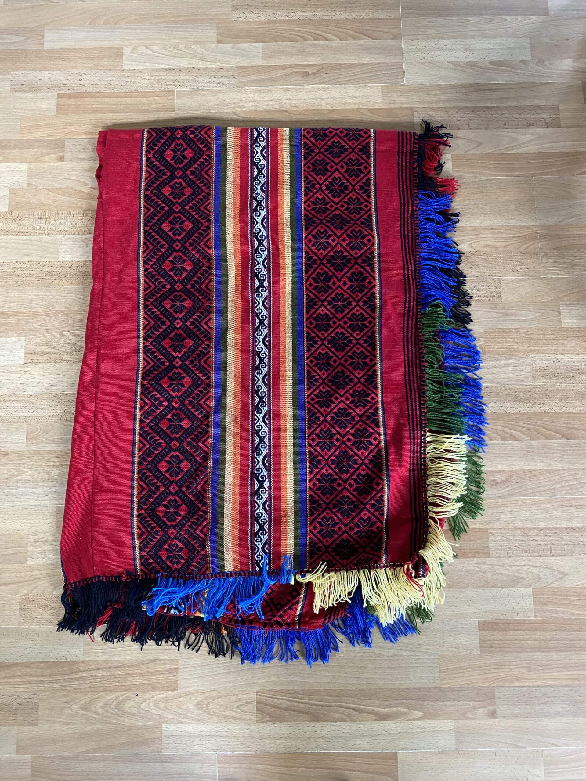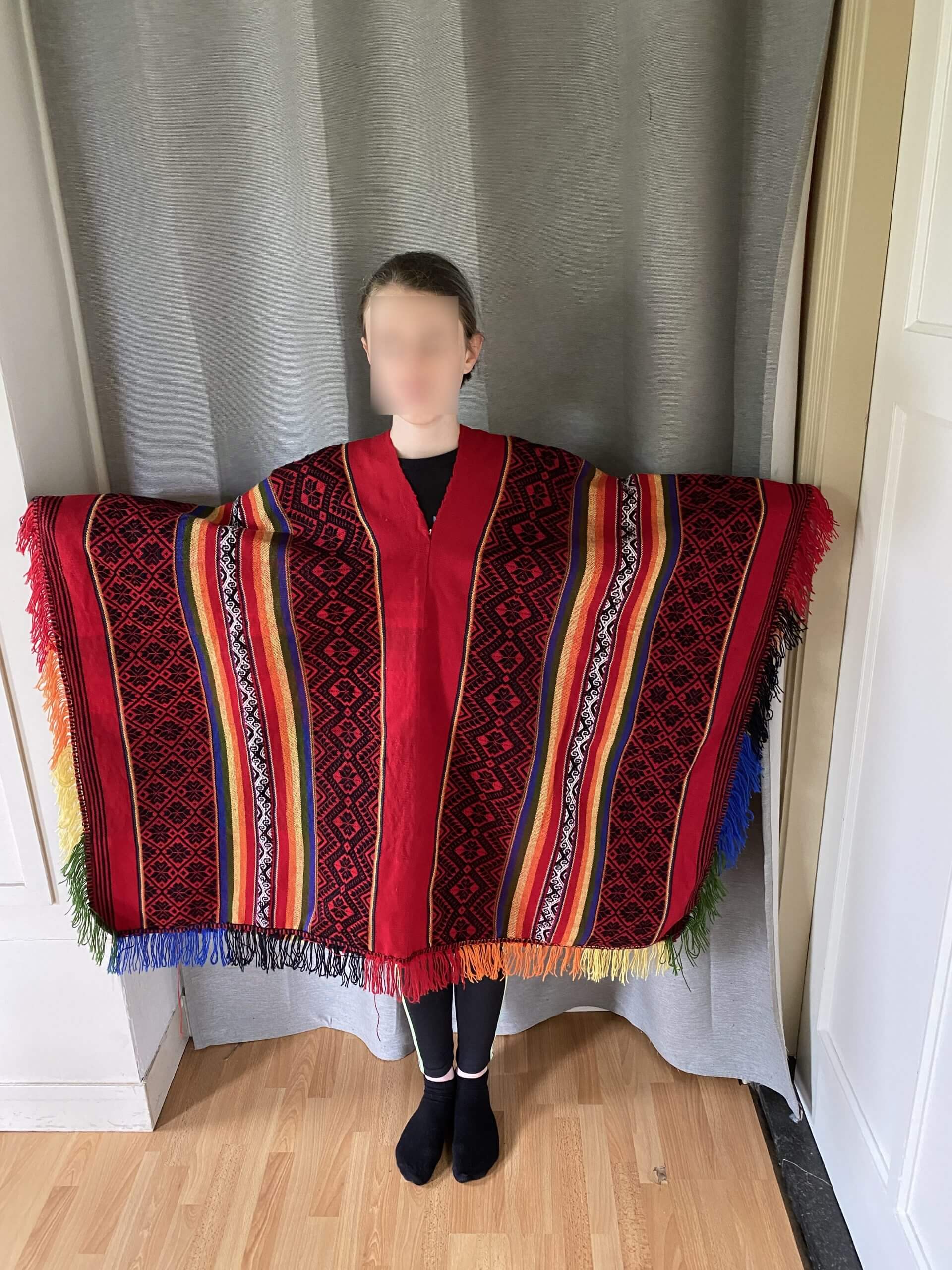 Een prachtige traditionele veelkleurige dames poncho met kleurige strepen en patronen om te dragen tijdens Sjamanistische rituelen.