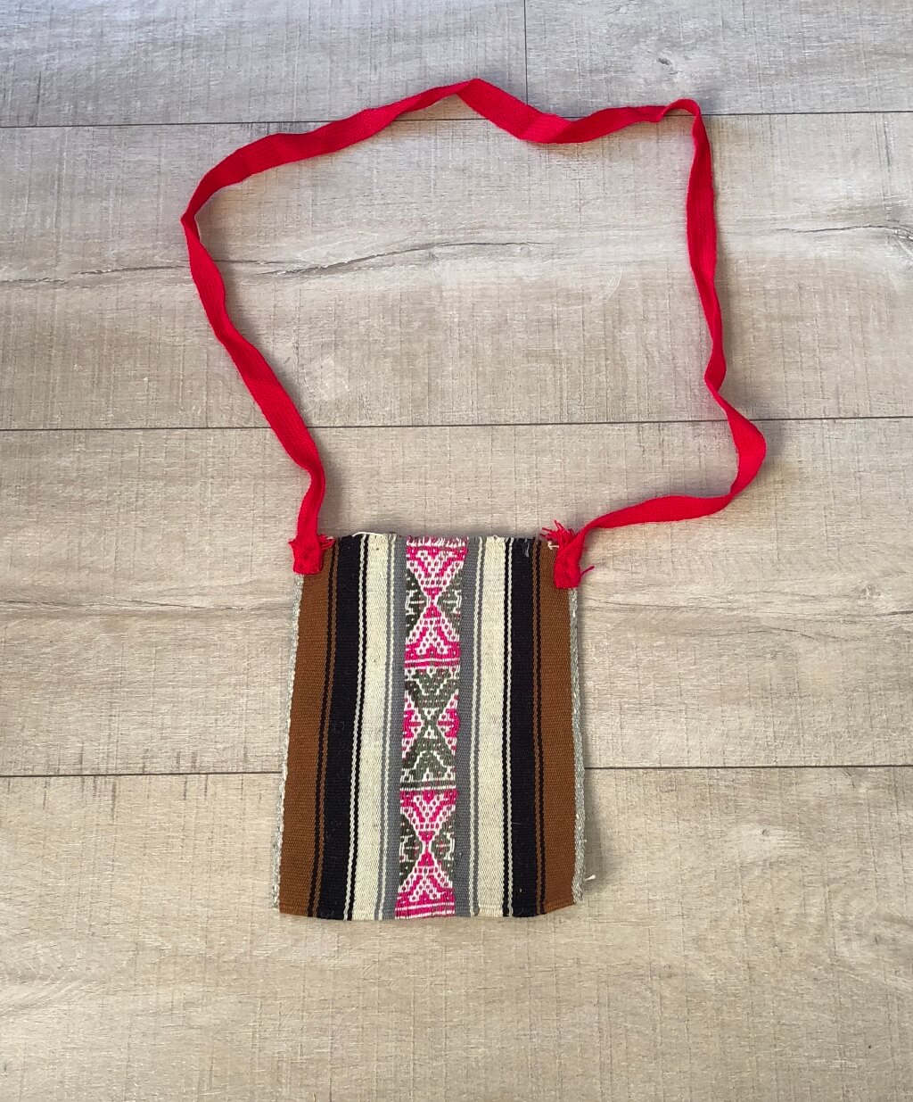 Een traditionele Q’ero Chuspa small met rood lint en met de hand geweven in Peru.