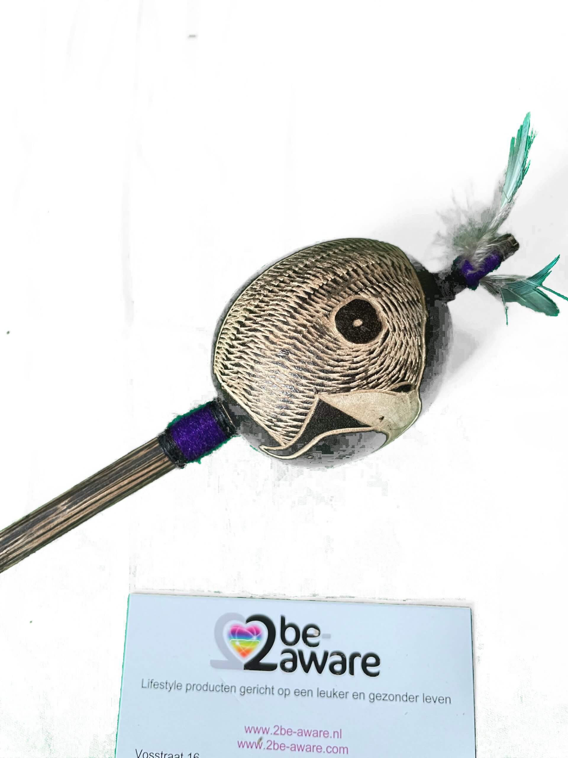 Elke ratel heeft zijn/haar eigen geluid, geen enkele ratel klinkt hetzelfde. Afgewerkt met katoenen draad van verschillende kleuren en veren van vogels uit de Amazone. Elke ratel is uniek en de beelden kunnen enigszins variëren.