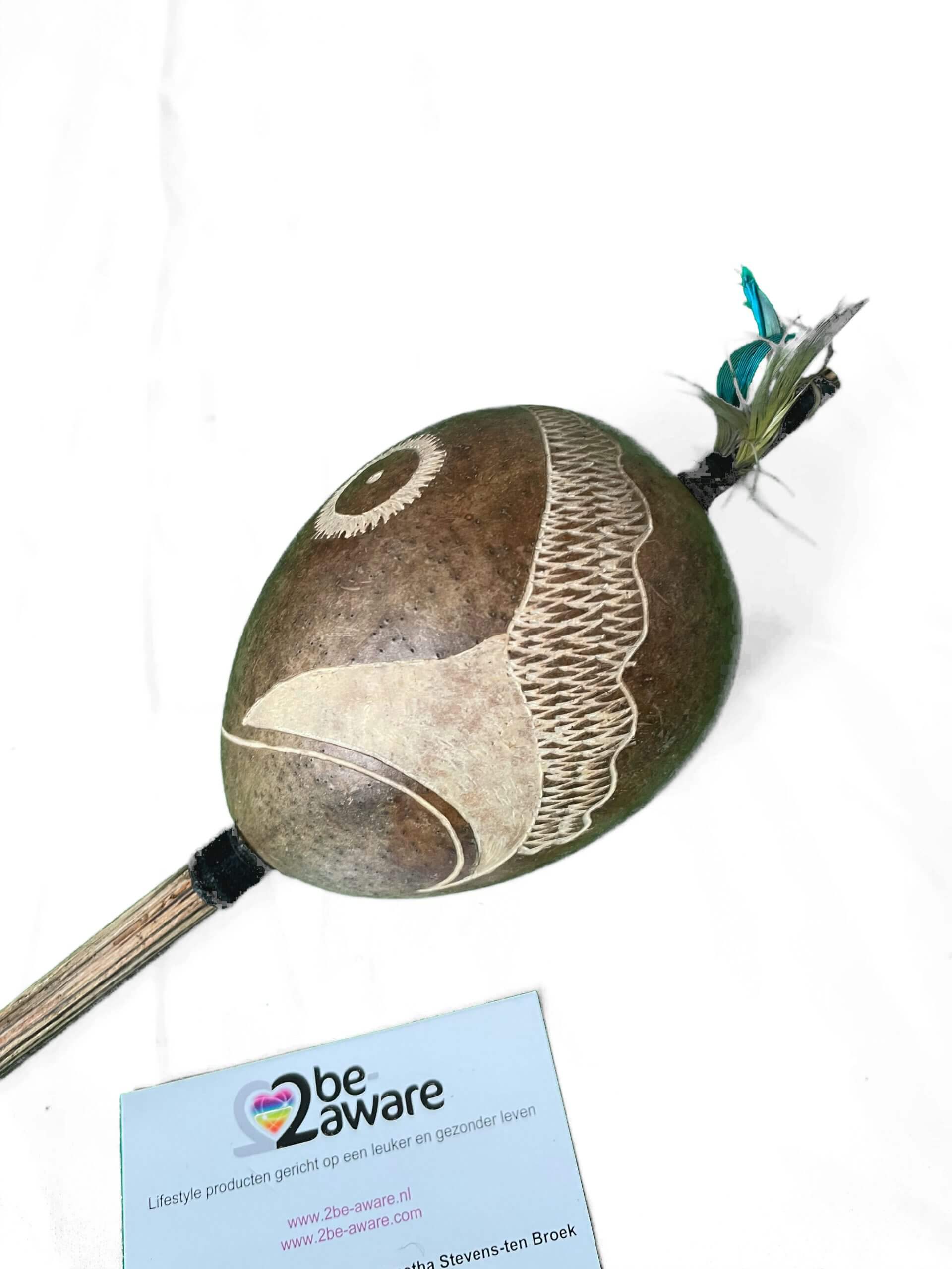 Elke ratel heeft zijn/haar eigen geluid, geen enkele ratel klinkt hetzelfde. Afgewerkt met katoenen draad van verschillende kleuren en veren van vogels uit de Amazone. Elke ratel is uniek en de beelden kunnen enigszins variëren.