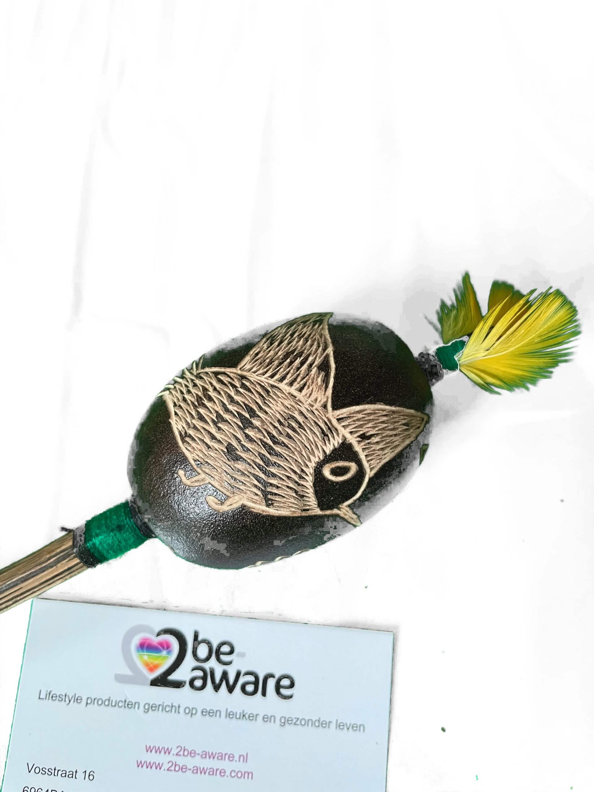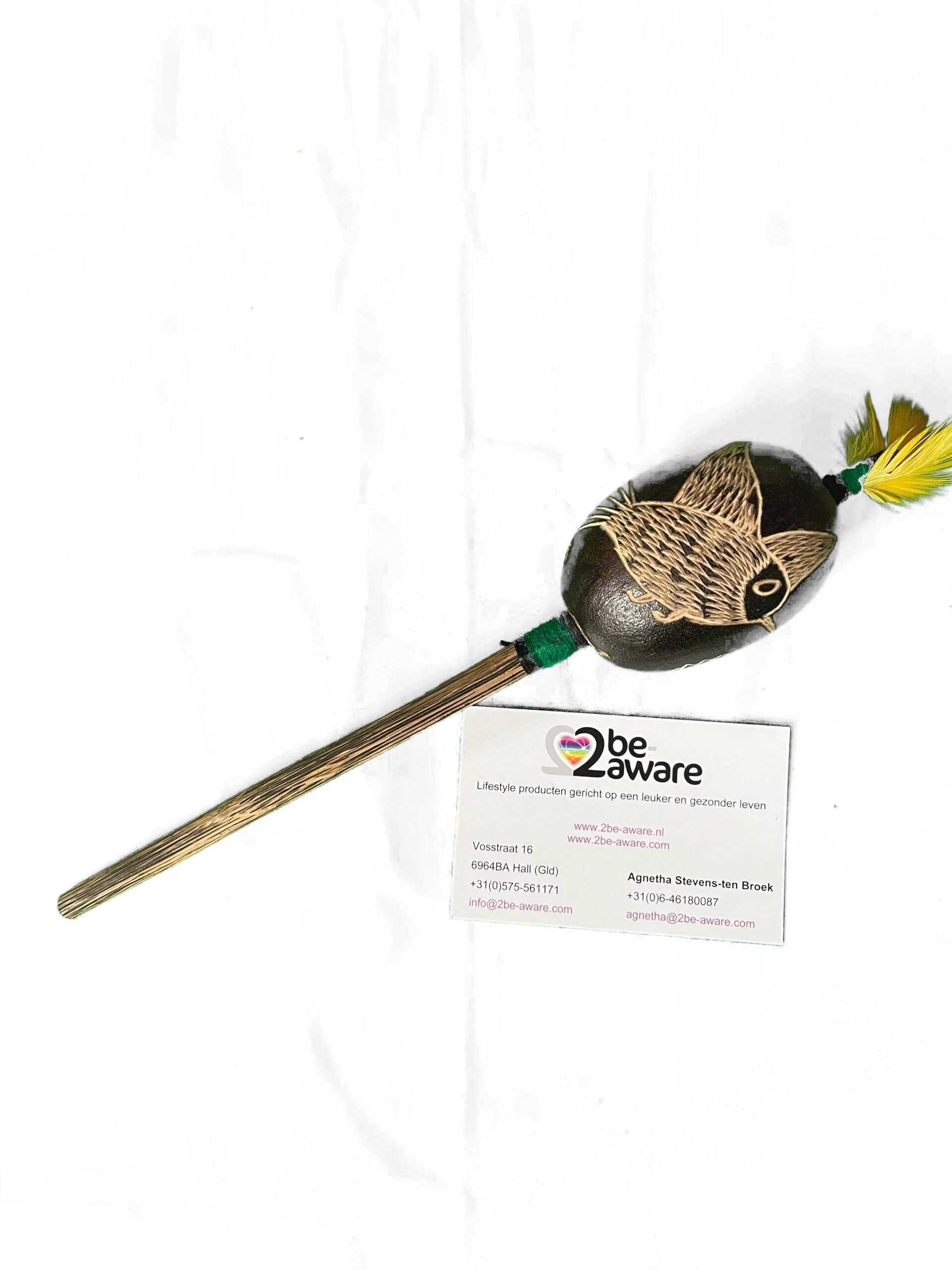 Elke ratel heeft zijn/haar eigen geluid, geen enkele ratel klinkt hetzelfde. Afgewerkt met katoenen draad van verschillende kleuren en veren van vogels uit de Amazone. Elke ratel is uniek en de beelden kunnen enigszins variëren.