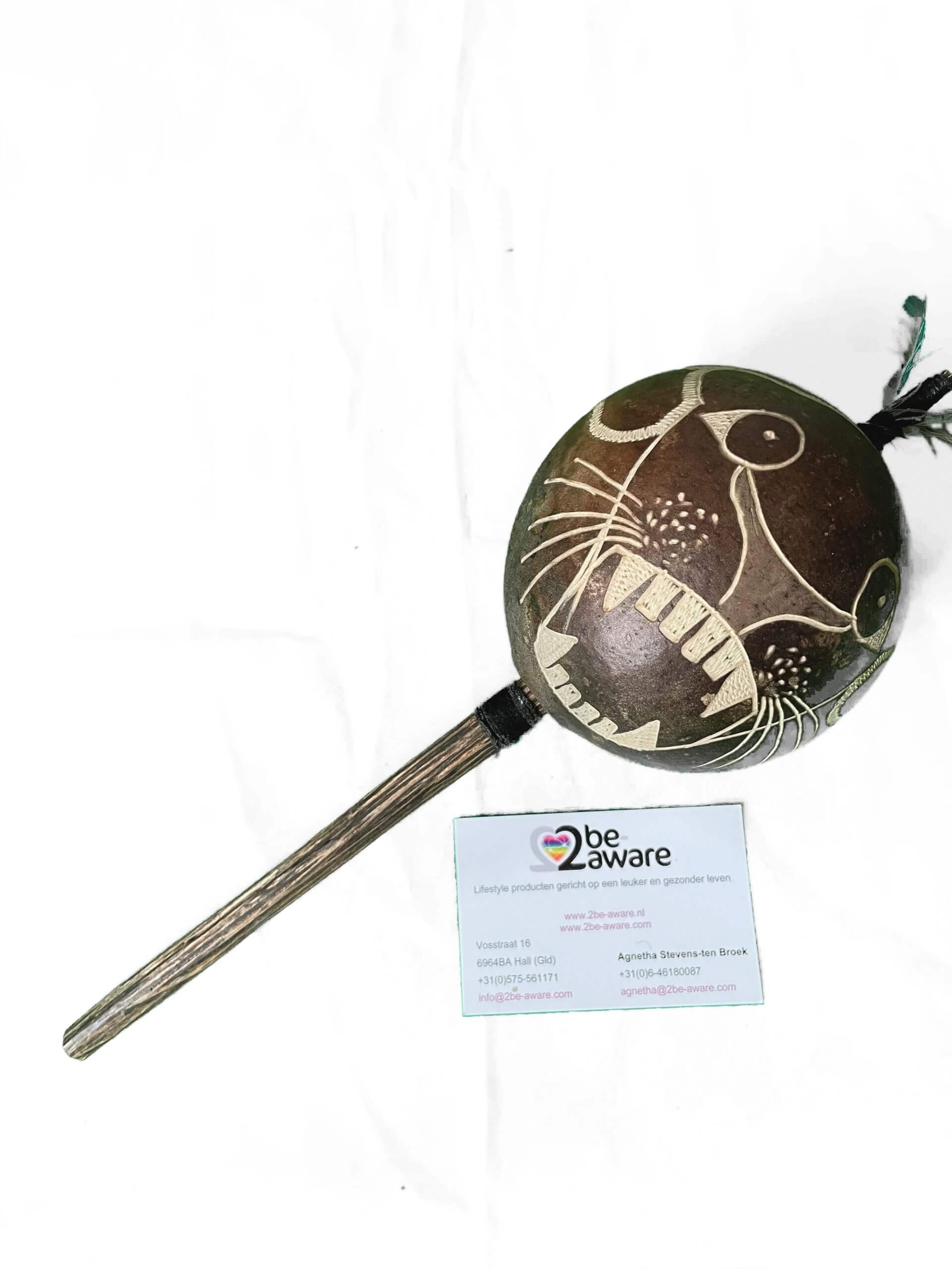 Ceremoniële ratel, welke handgemaakt is in de Peruaanse Amazone.