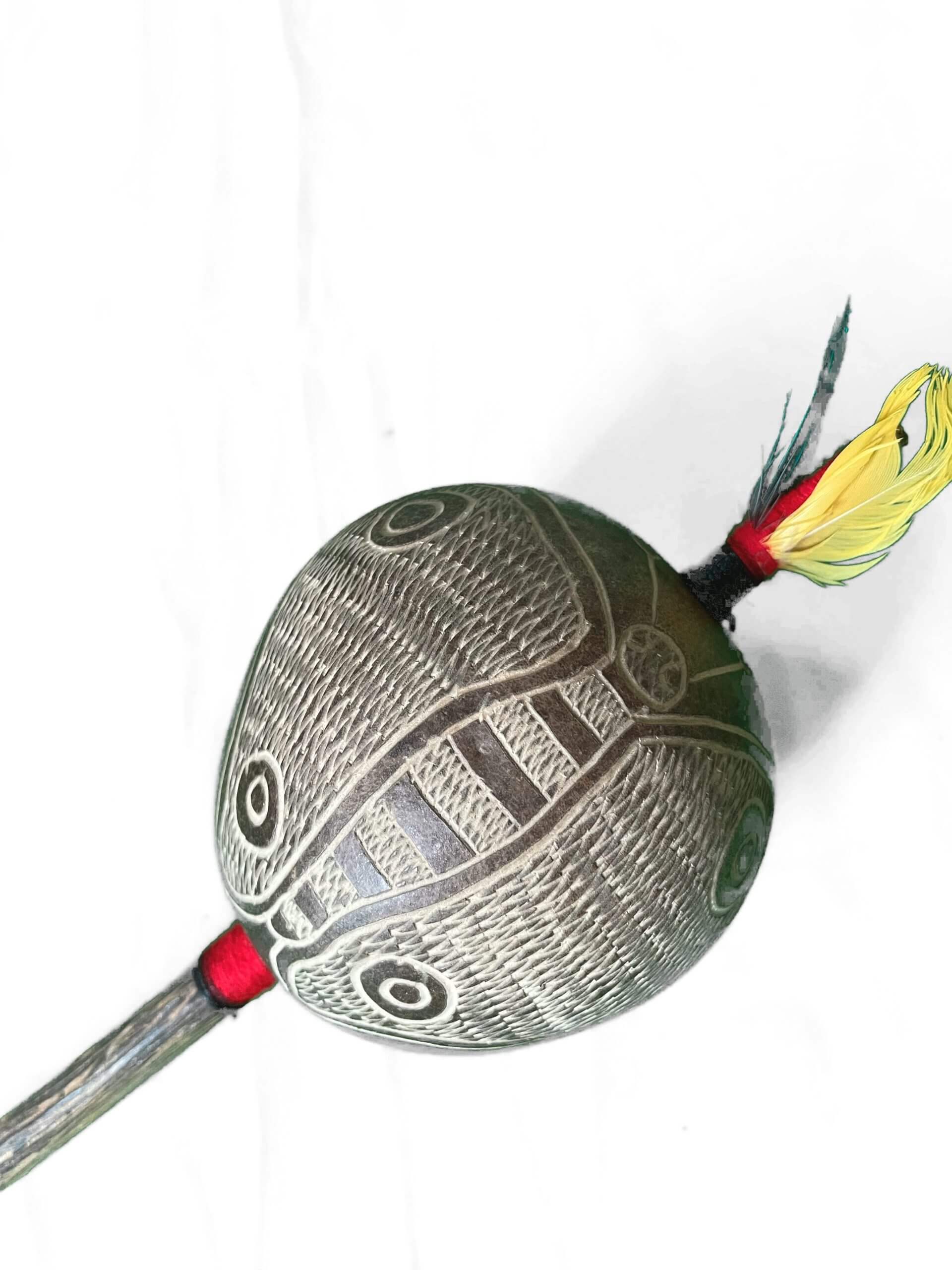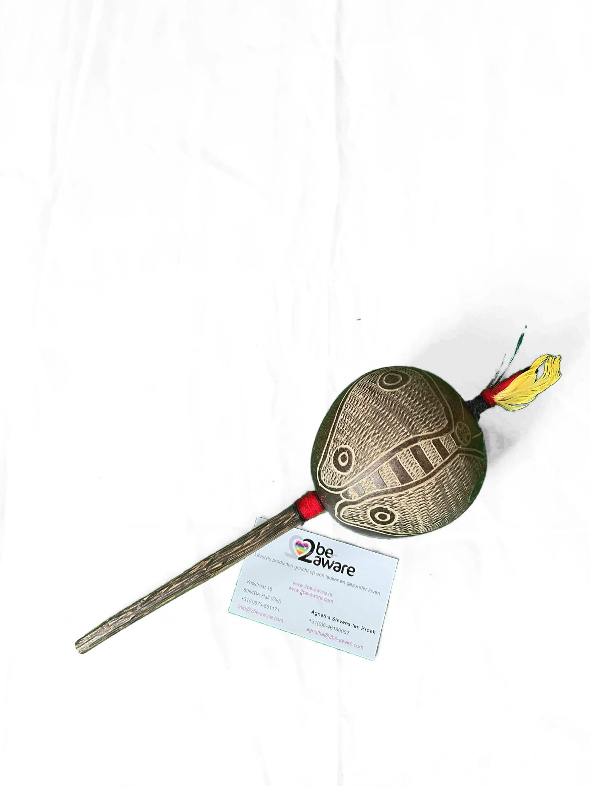 Elke ratel heeft zijn/haar eigen geluid, geen enkele ratel klinkt hetzelfde. Afgewerkt met katoenen draad van verschillende kleuren en veren van vogels uit de Amazone. Elke ratel is uniek en de beelden kunnen enigszins variëren.