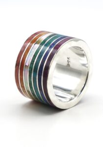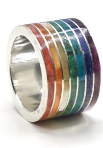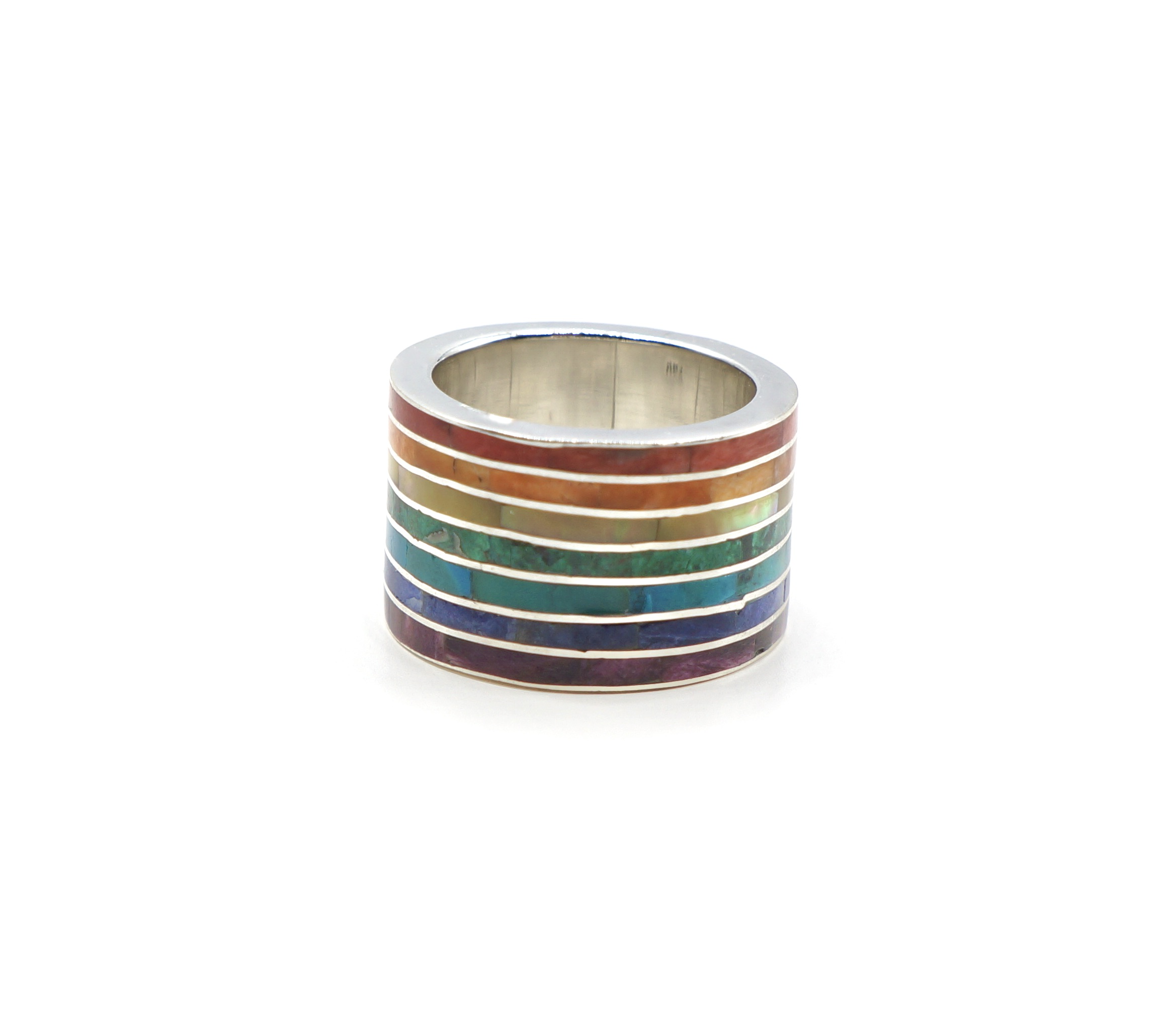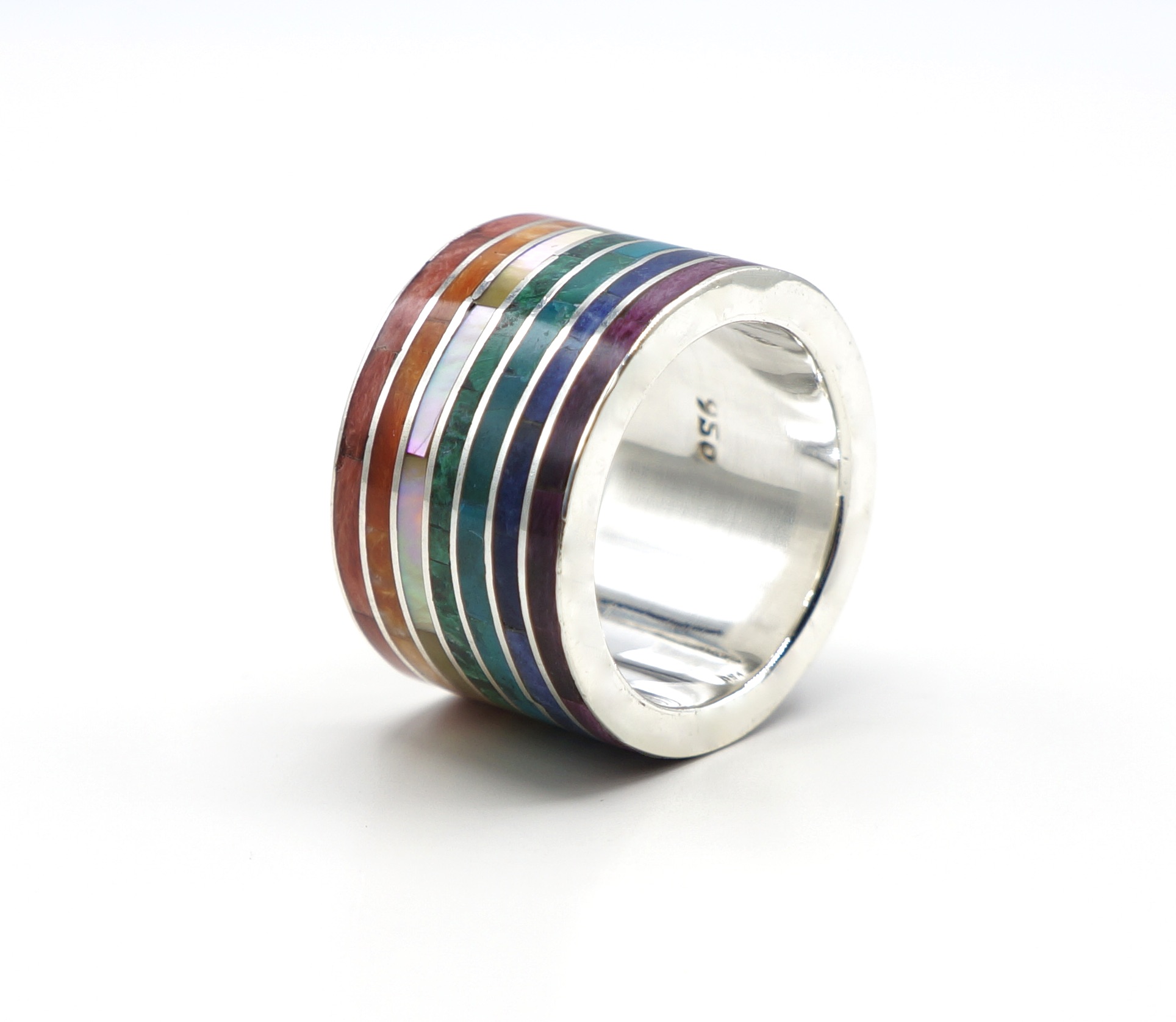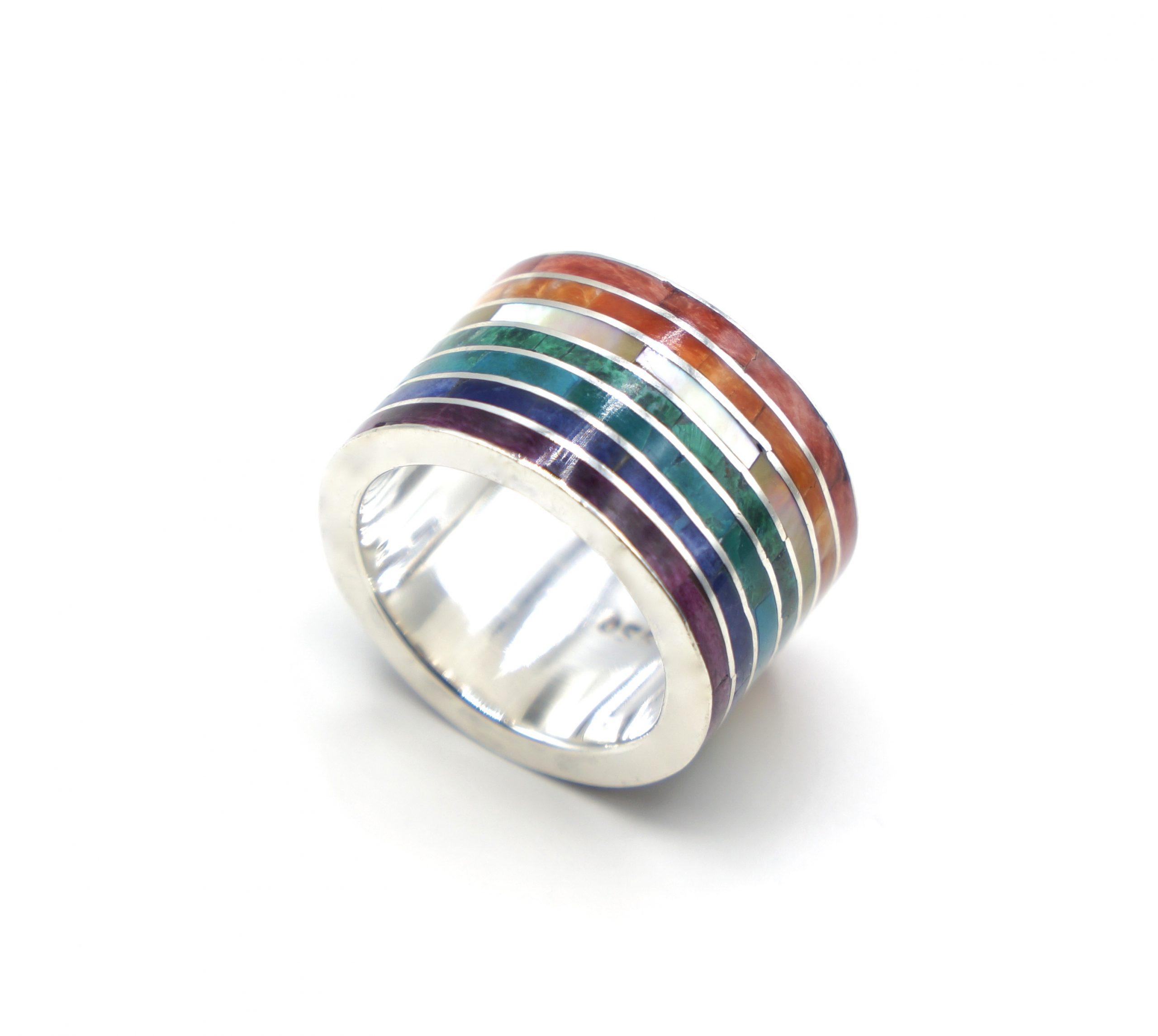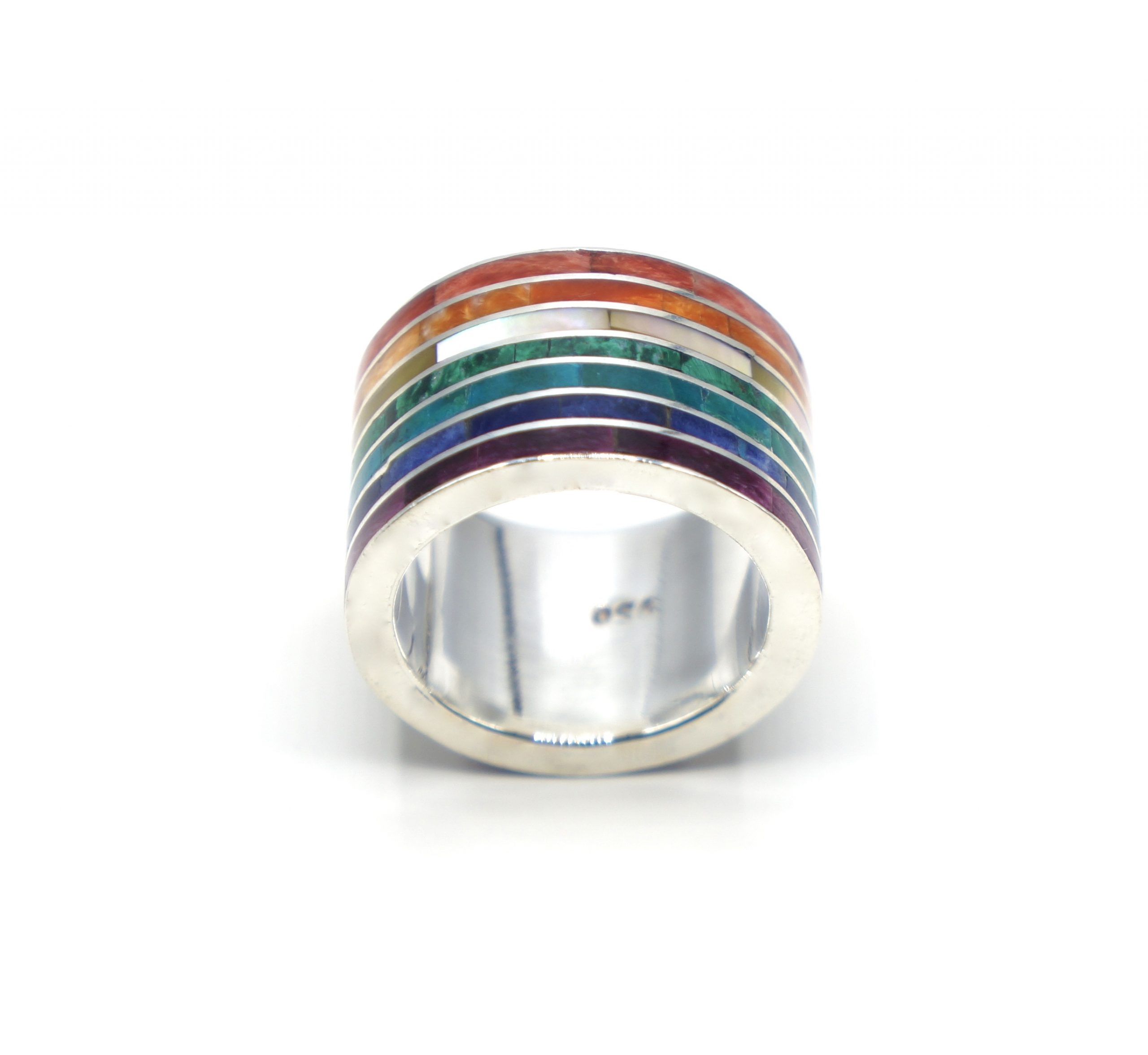 - Luxe zilveren ring ingelegd met prachtige, fijn gesneden Spondylus schelpen, parlemoer, Sodaliet, Abalone en Chrysocolla stenen