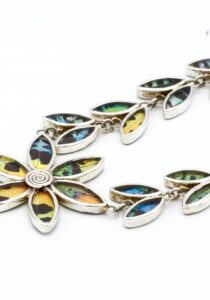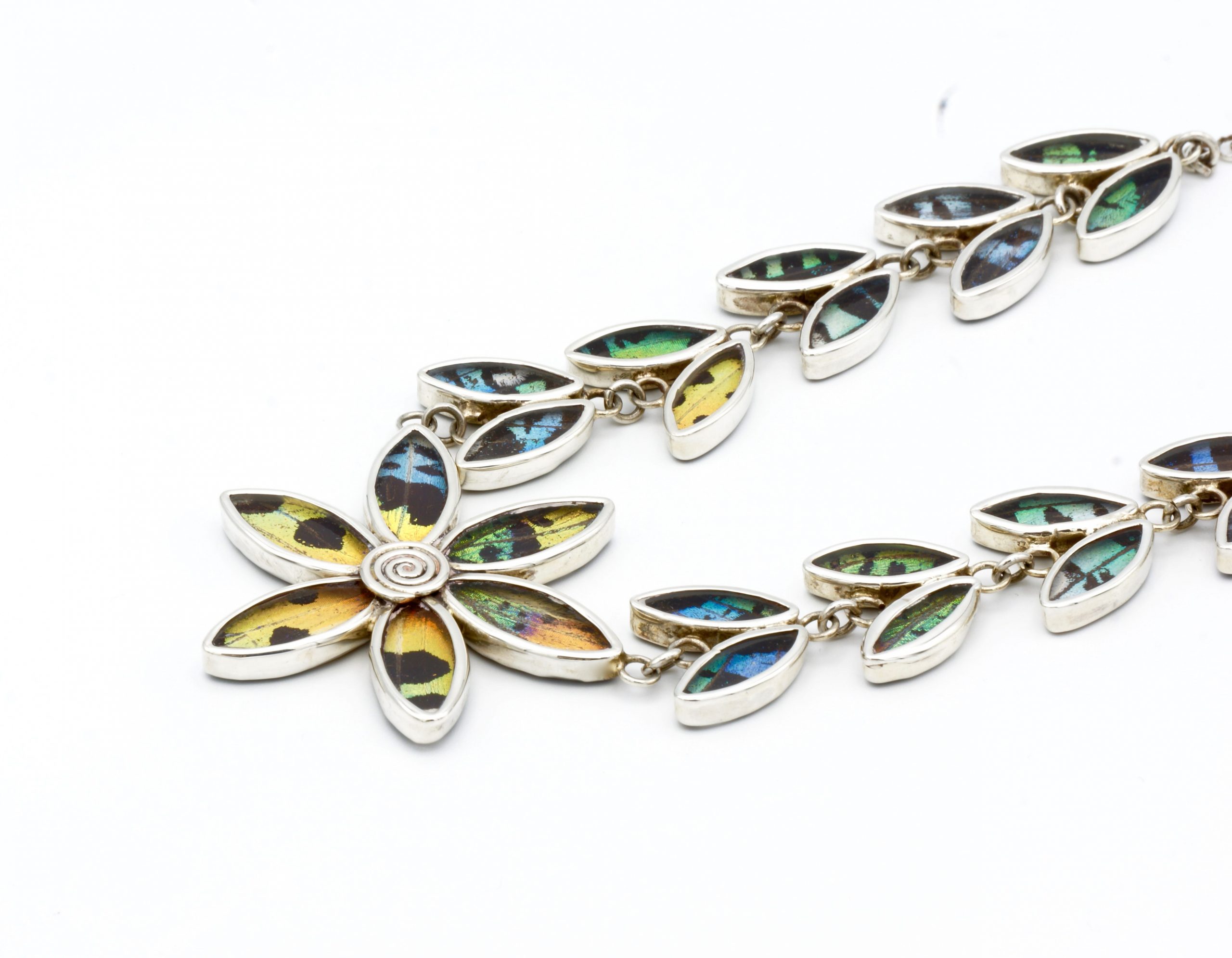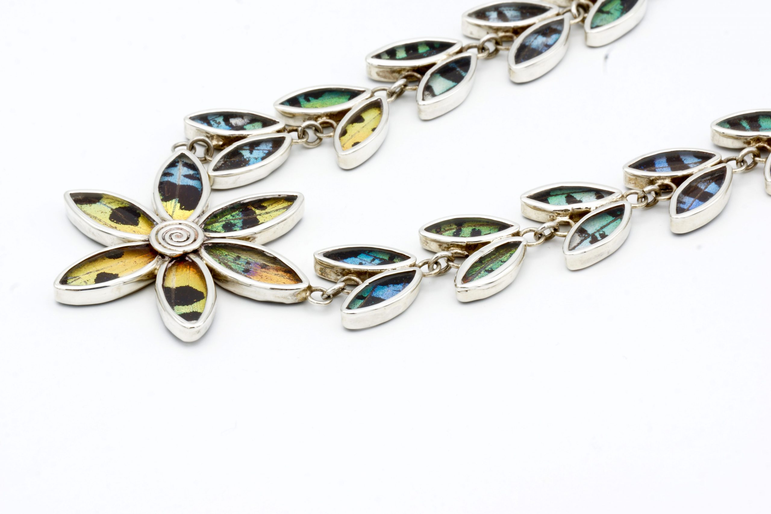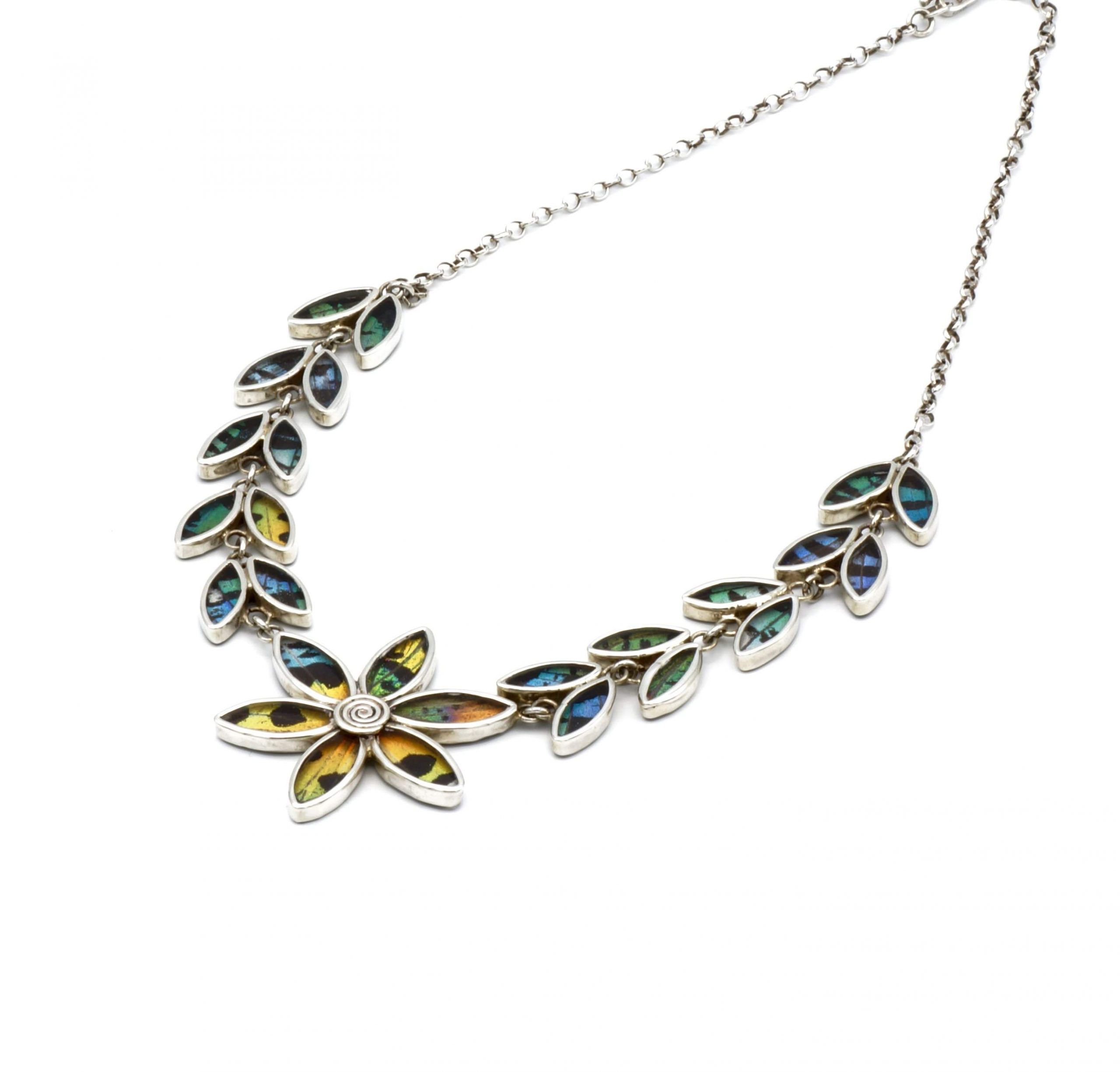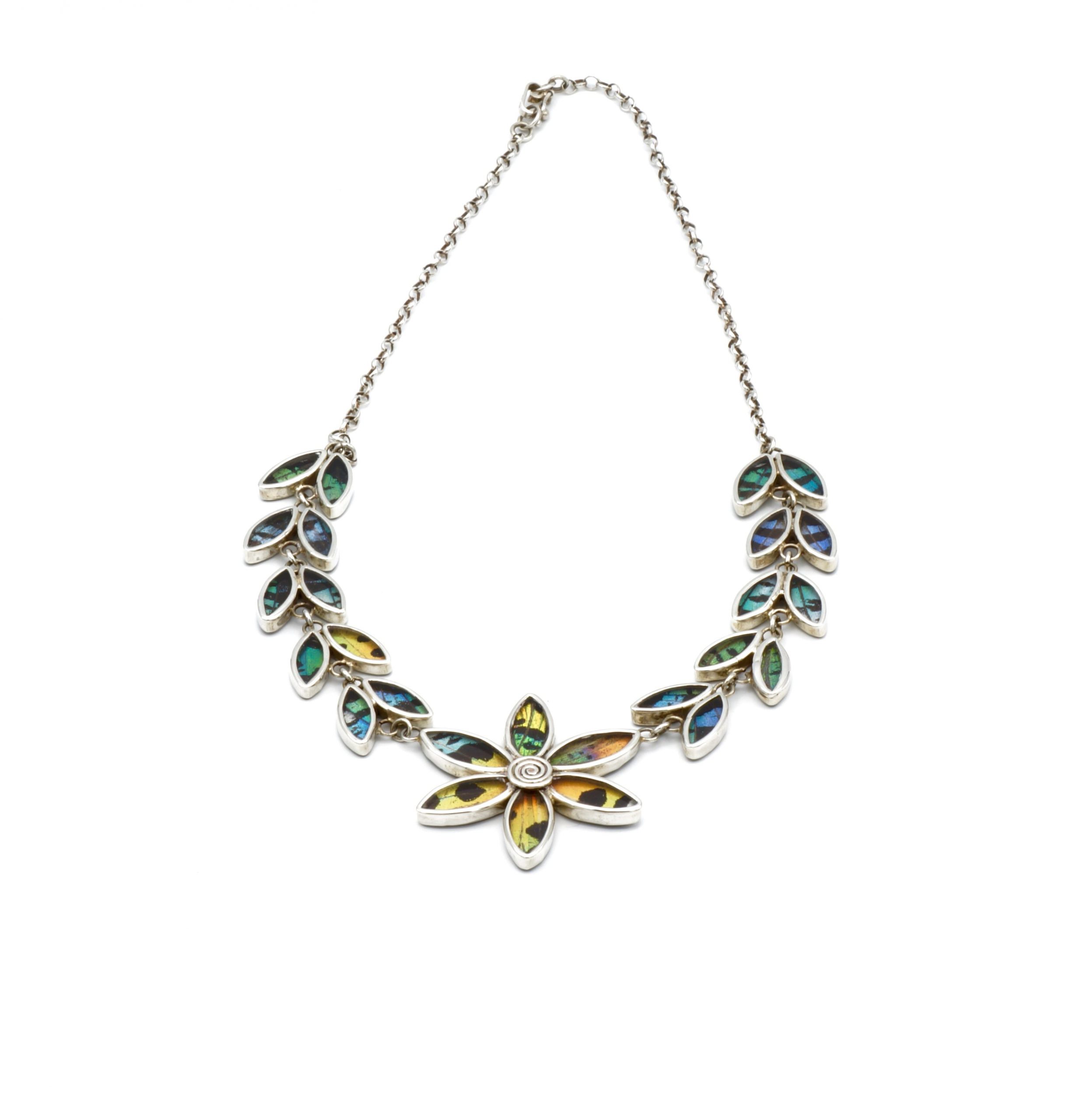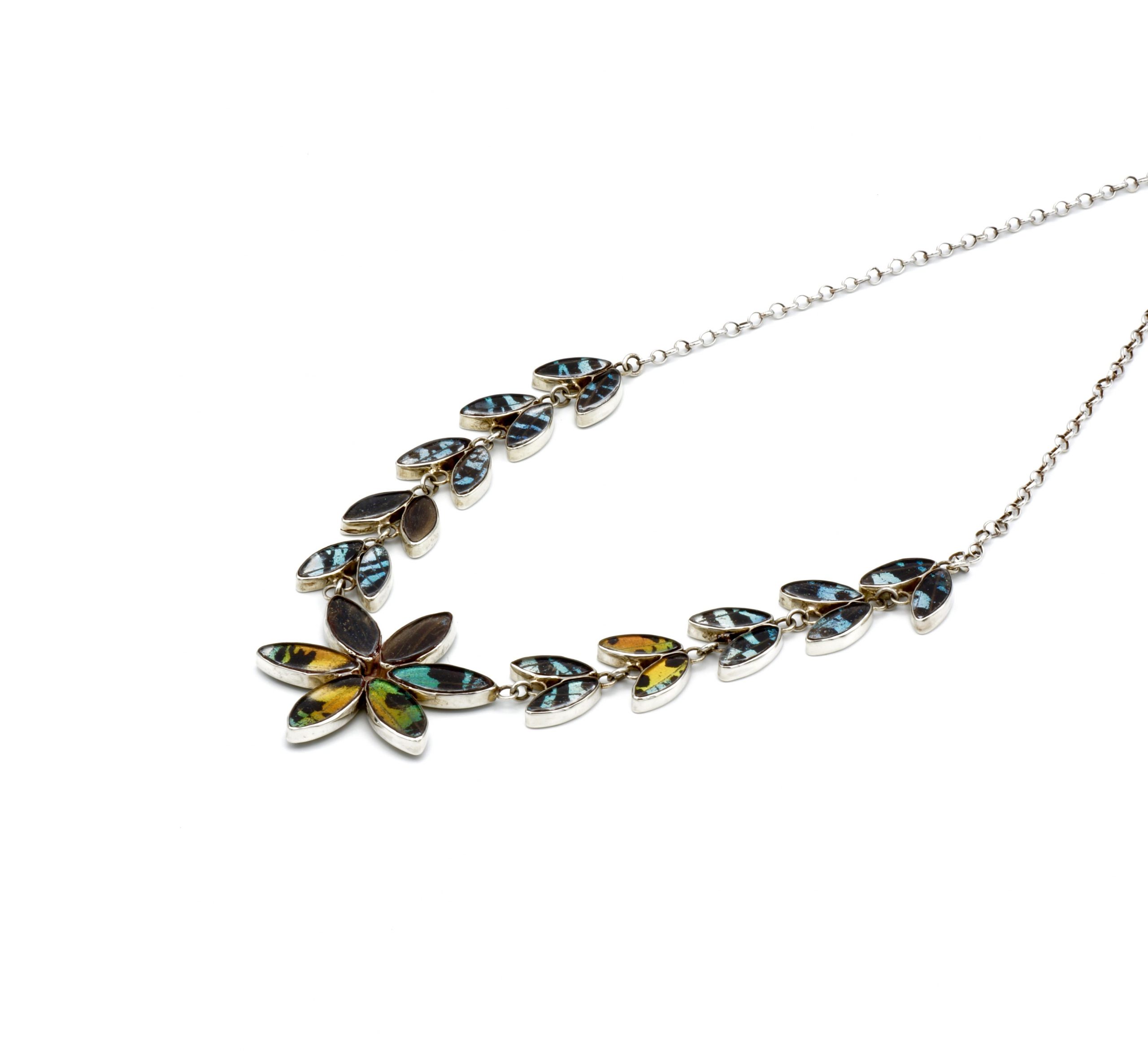 - Luxe zilveren collier ingelegd met de vleugels van de Urania Ripheus vlinder