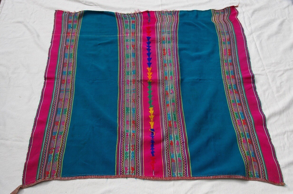 Met de hand geweven alpacawollen manta uit een van de bergdorpen in de Andes. Deze manta is geweven in een groene kleur die vrij zeldzaam is in de Andes.